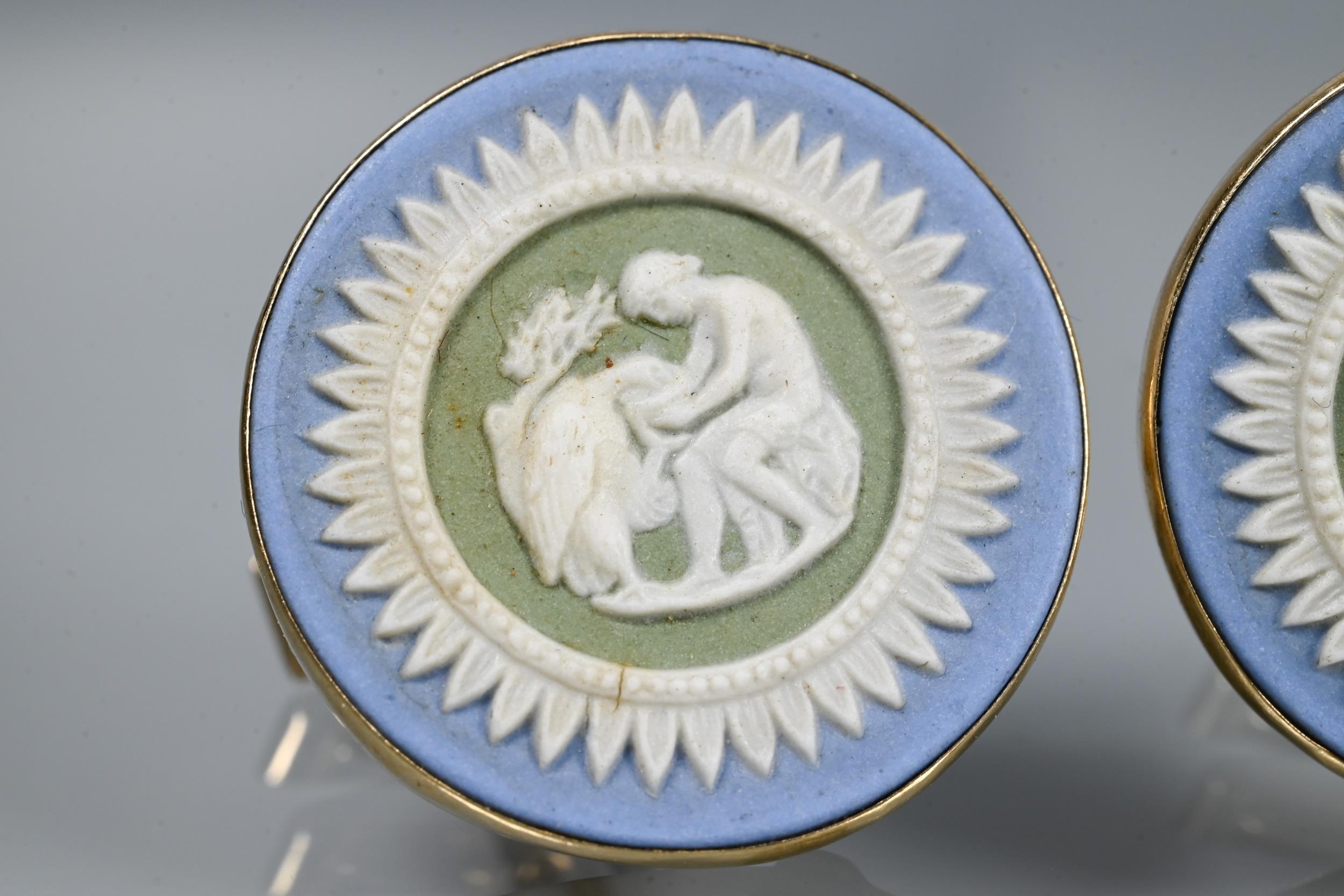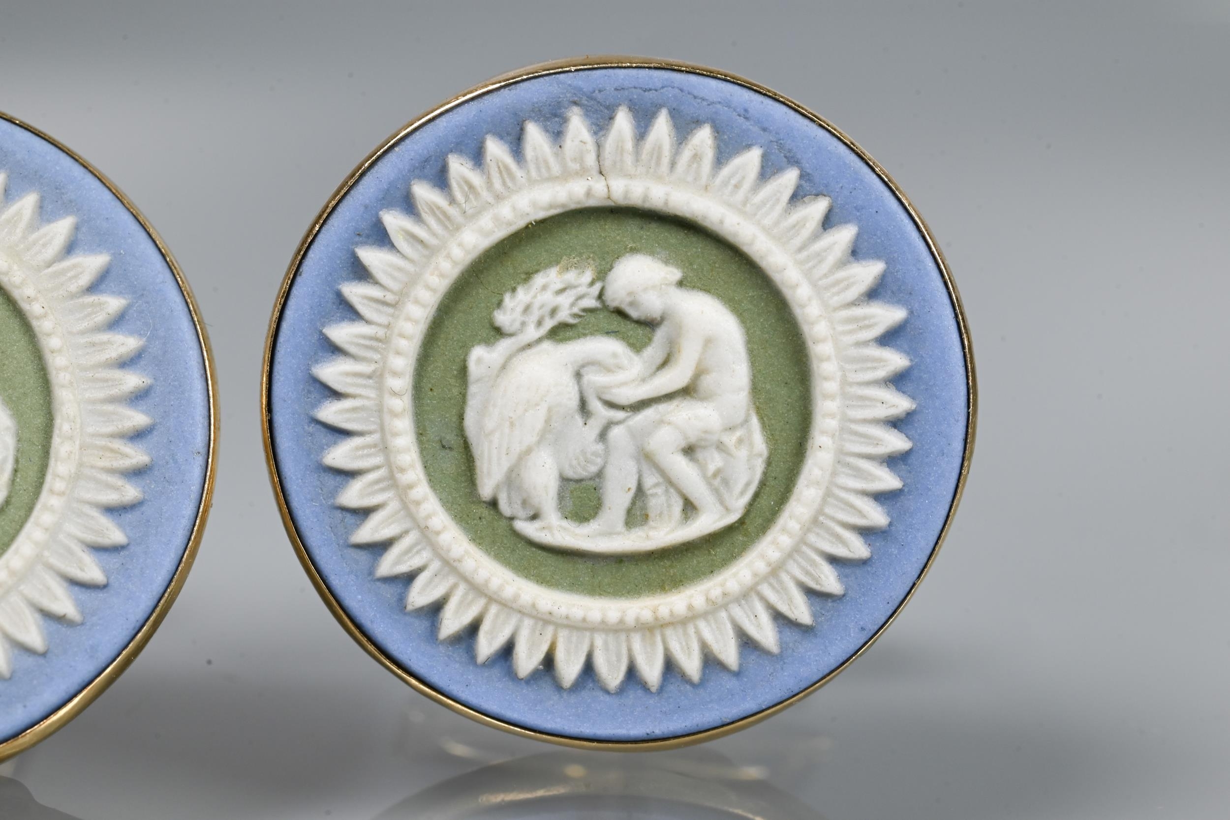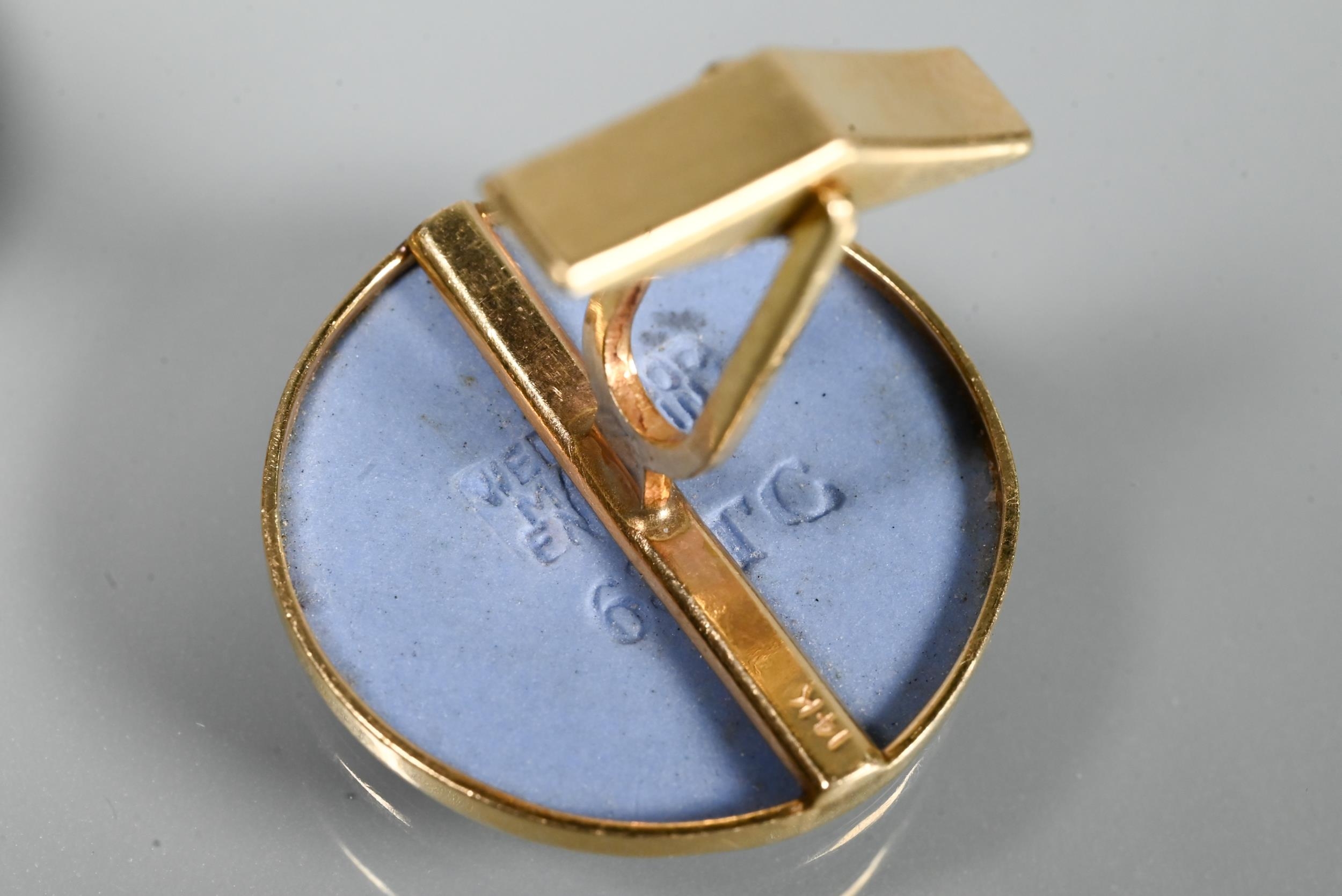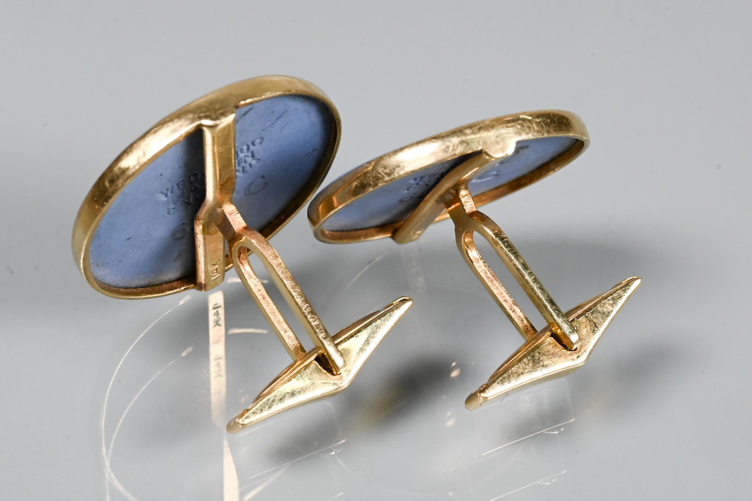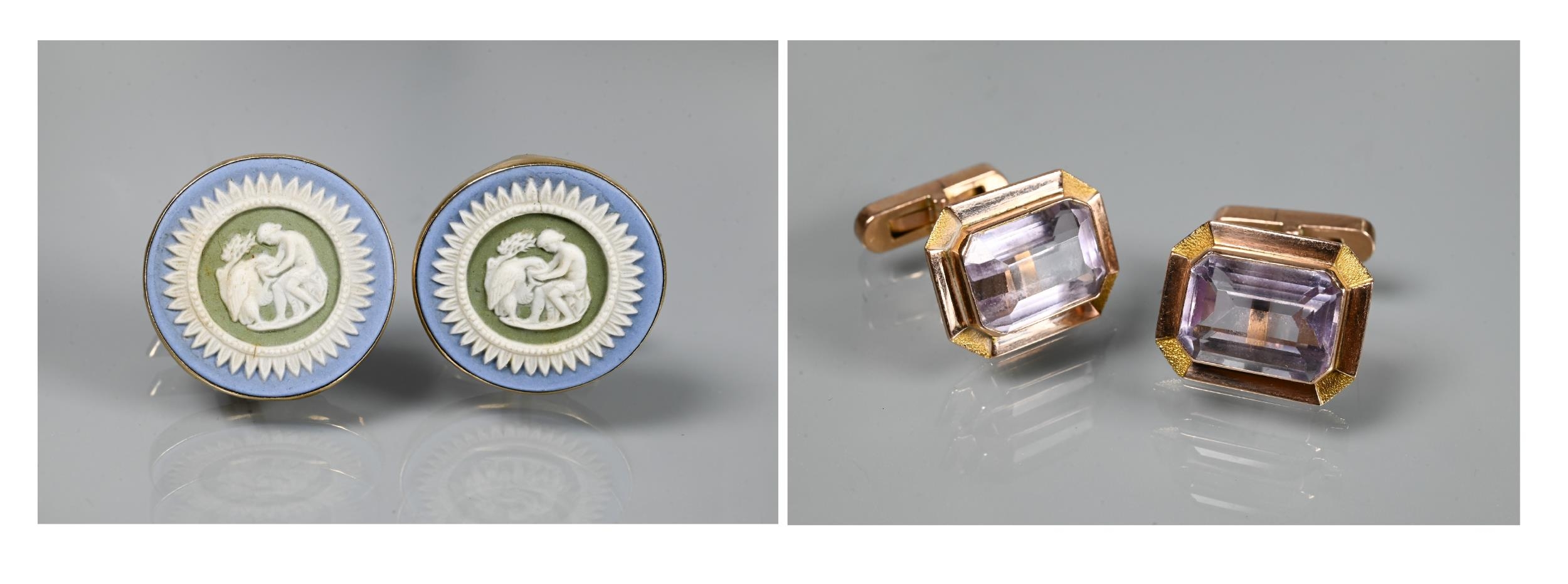 Two pairs of cufflinks, one with Wedgwood jasperware roundels featuring classical vignette, with swivel setting, stamped 14k (a/f); and one pair set pale rectangular stones, stamped 14k (2)
