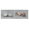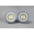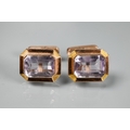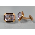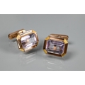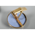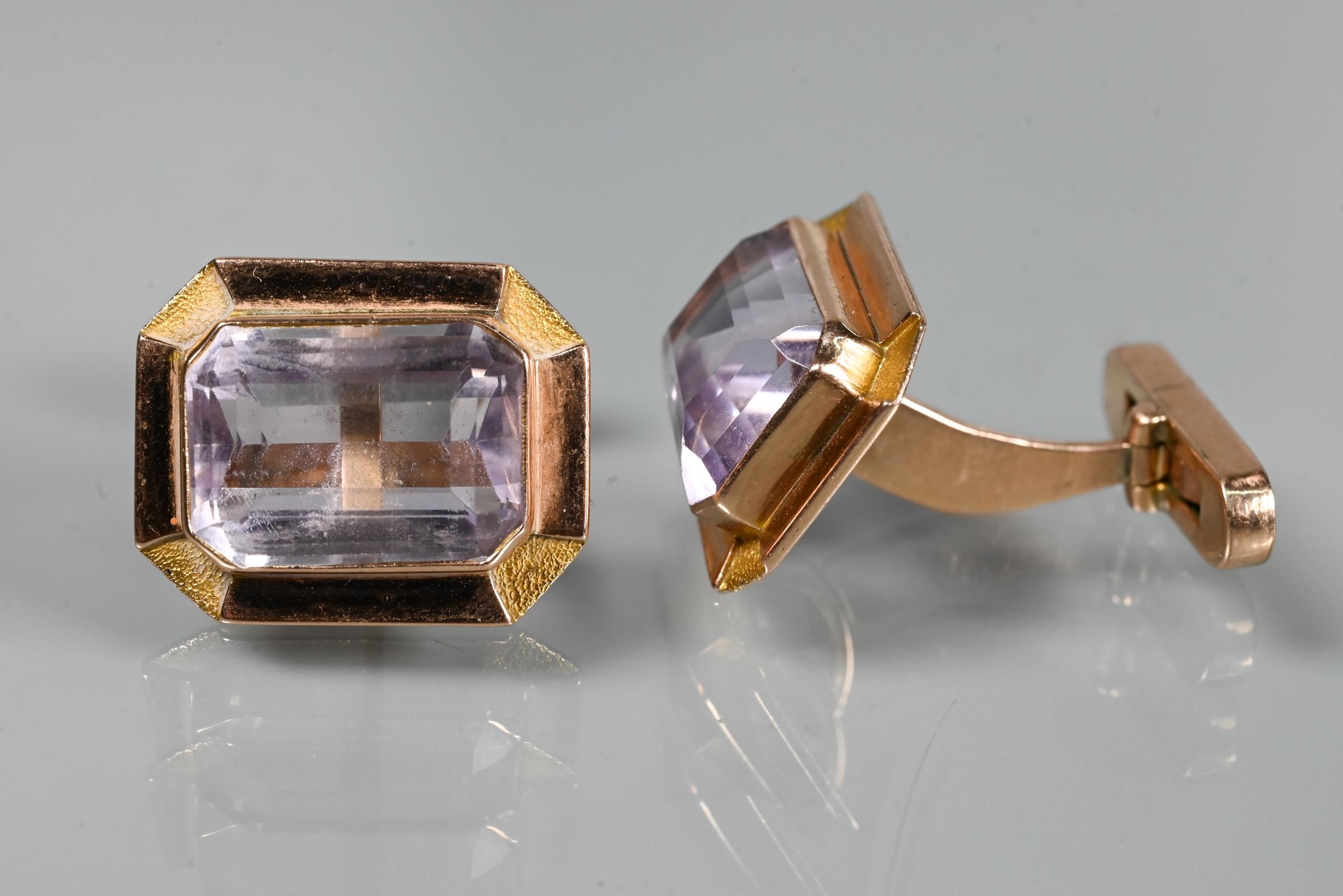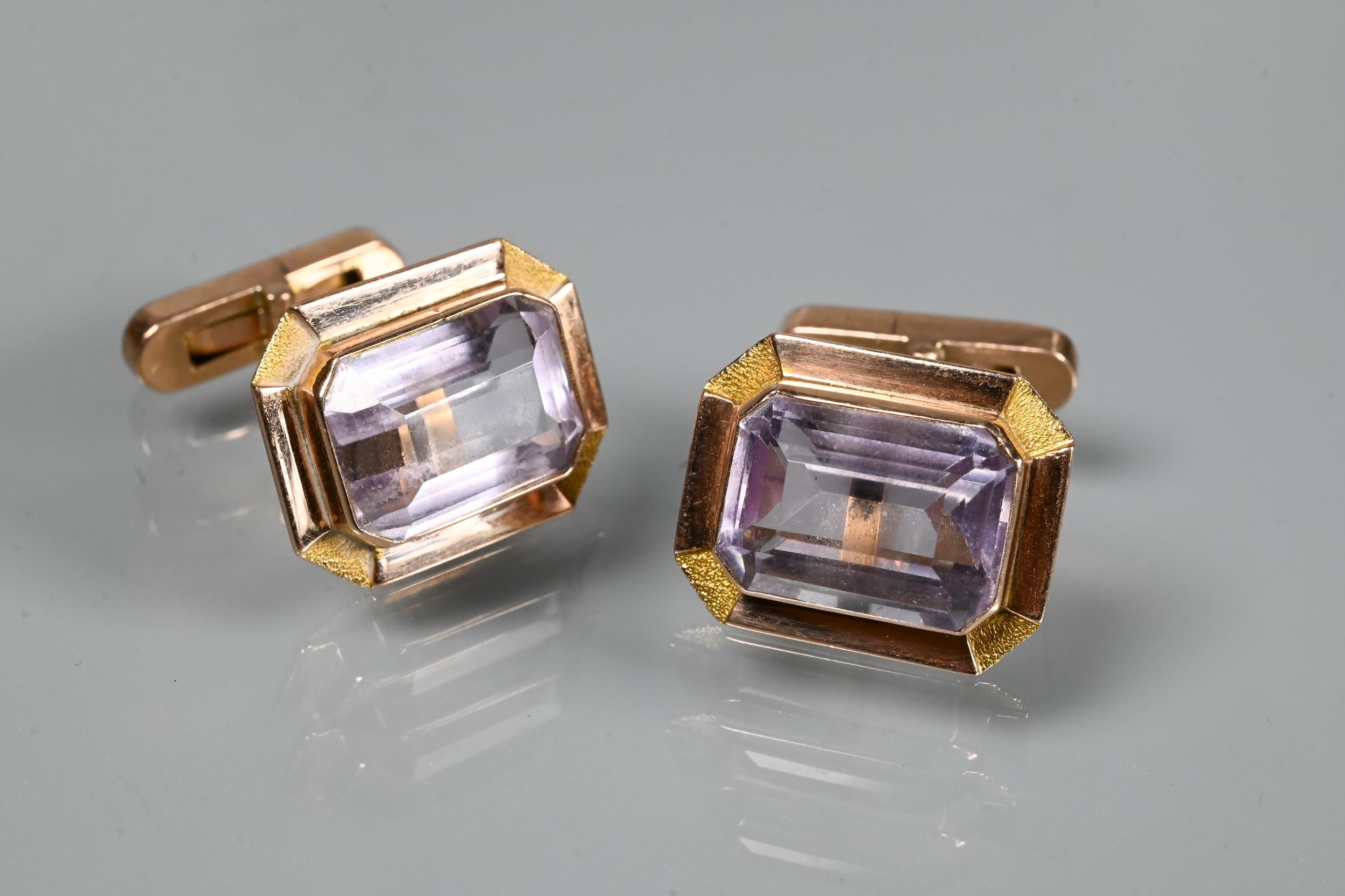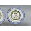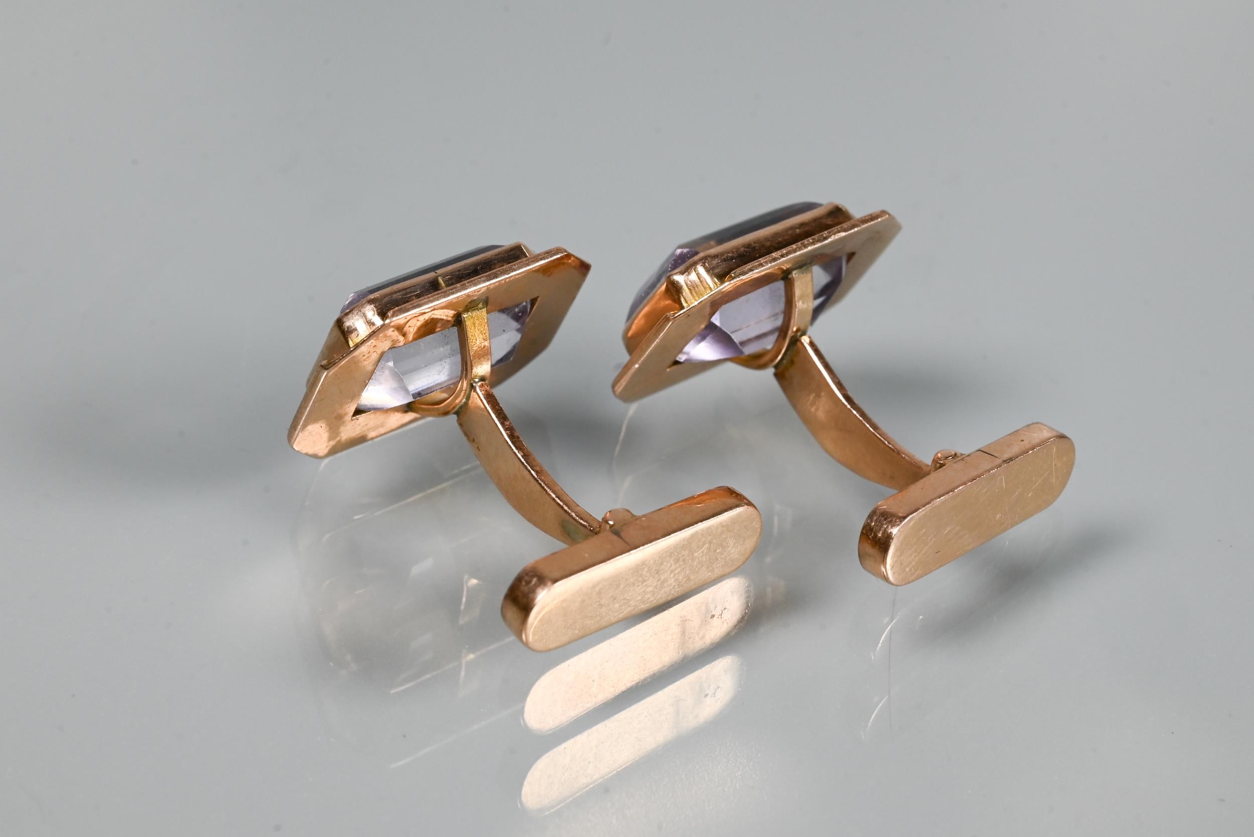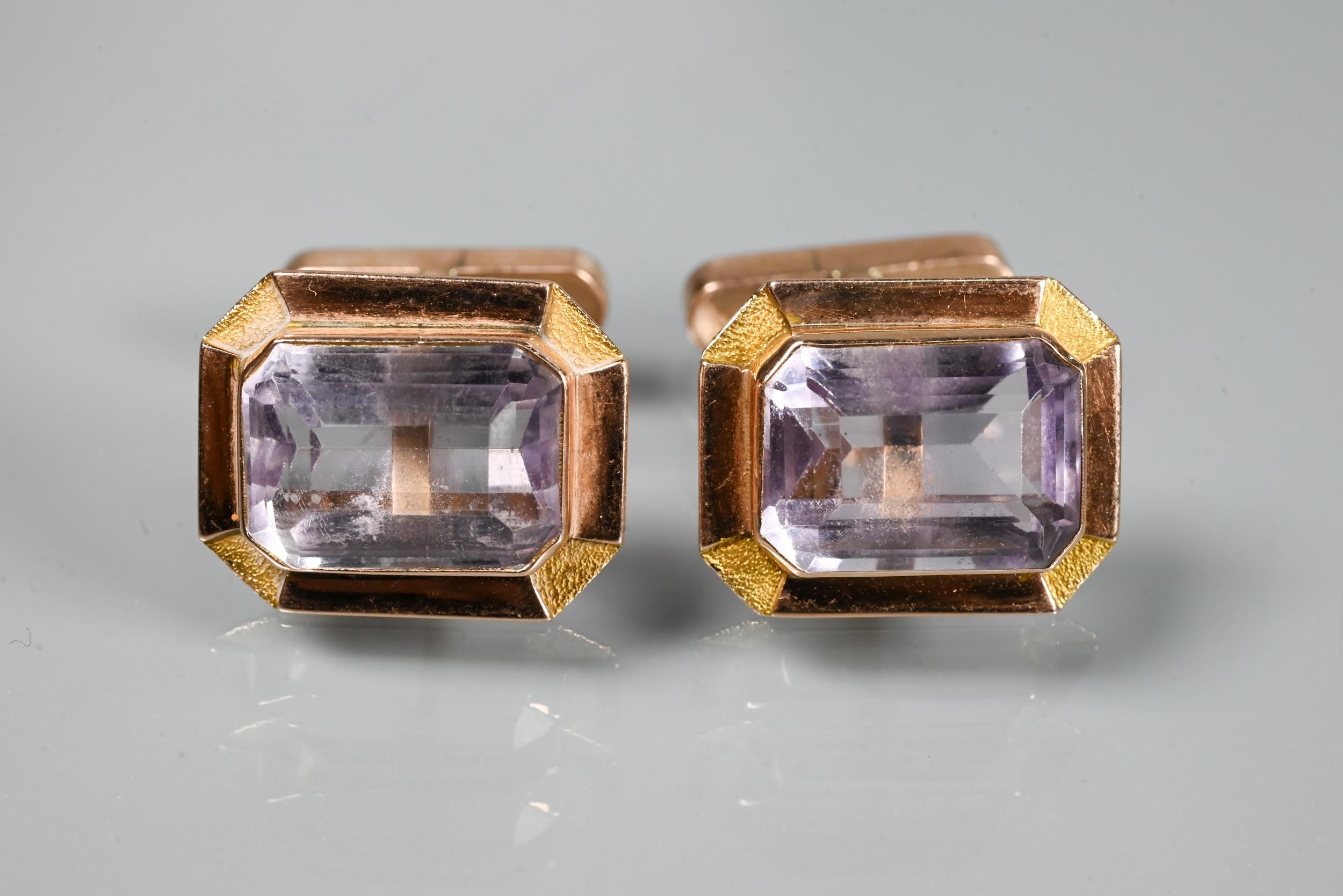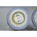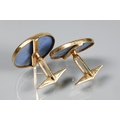 Two pairs of cufflinks, one with Wedgwood jasperware roundels featuring classical vignette, with swivel setting, stamped 14k (a/f); and one pair set pale rectangular stones, stamped 14k (2)