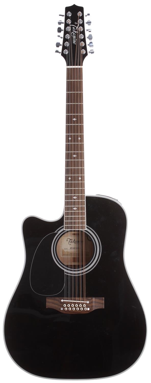 2022 Takamine EF381SC twelve string left-handed electro-acoustic guitar, made in Japan; Body: black gloss finish, a few light surface marks; Neck: good; Fretboard: rosewood; Frets: good; Electrics: working; Hardware: good; Case: original compressed foam case; Overall condition: very good