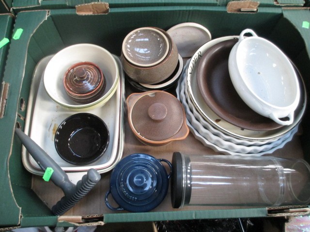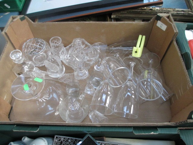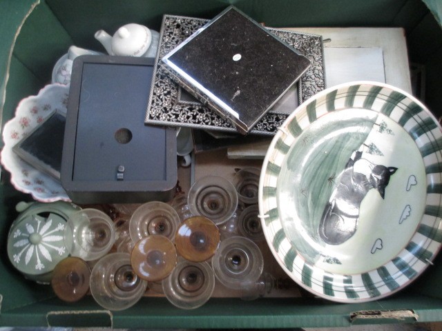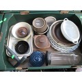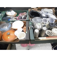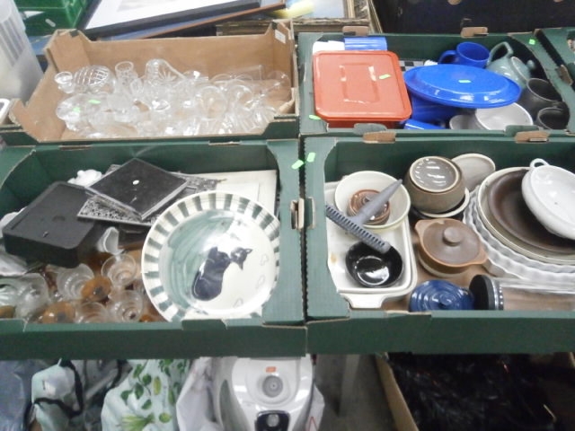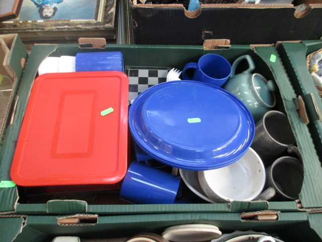 Four boxes inc glassware, plastic crockery, stoneware dishes, etc