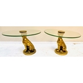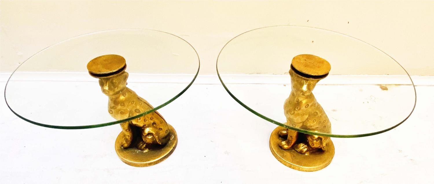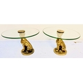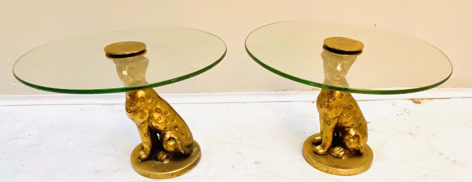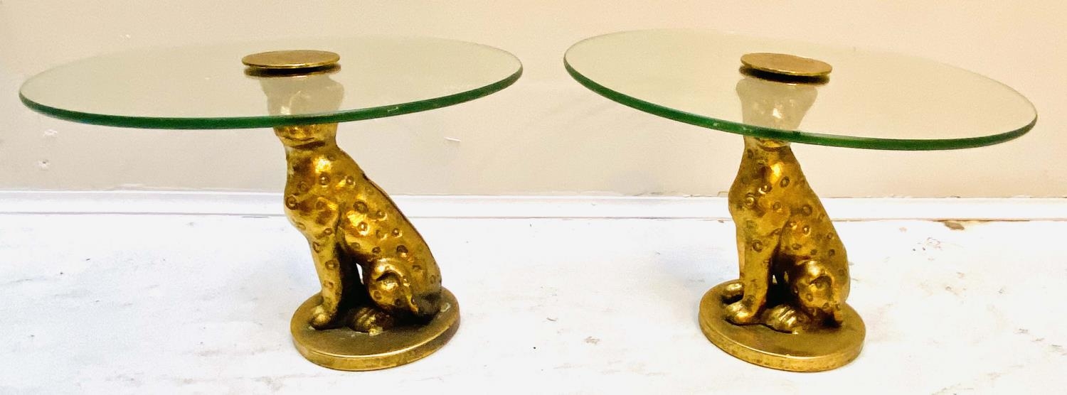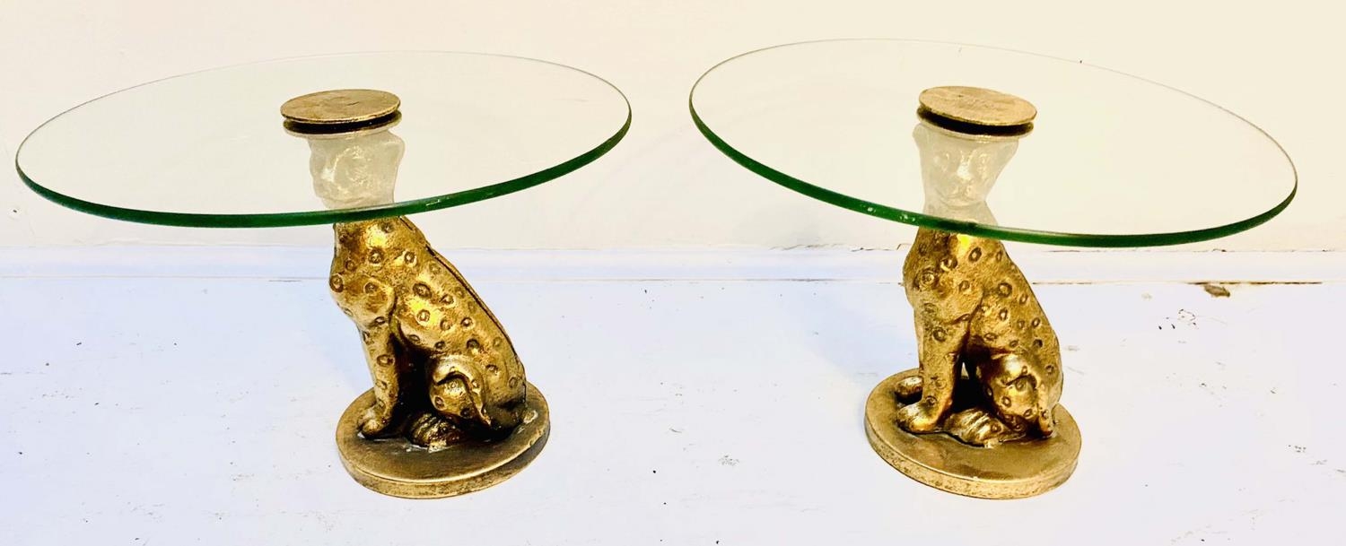 LEOPARD FIGURALTAZZAS, a pair, 21cm H x 30cm diam., sculptural seated leopard supports, gilt metal, circular glass tops. (2)