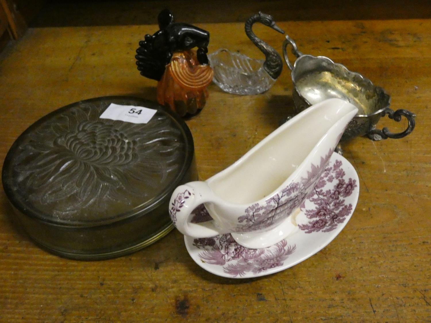 Ep twin handled dish, ceramic sauceboat on stand etc