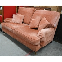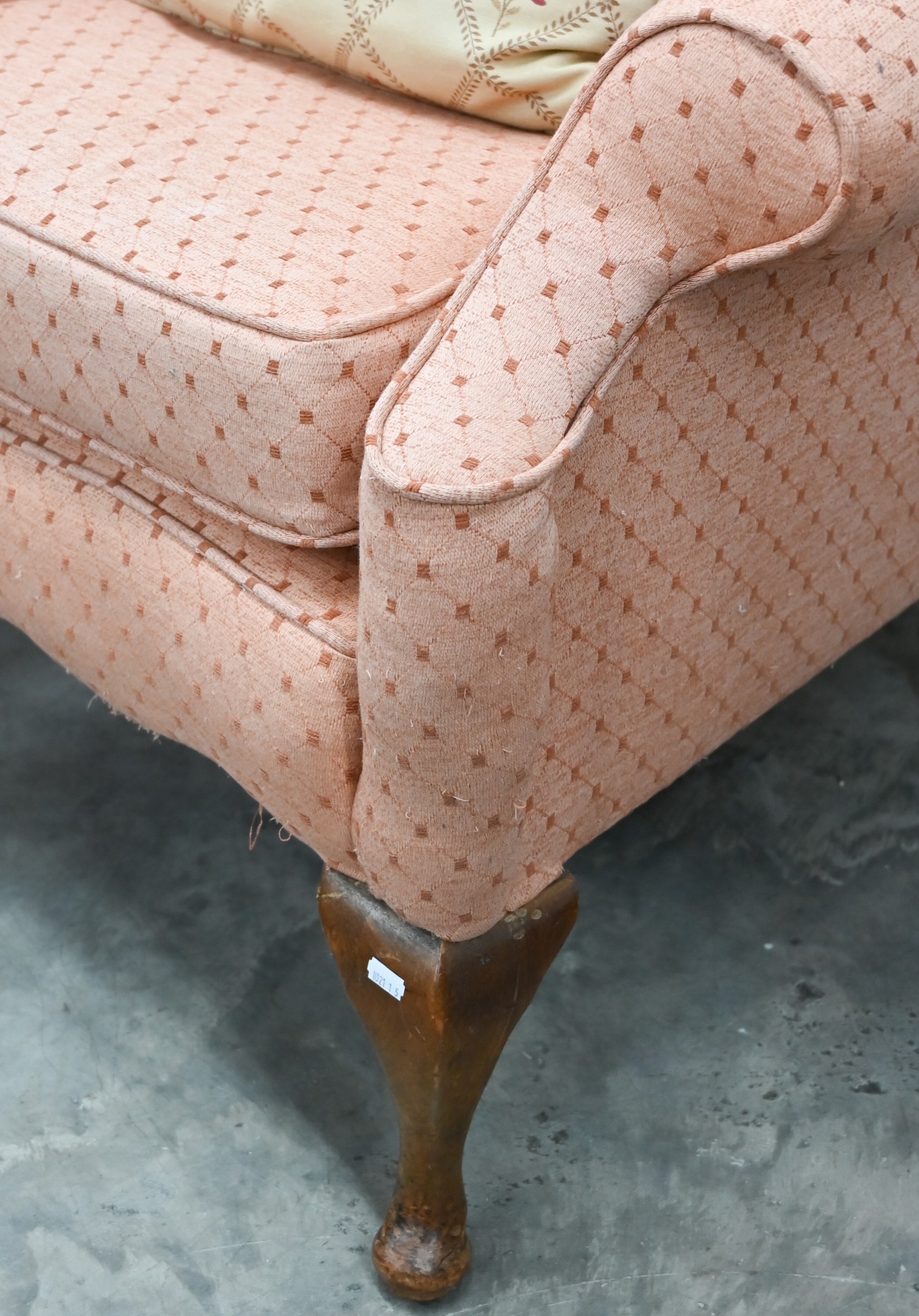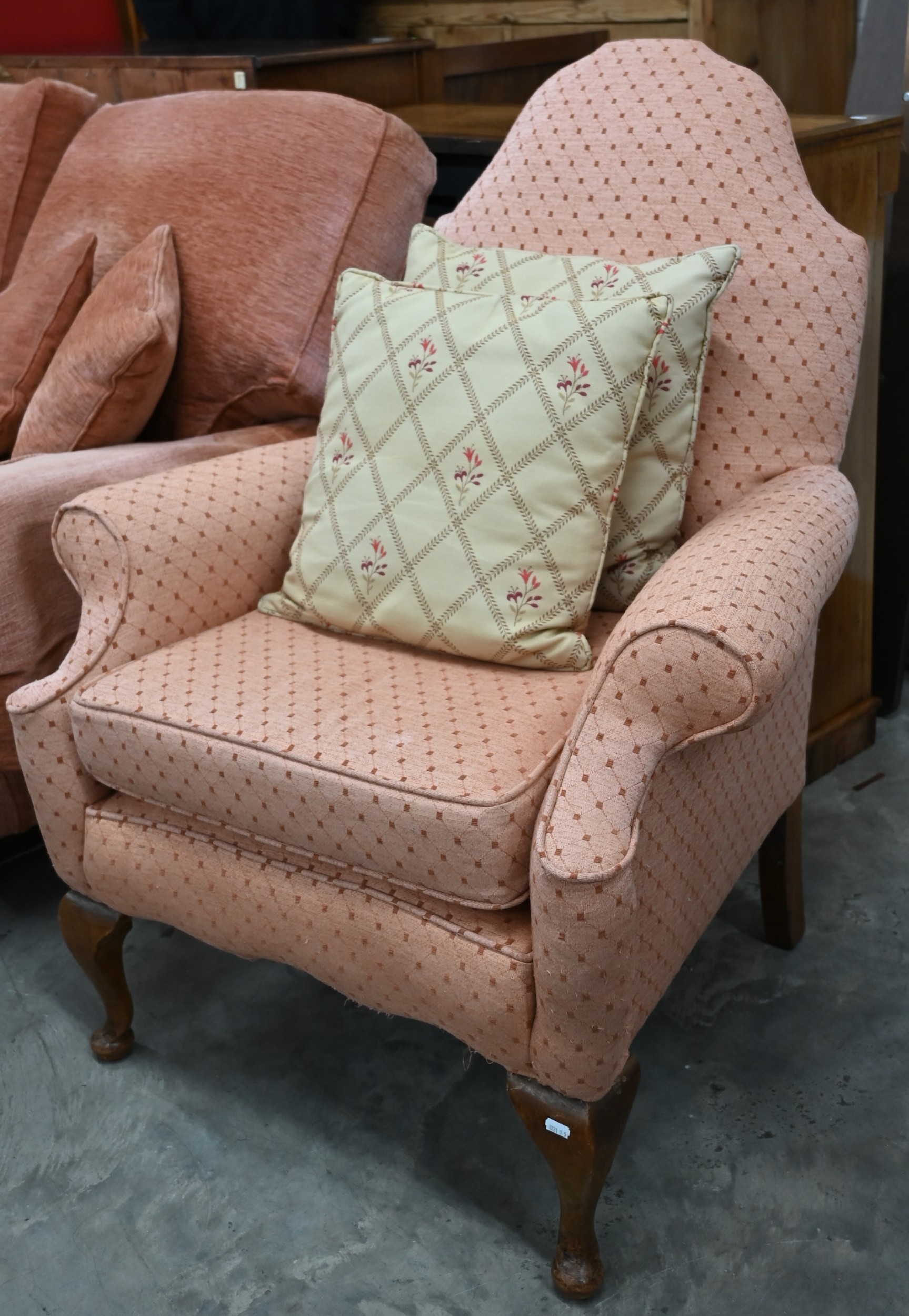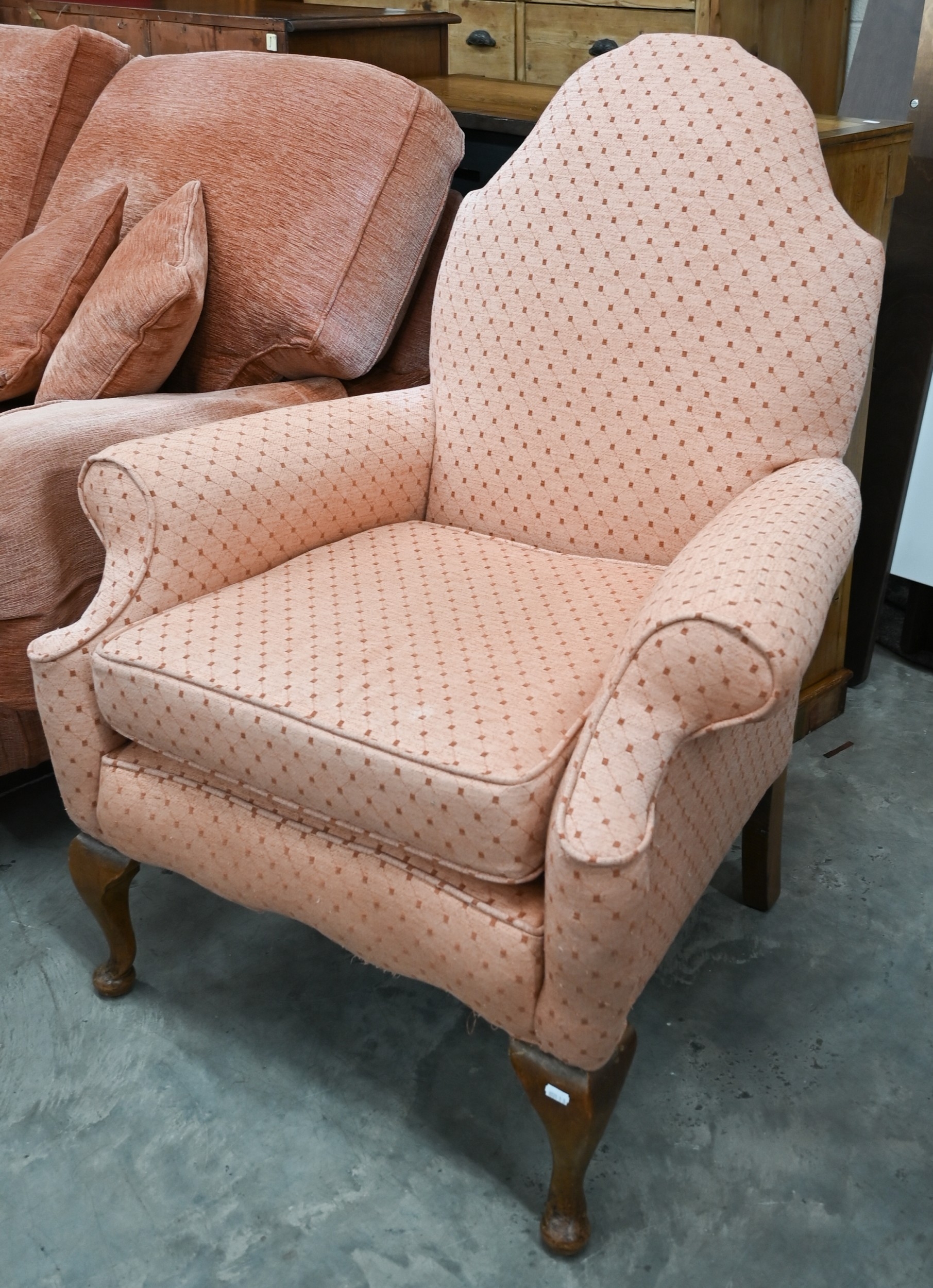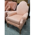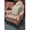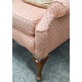 A Georgian style walnut framed hump-back armchair upholstered in diamond/lattice pink fabric, with cabriole front legs
