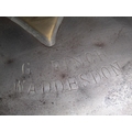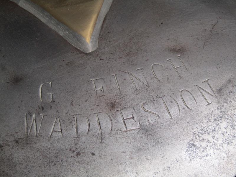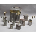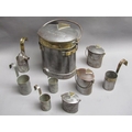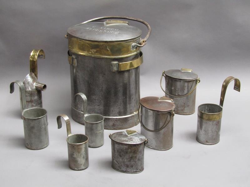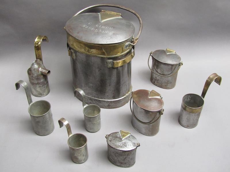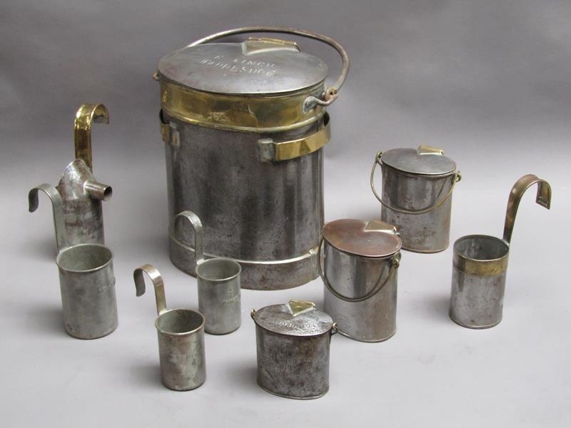 An early 19c steel and brass milk mans two gallon can with hinged cover inscribed 'G Finch Waddesdon'. With swing handle and two dipper can holders, each carrying a one pint steel and brass dipper, one dipper with fixed spout. Included are two quart cream cans, one pint cream can and three steel dippers - two half pint and one pint.