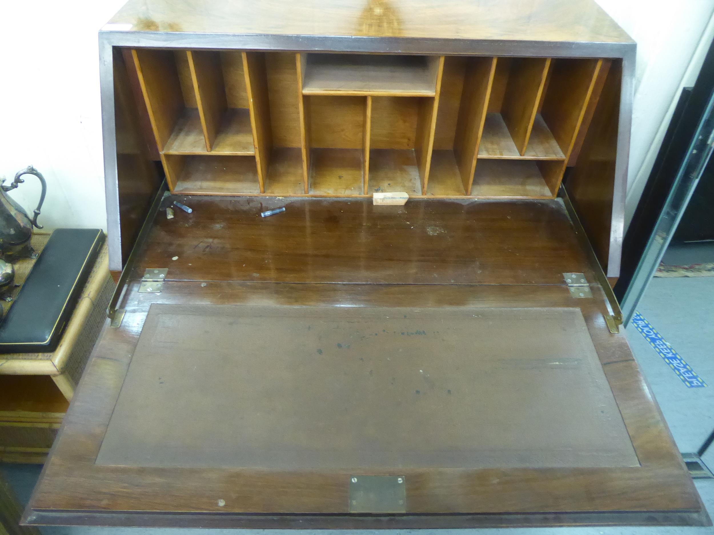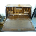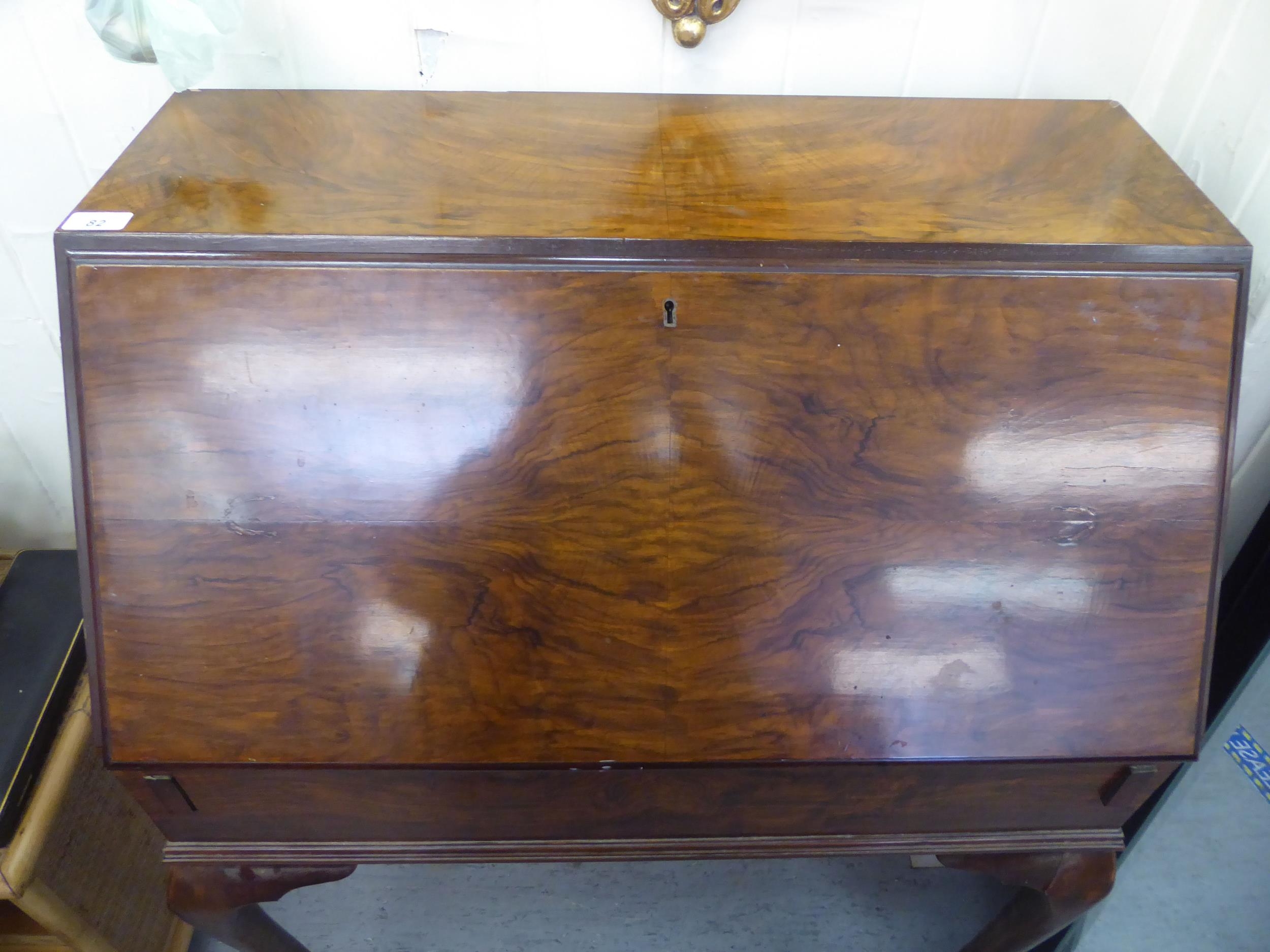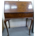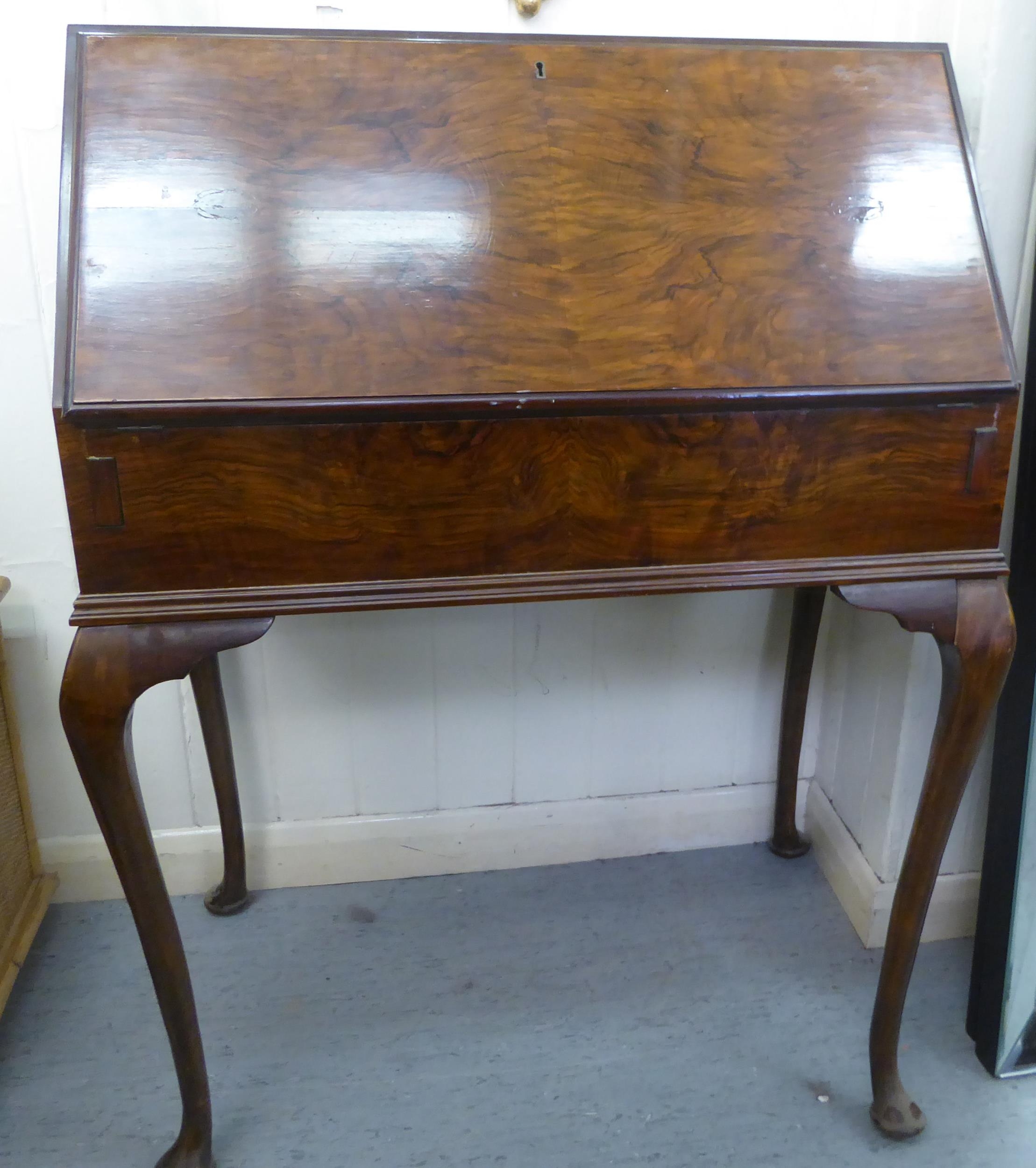 A 1930s walnut finished clerks bureau. the fall flap enclosing a part fitted interior, raised on slender cabriole legs and pad feet 40"h 30"w