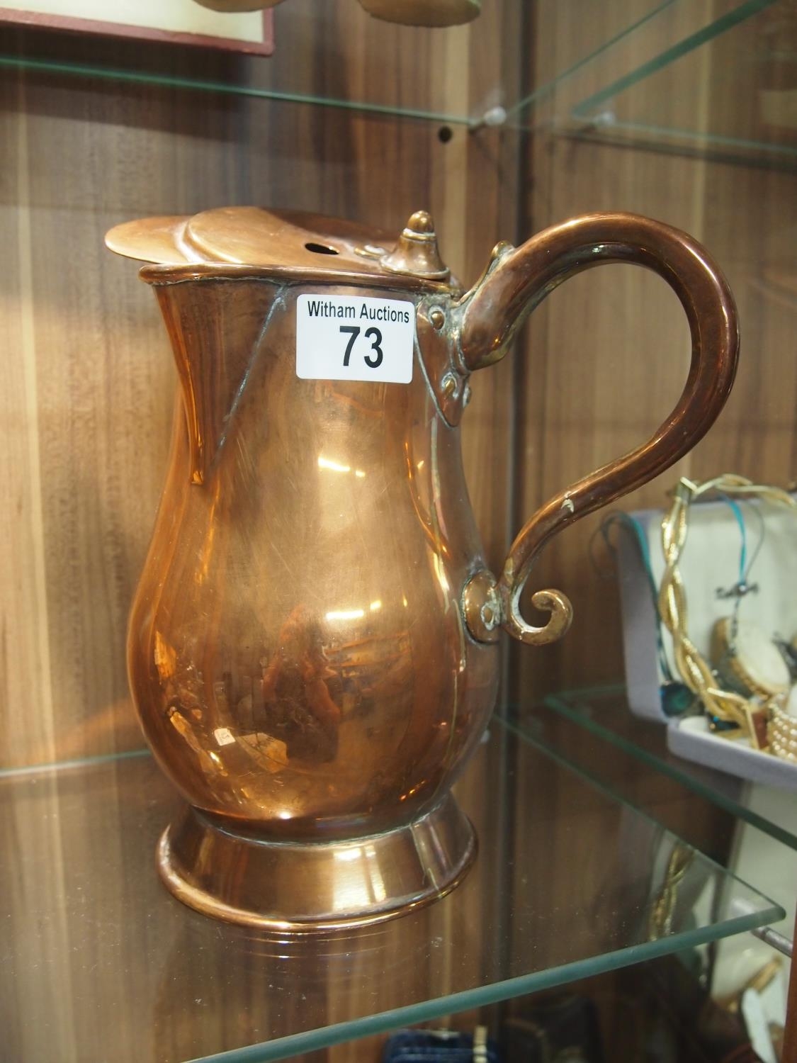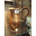 An antique copper jug/mulled ale/wine pot with handle to side and pivot cover to lid. Approx. height 23cm
