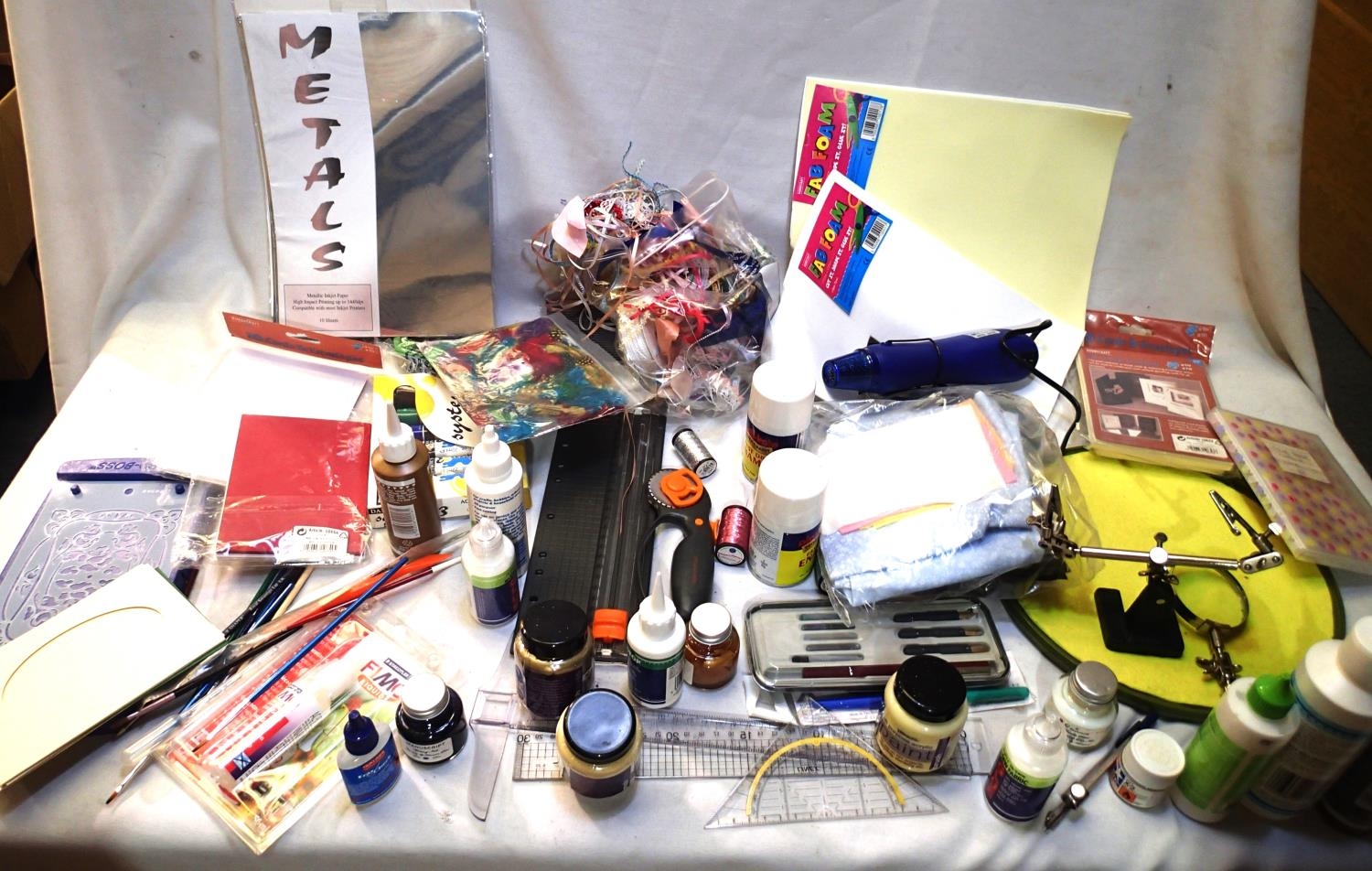 Quantity of craft tools and materials icluding glues, paints, brushes, fabric, calligraphy, threads etc. Picture shows part of lot. P&P Group 2 (£18+VAT for the first lot and £3+VAT for subsequent lots)