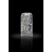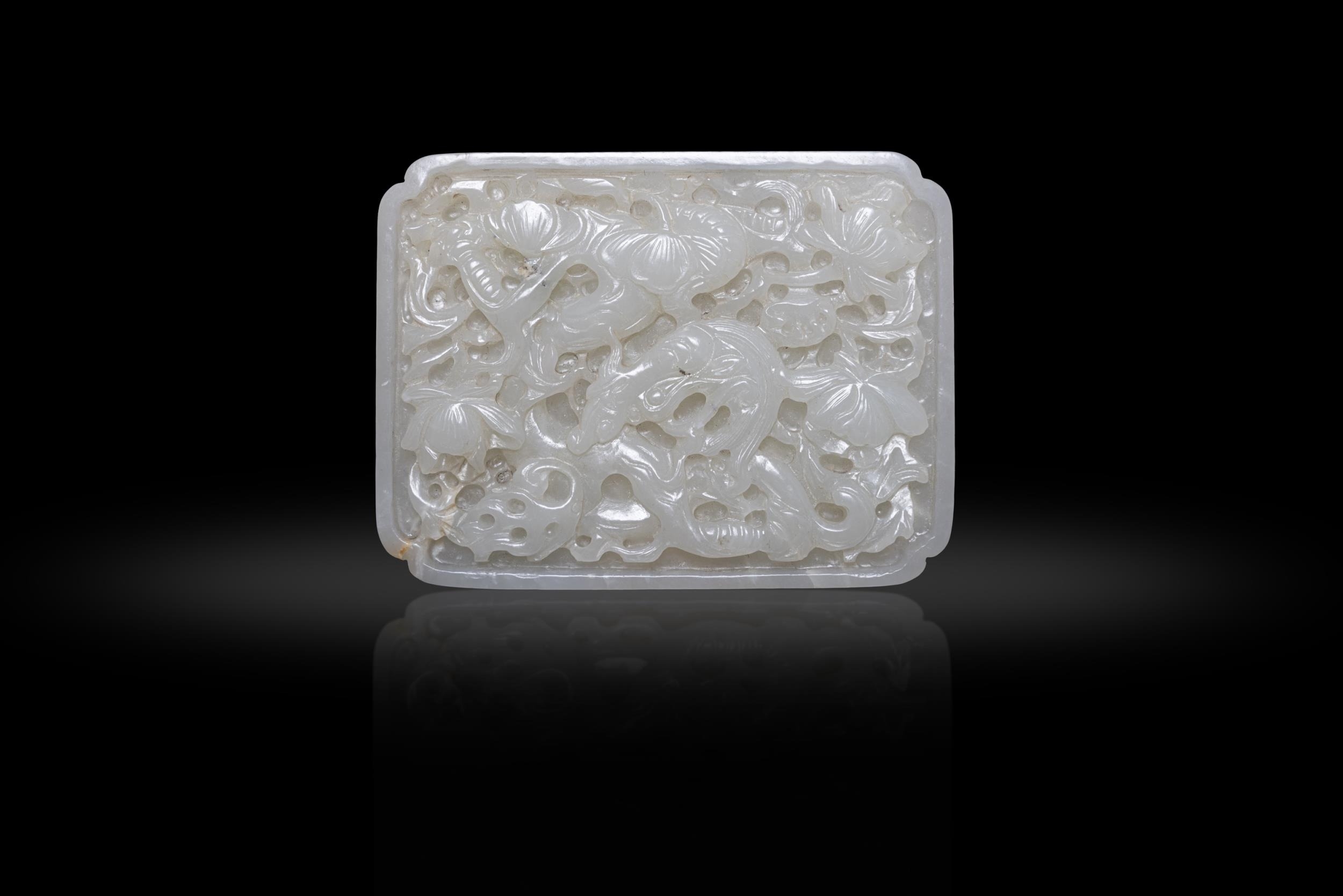 AN OPENWORK, WHITE JADE PLAQUE WITH CARVING OF DRAGON AND PEONY FLOWERS ?? ?????? China, Ming dynasty Size. 6.5 x 8.7cm