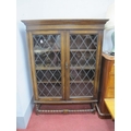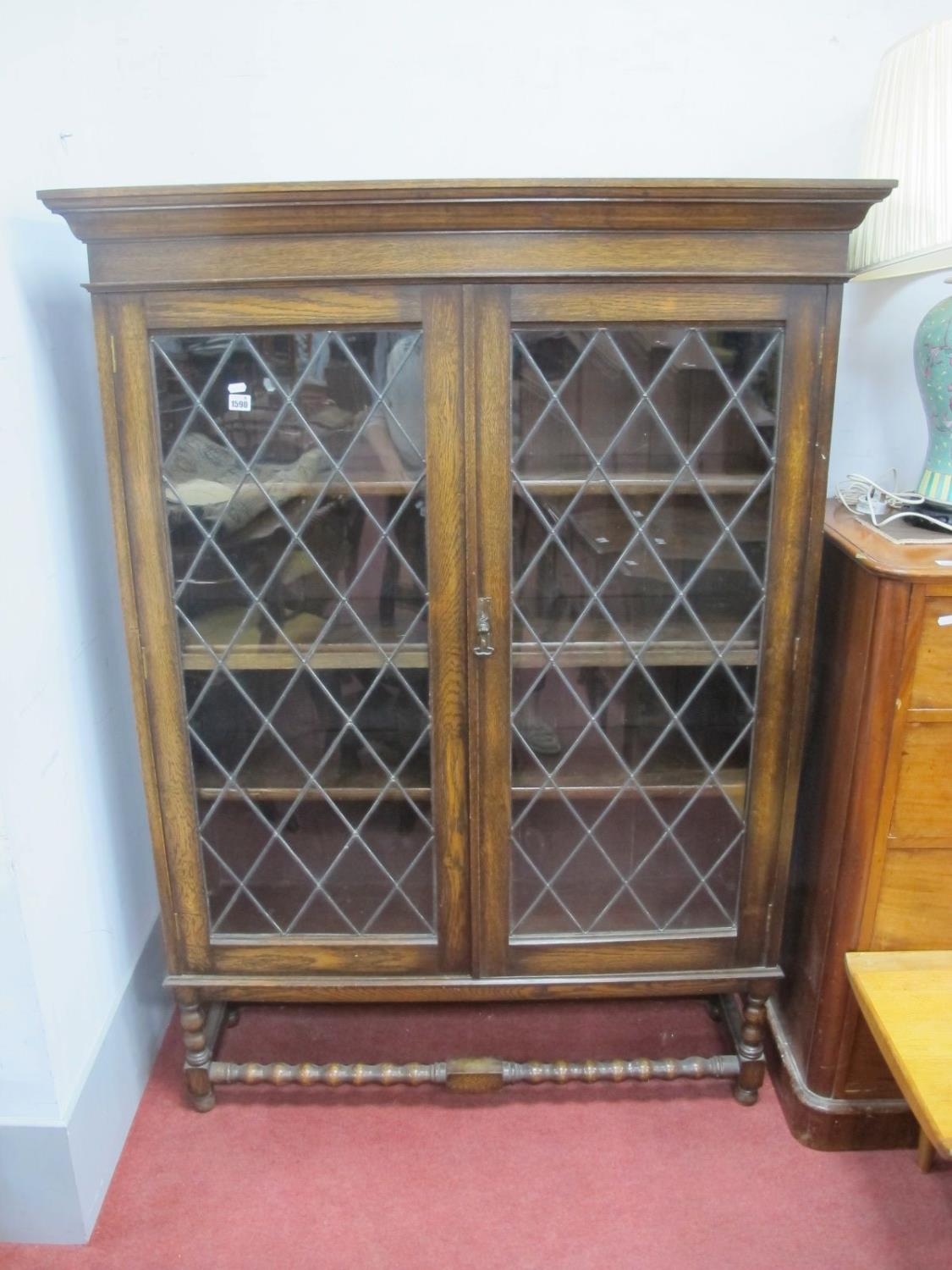 A 1920's Oak Display Cabinet, with stepped pediment, leaded glazed doors, on bobbin supports and stretcher, 116cm wide.