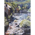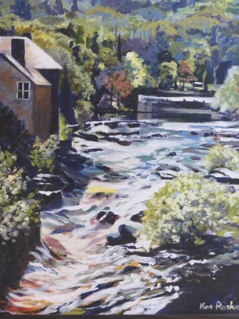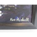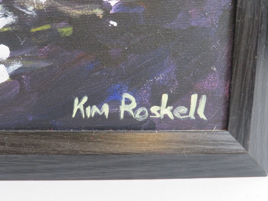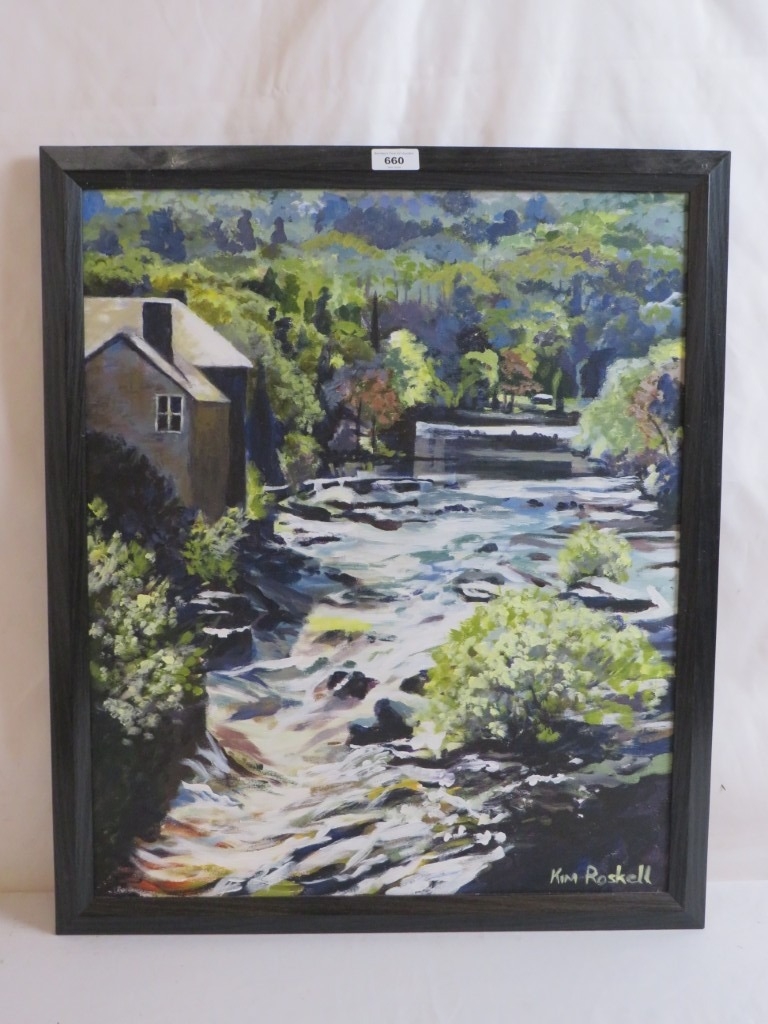 Kim Roskell. 20th/21st Century framed acrylic on canvas. Rough Water at Llangollen, Wales. Purchased at The Society of Women Artists, signed lower right. Label verso. 60cm x 50cm approx.