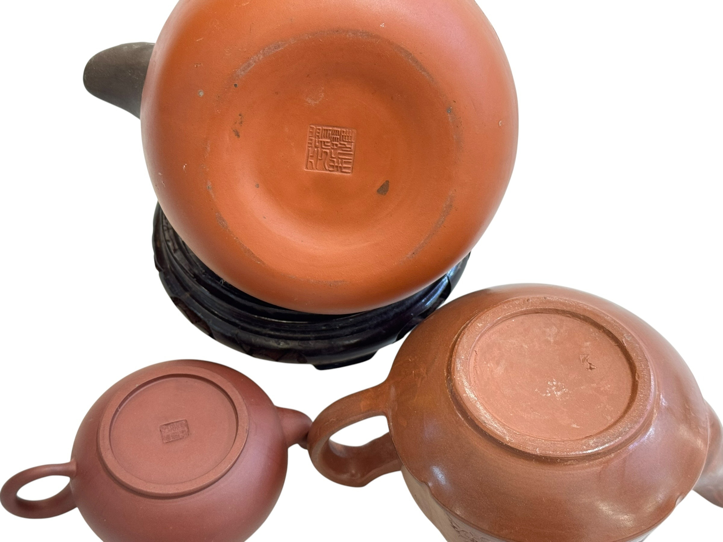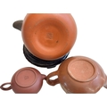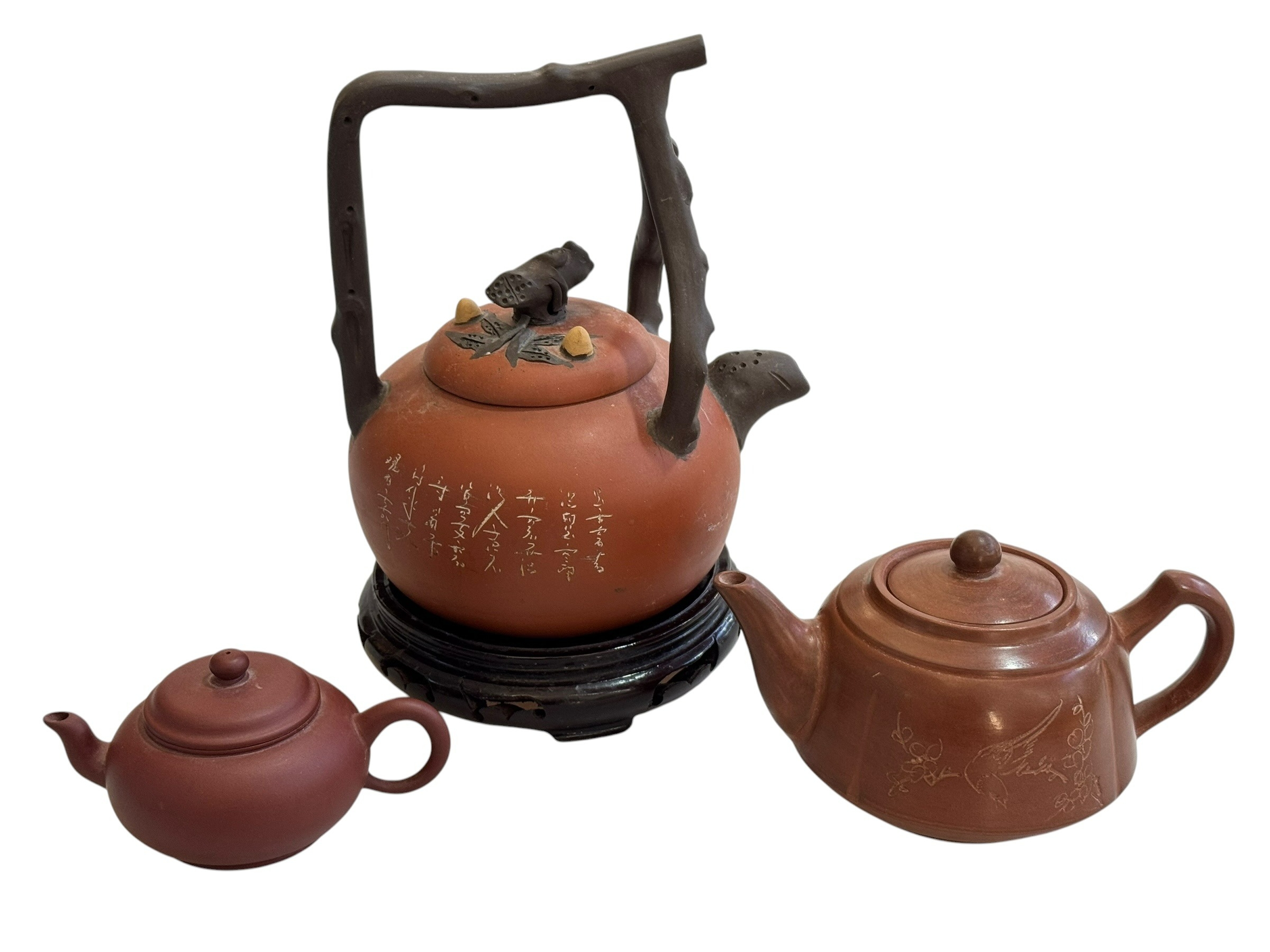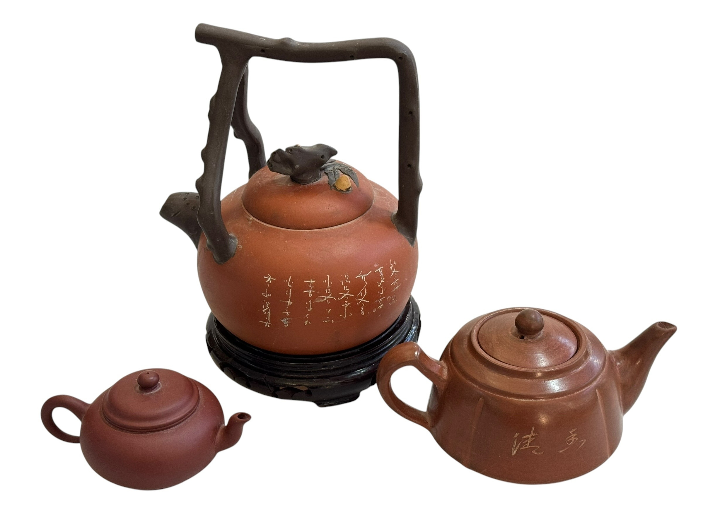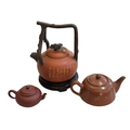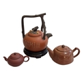 Chinese red ware kettle on wooden stand and two smaller red ware teapots.