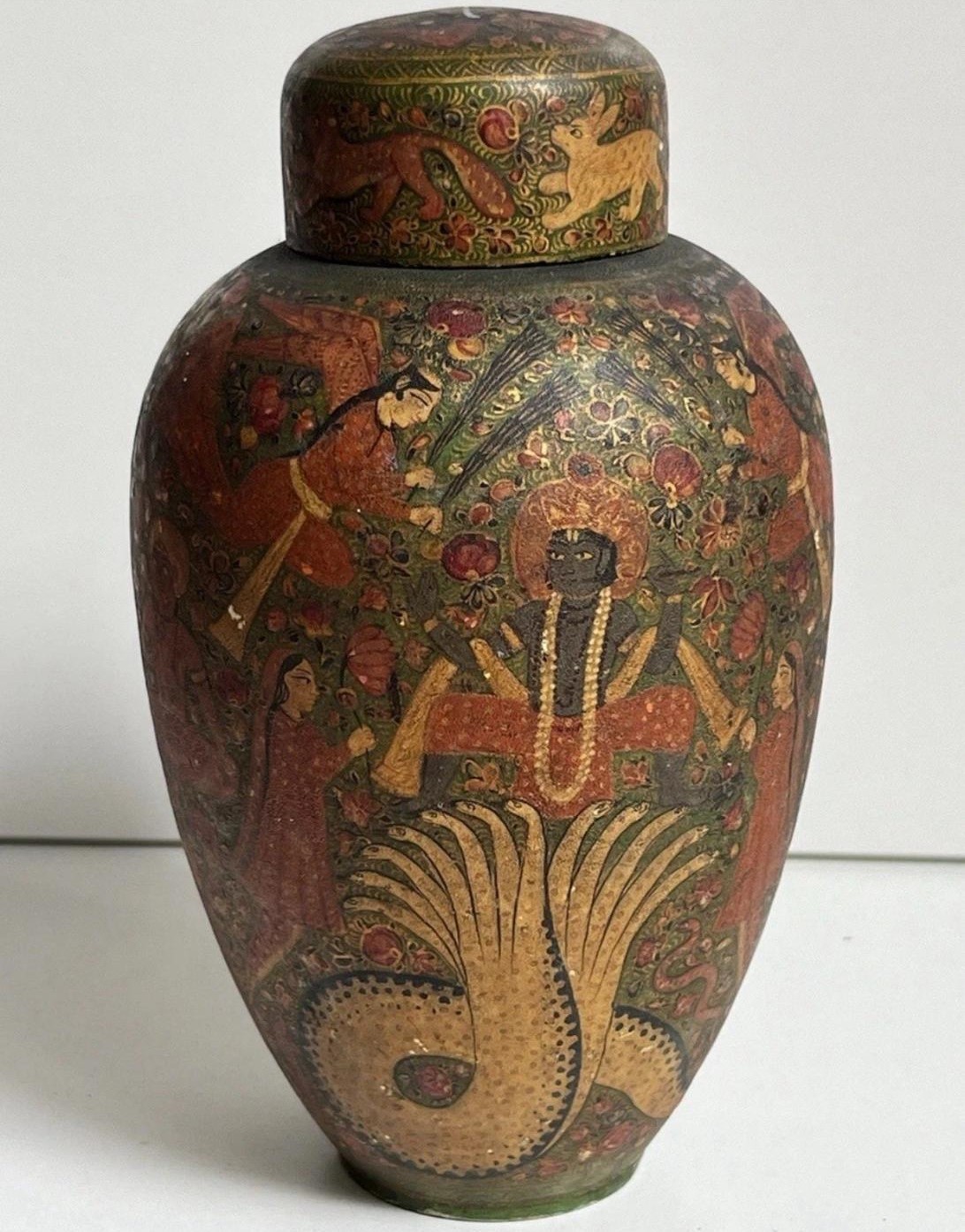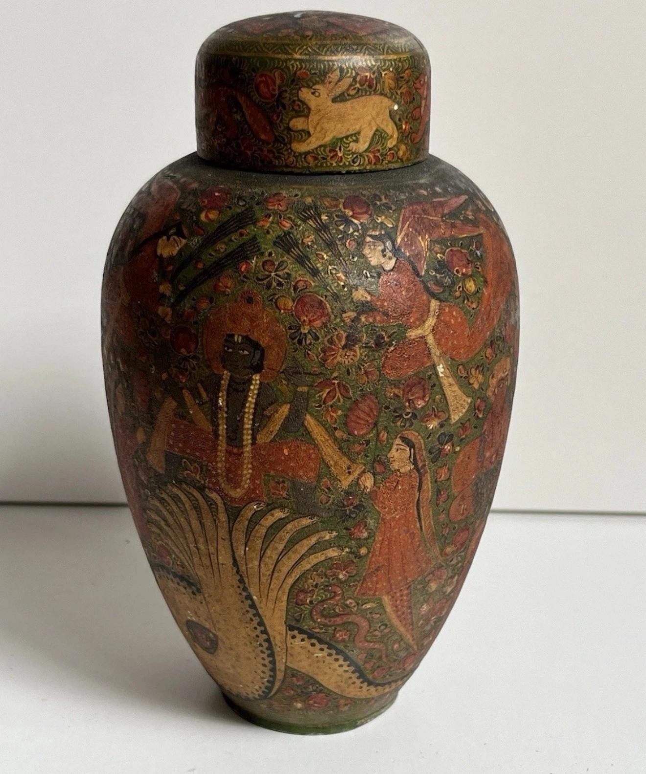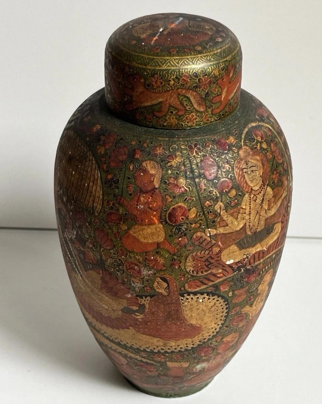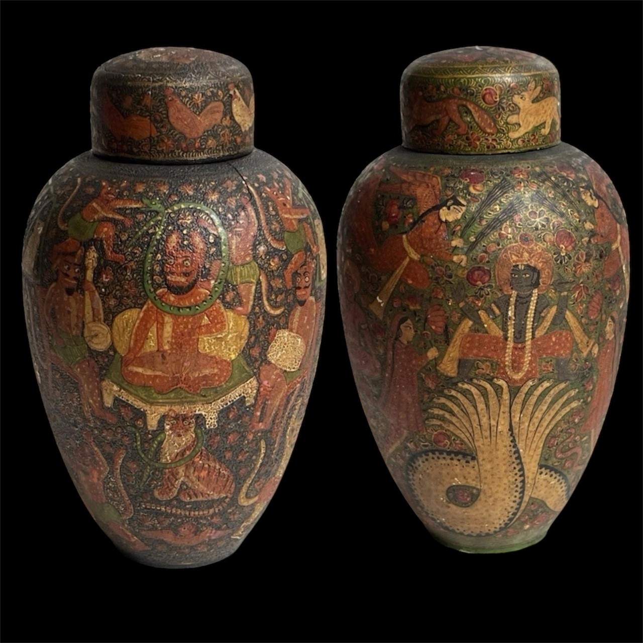 Pair of 19th Century Indian/Kashmiri Lacquered Urns with Original Lids, Hand-Painted with Mythical & Animal Motifs. Eastern