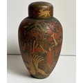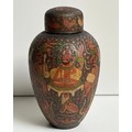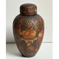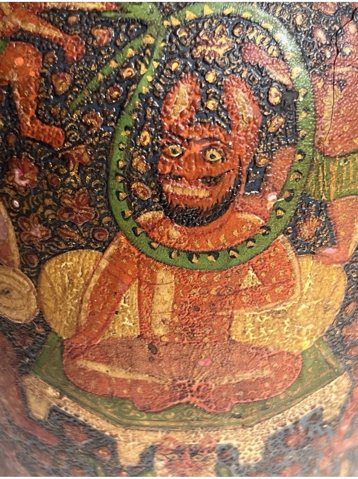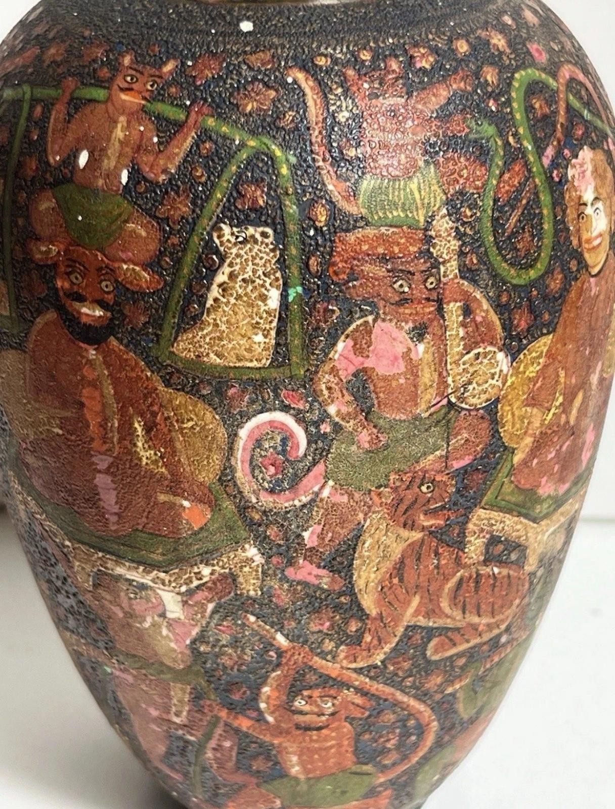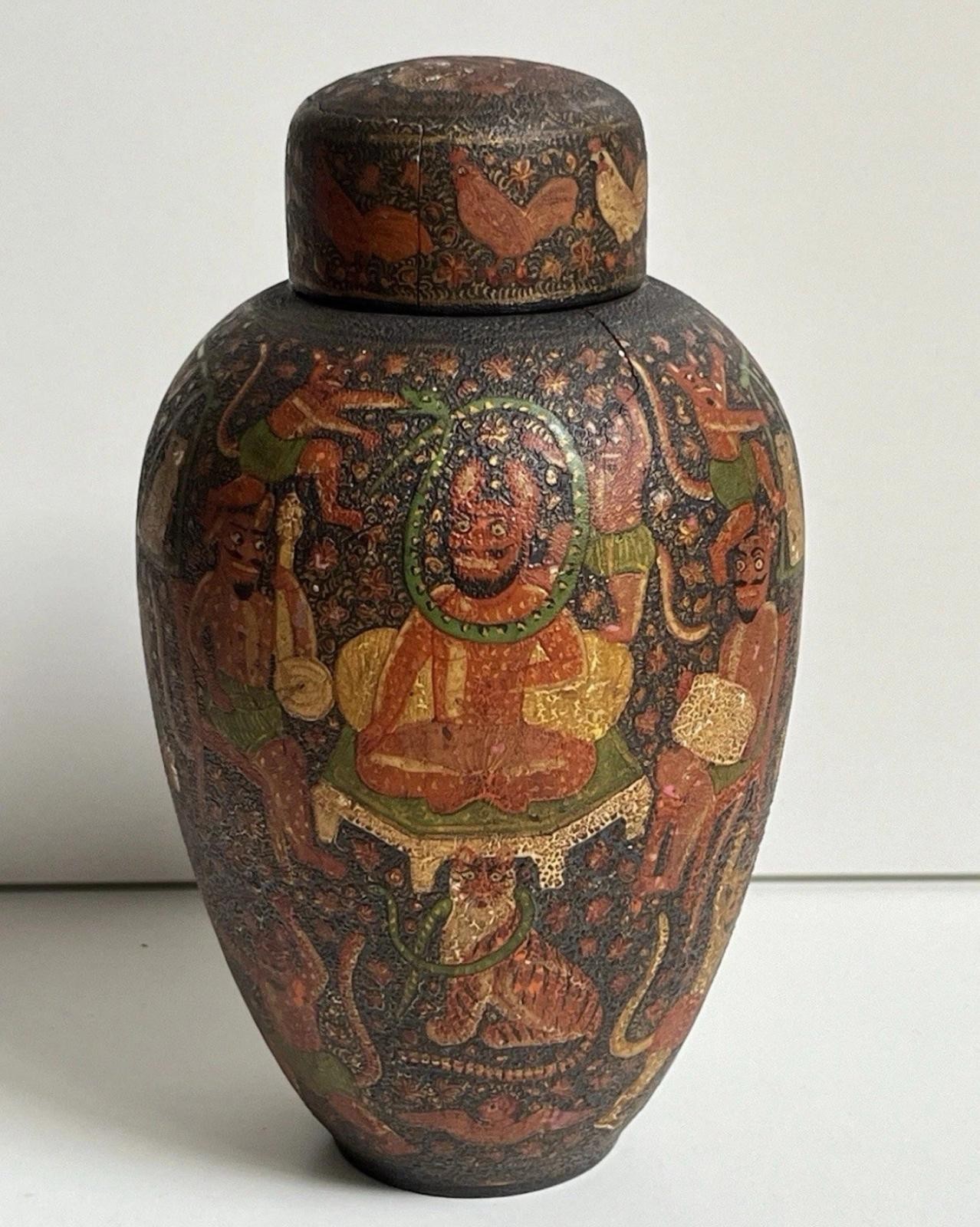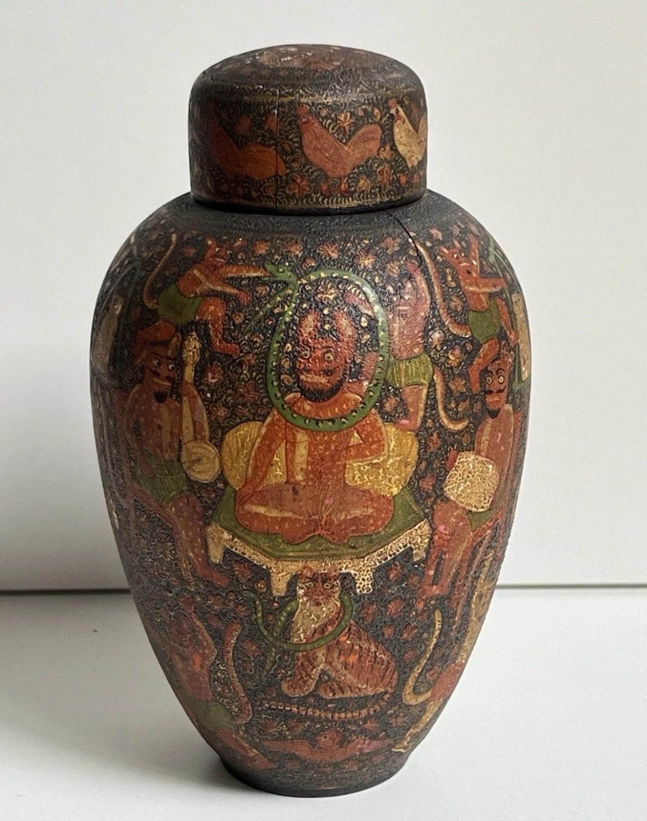 Pair of 19th Century Indian/Kashmiri Lacquered Urns with Original Lids, Hand-Painted with Mythical & Animal Motifs. Eastern