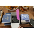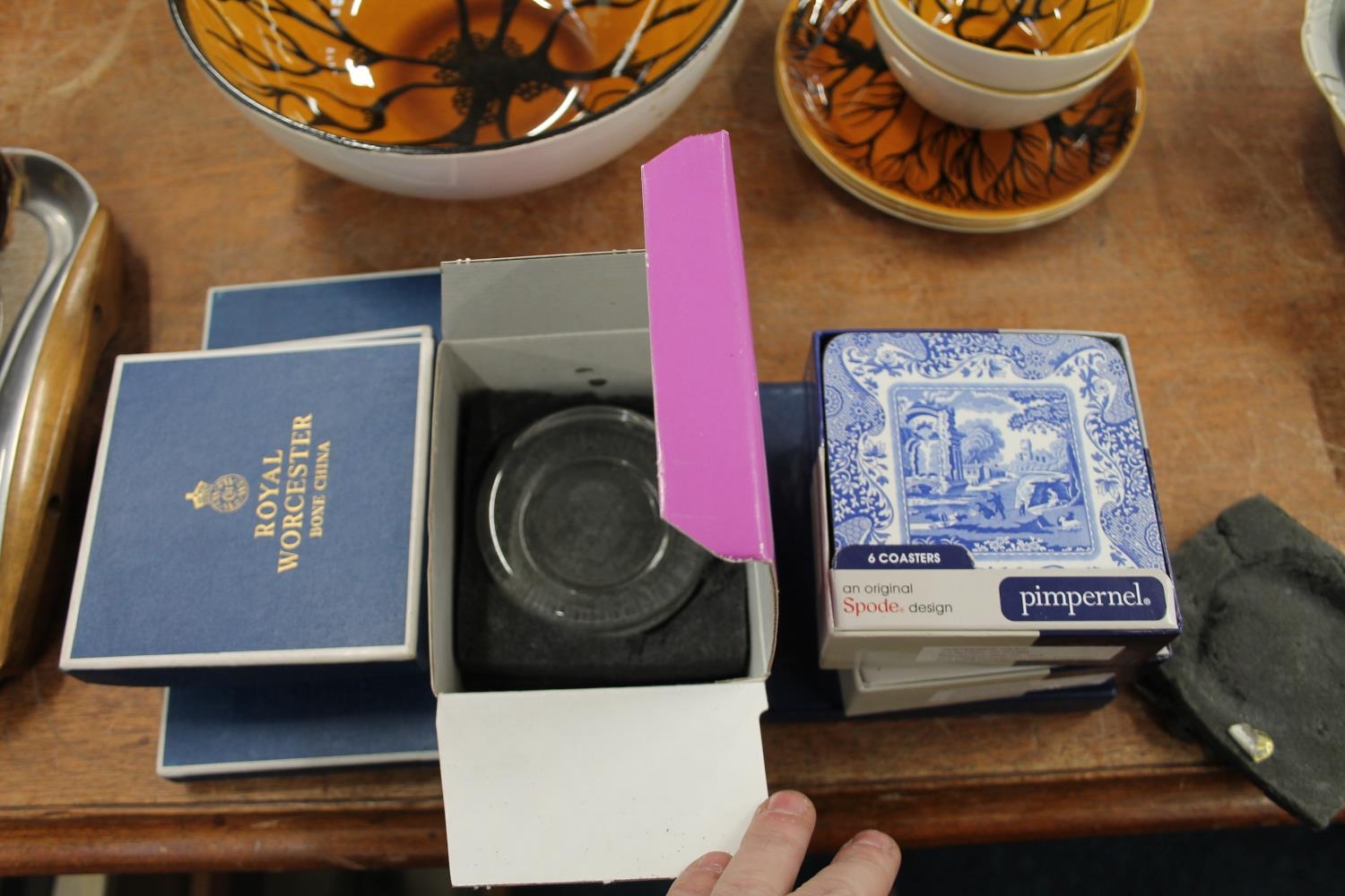 Royal Worcester and Coalport coasters, boxed, and a Wedgwood glass paperweight, boxed.
