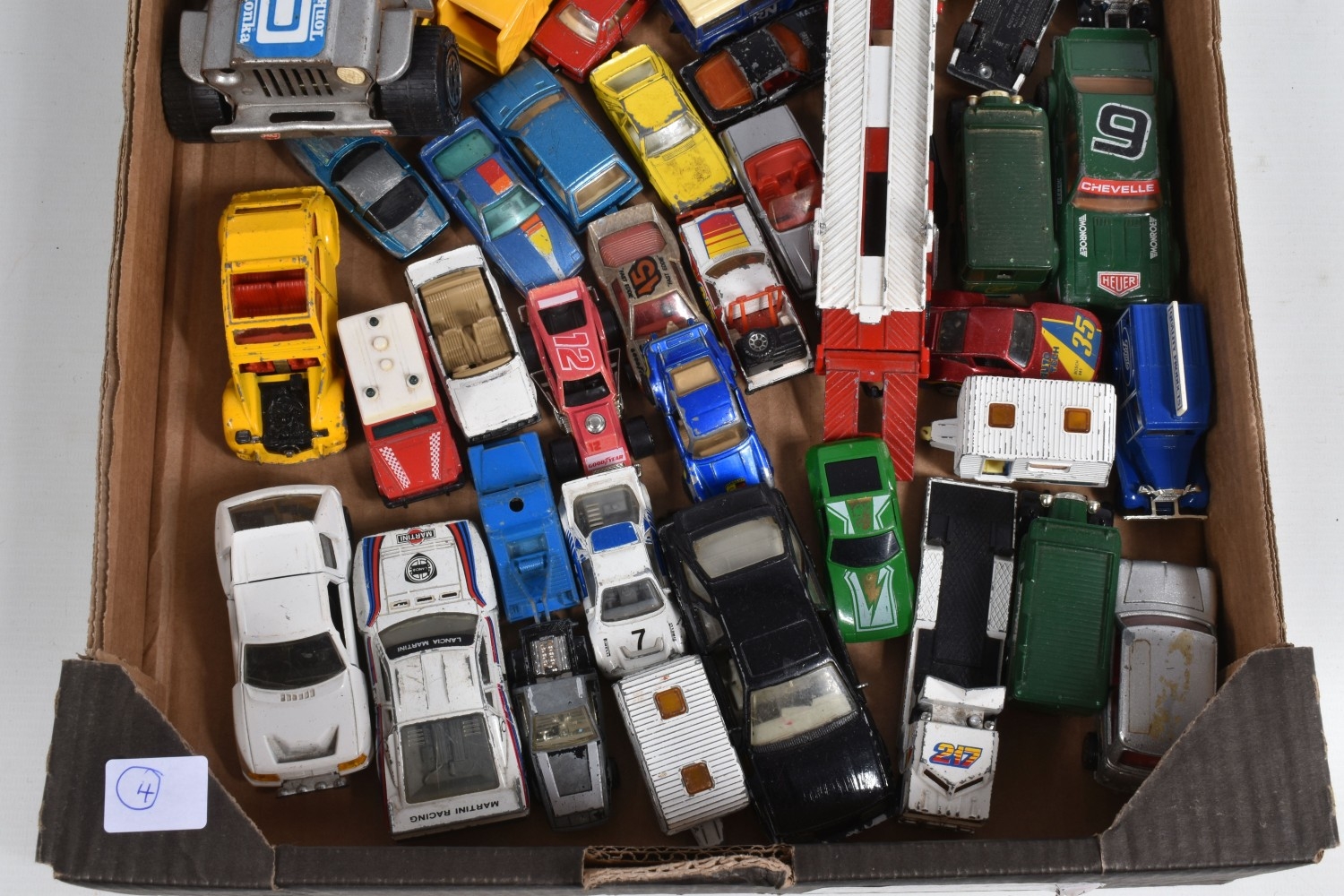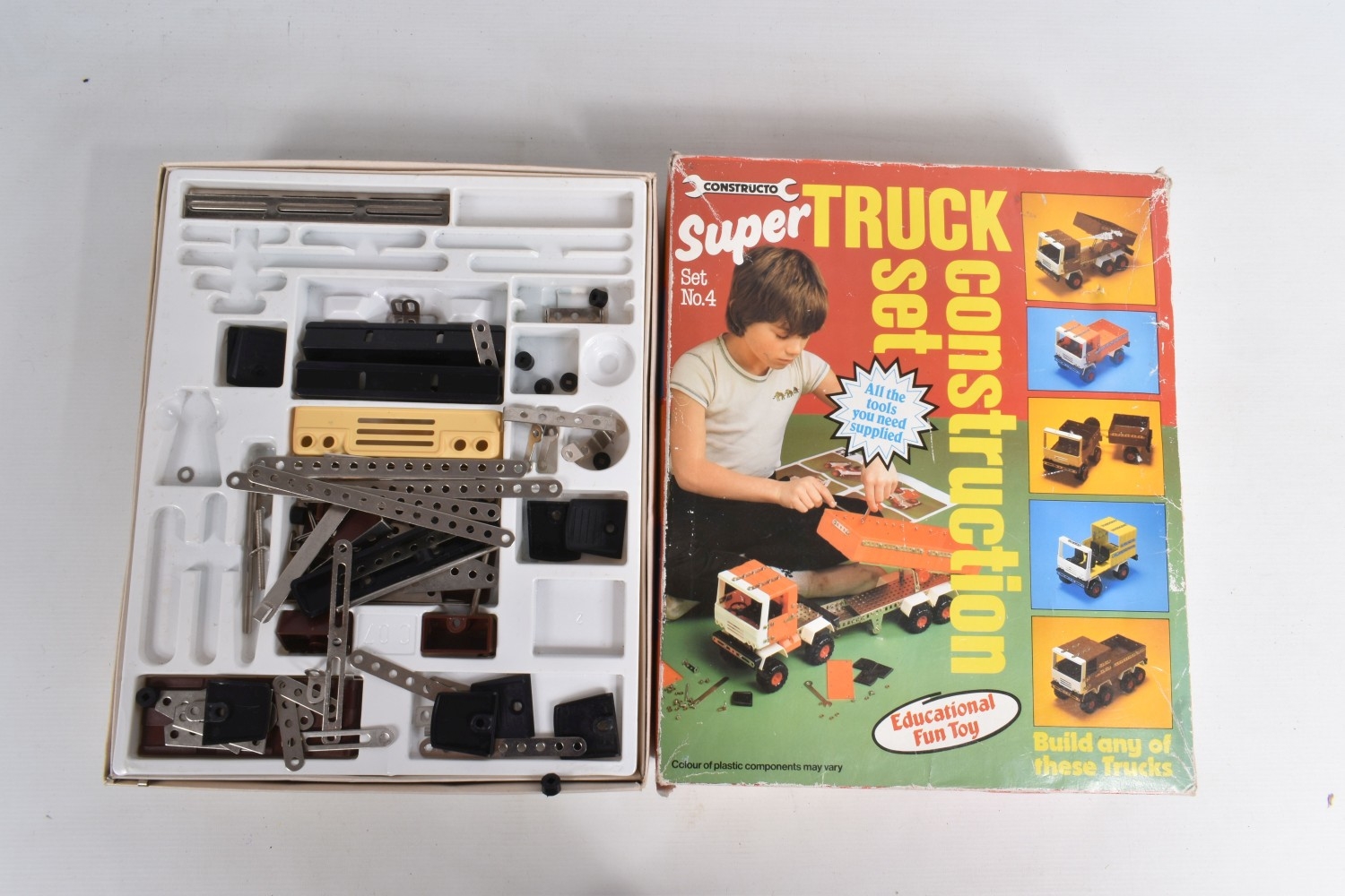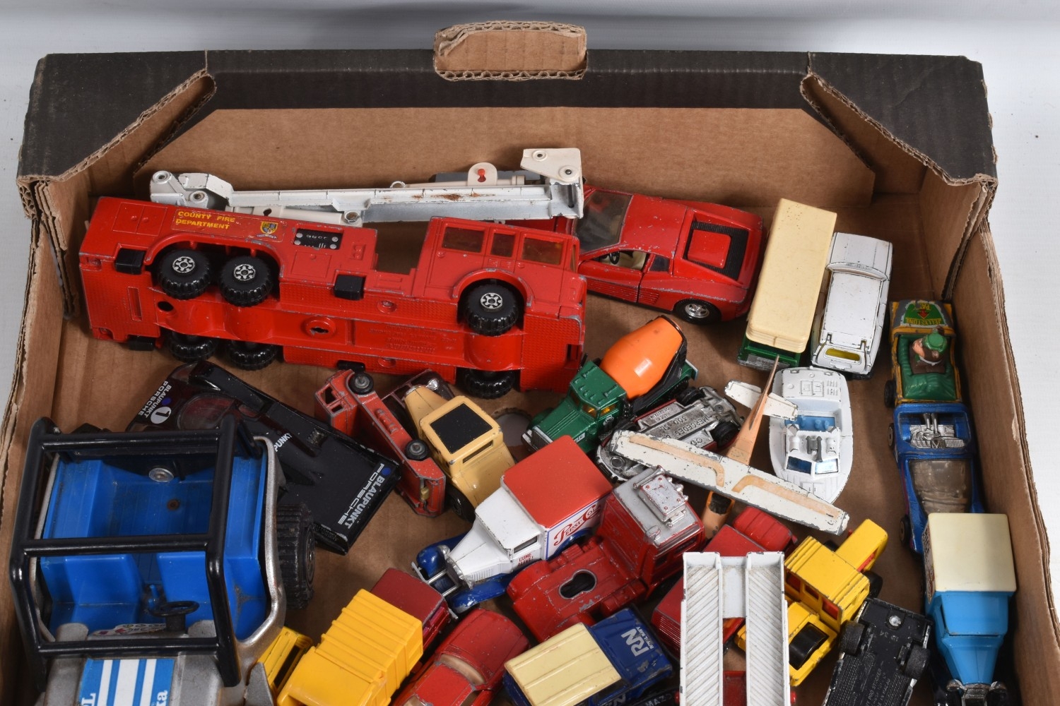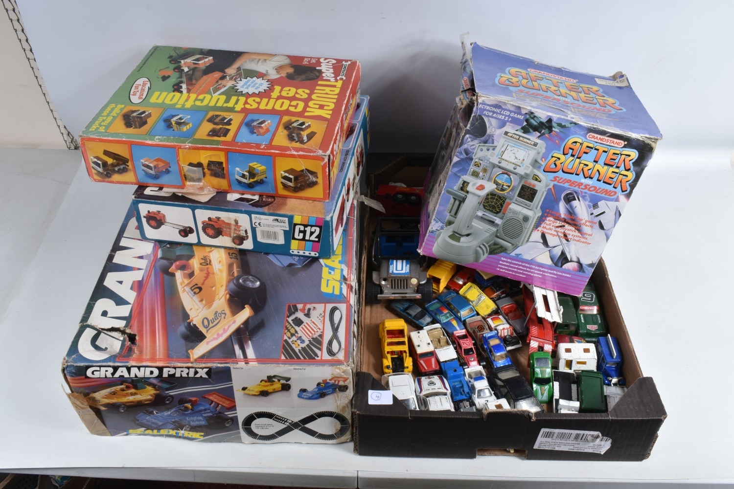 A VARIETY OF BOXED TOYS, to include a 1987 Sega Grandstand After Burner with box, untested, a boxed ETC Constructor C12 set, a boxed ETC Constructor Super Truck Construction set no. 4, both appear largely complete but unsure if missing pieces, a boxed Scalextric Grand Prix, with two cars, two triggers, track and railings, all boxes very worn, some missing parts of panels, with a tray of loose playworn diecast including a Matchbox Cessna 210 G, Police Launch 52, Mazda RX7 56, Ruff Trek, Superfast Refuse Truck 36, Superfast Caravan 31, Specials Lancia Ralley Kenworth Cabover, Midnight Magic, Specials Pro-Stocker, Bomag Road Roller, Peugeot Quasar, Corgi Juniors Car Transporter, Yogi Jellystone Park Jeep, Juniors TK 7 Ton, Mercedes Benz 300SL, British Leyland Mini 1000, a silvered Tonka jeep, etc