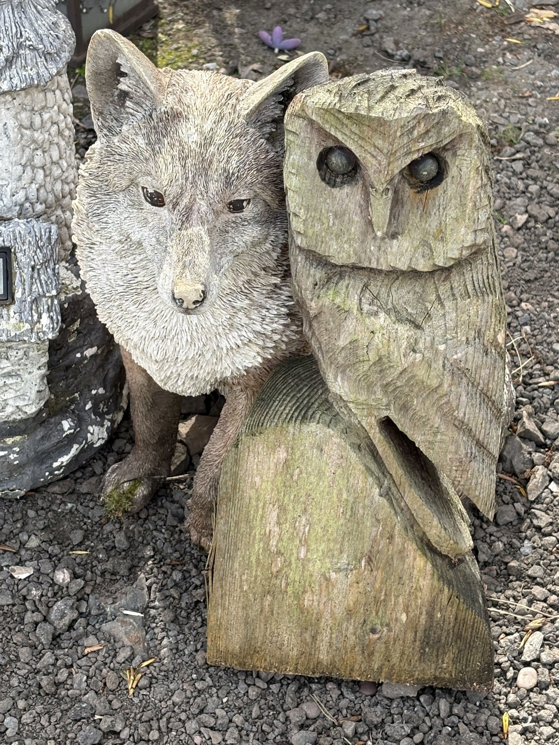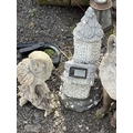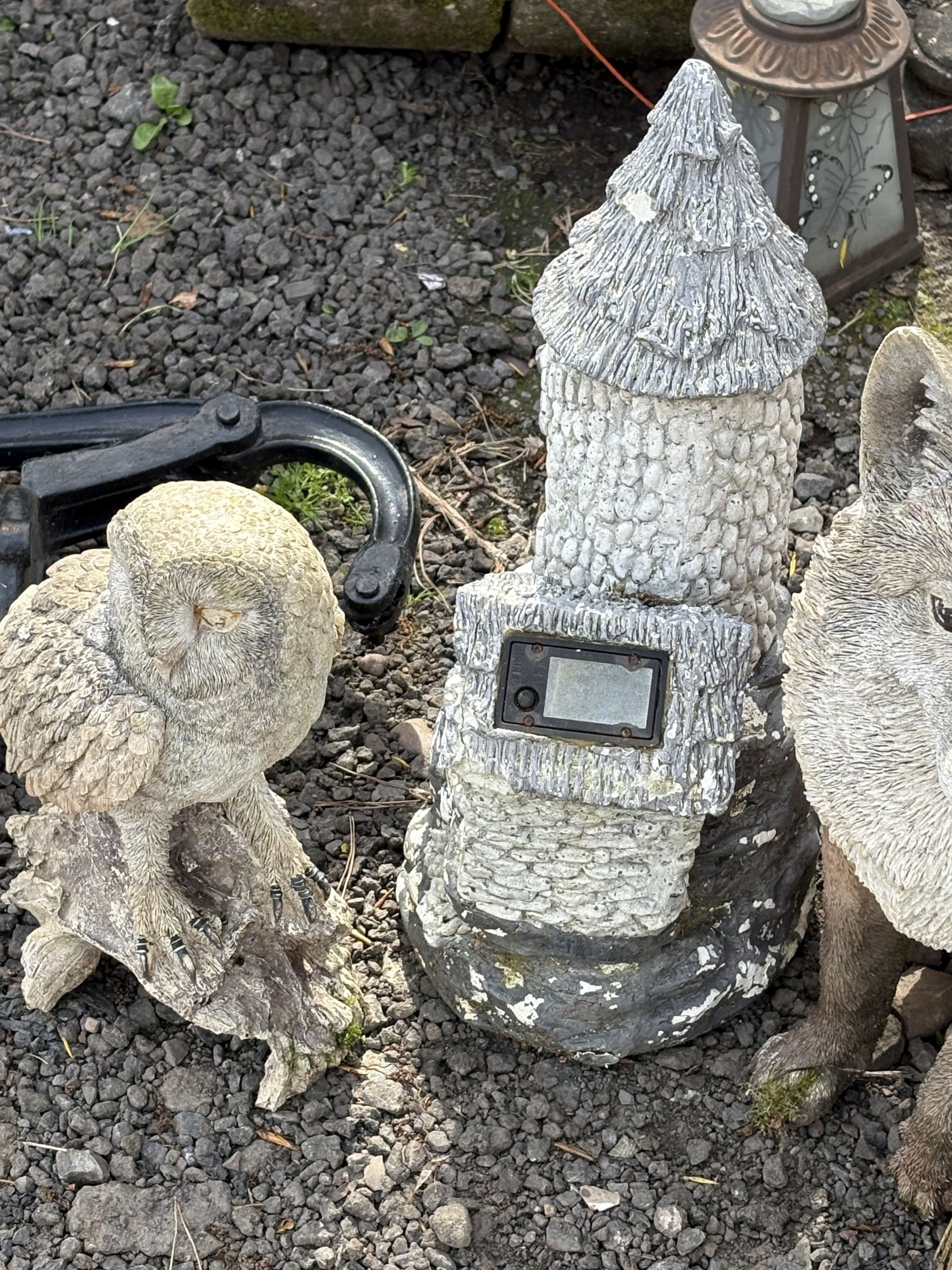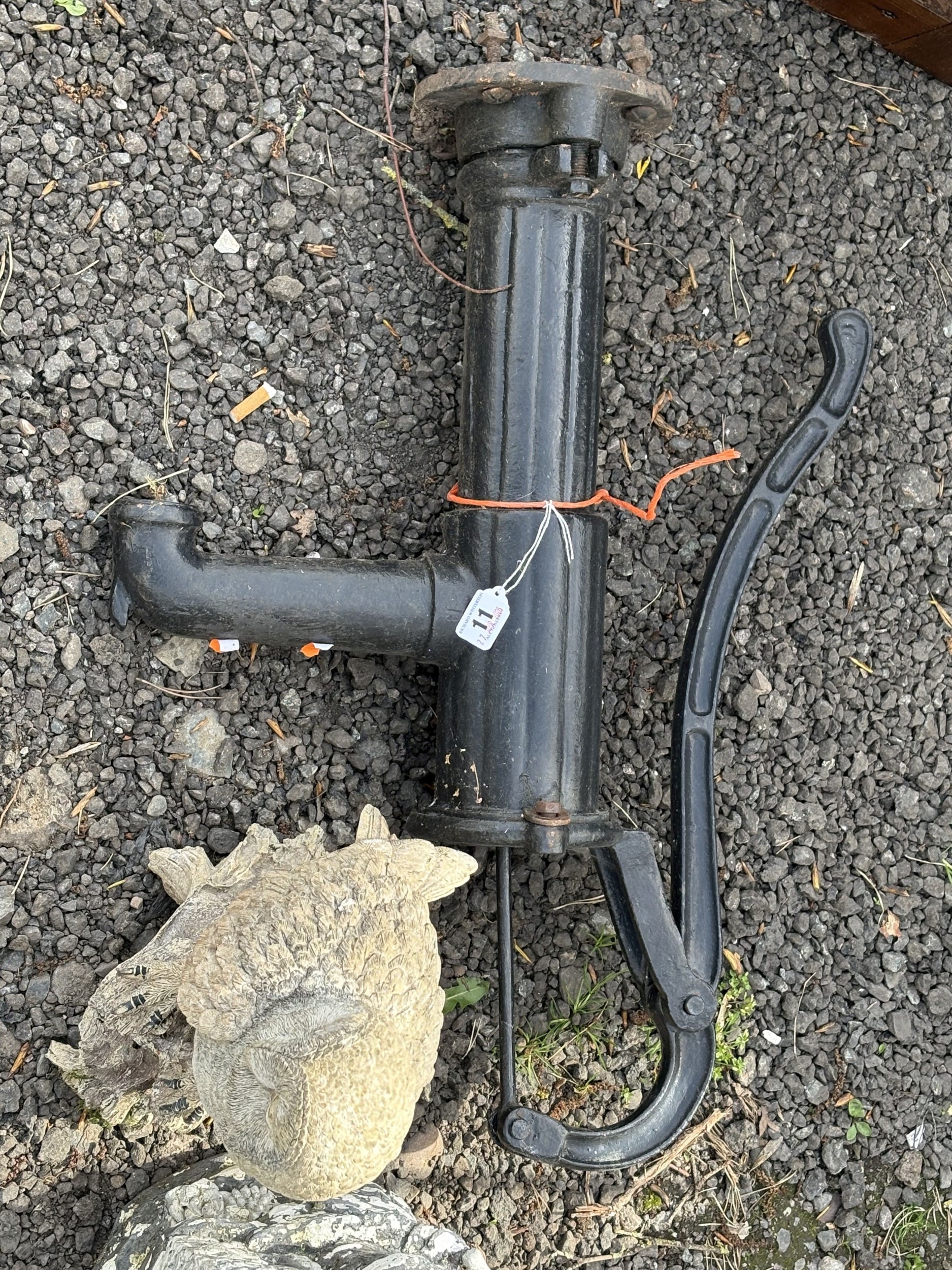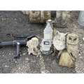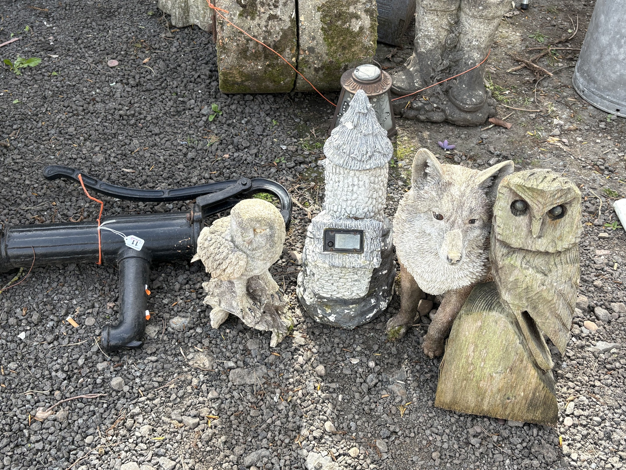 A CAST IRON WATER PUMP, along with three plastic garden items including a fox, owl and stone house, along with a carved wood owl (5)