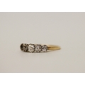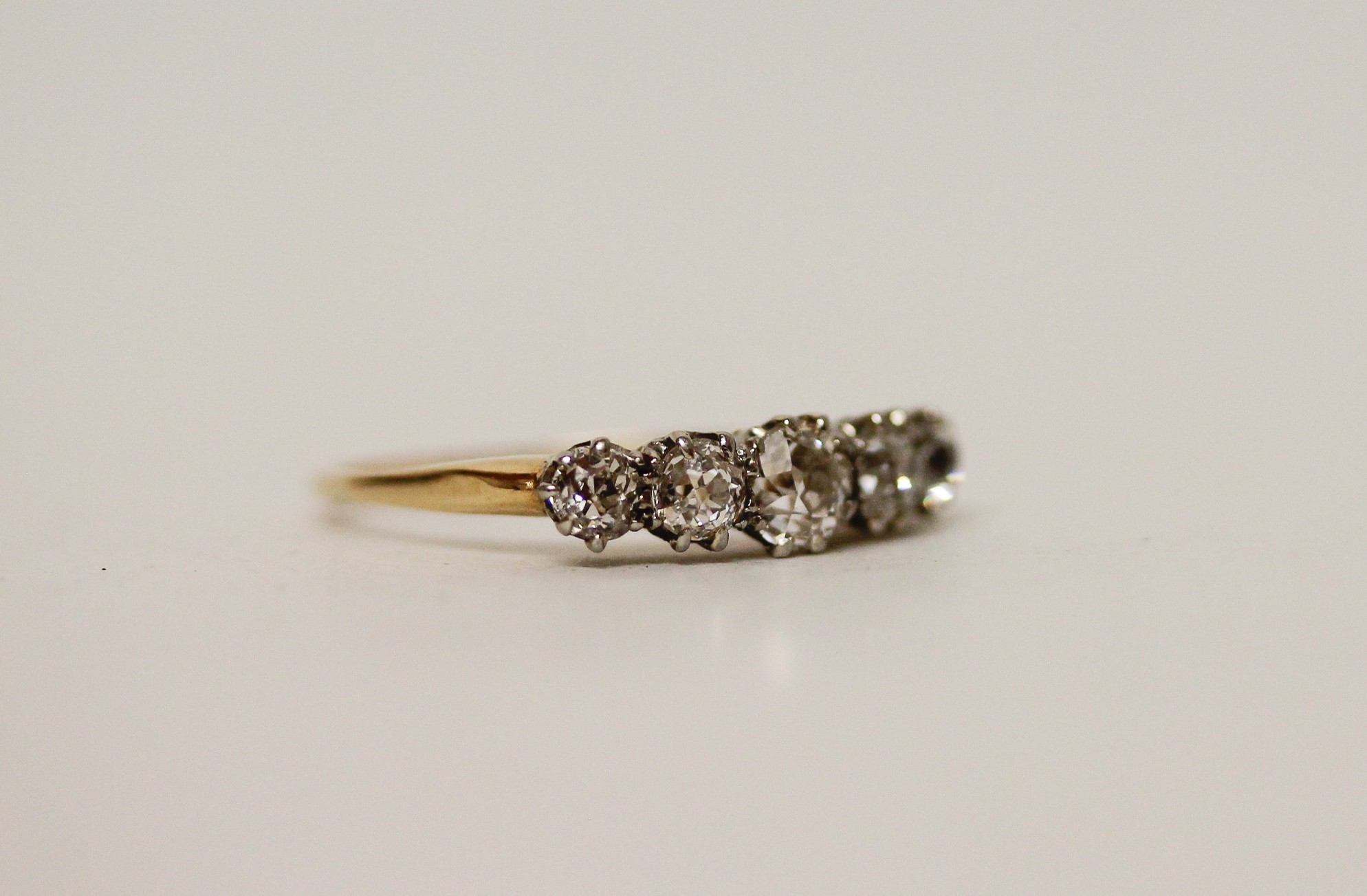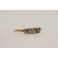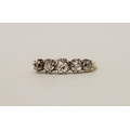 An antique five stone diamond ring on unmarked gold band, presumed to be 18ct, ring size L/M, 1.7 grams