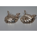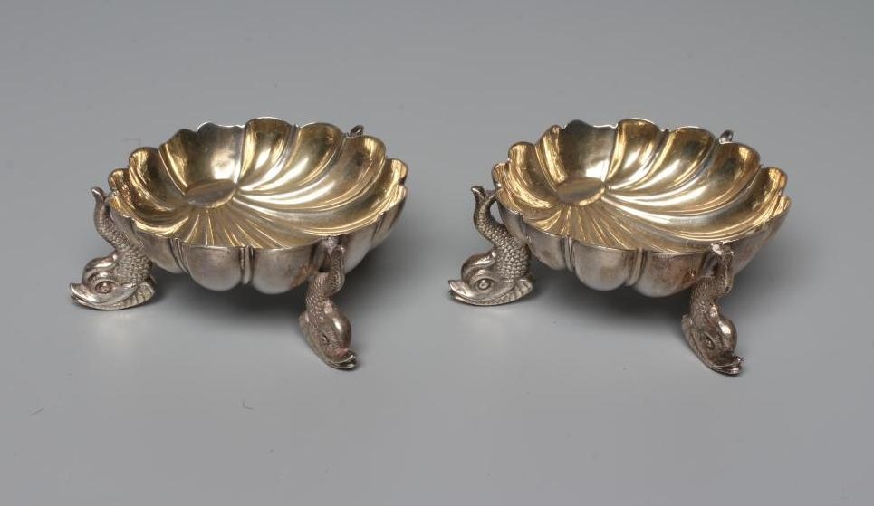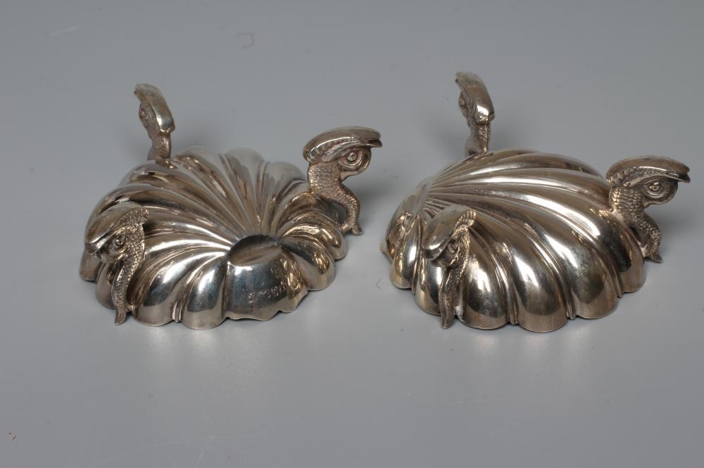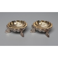 A PAIR OF VICTORIAN SILVER SHELL SALTS by Henry Hall & John Edward Bingham, Sheffield 1868, raised upon three cast dolphin supports, shell 2 1/2" wide, 3ozs 16dwts total