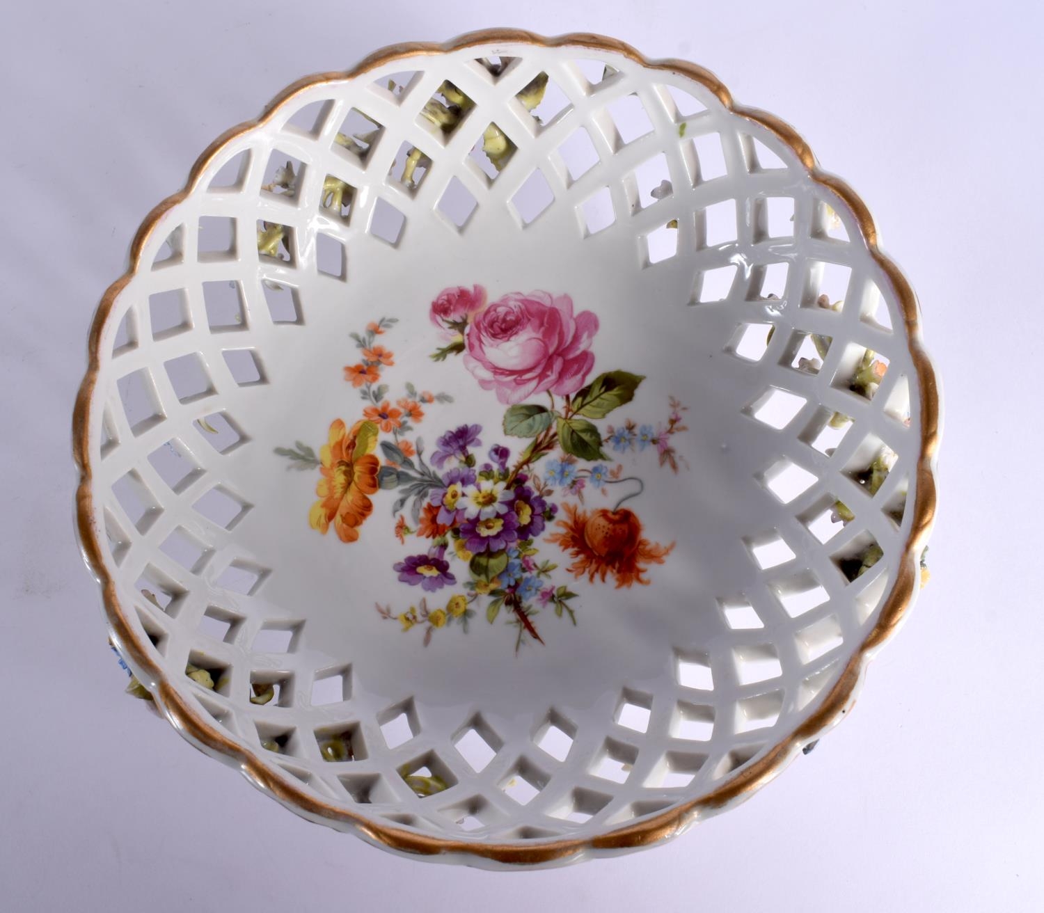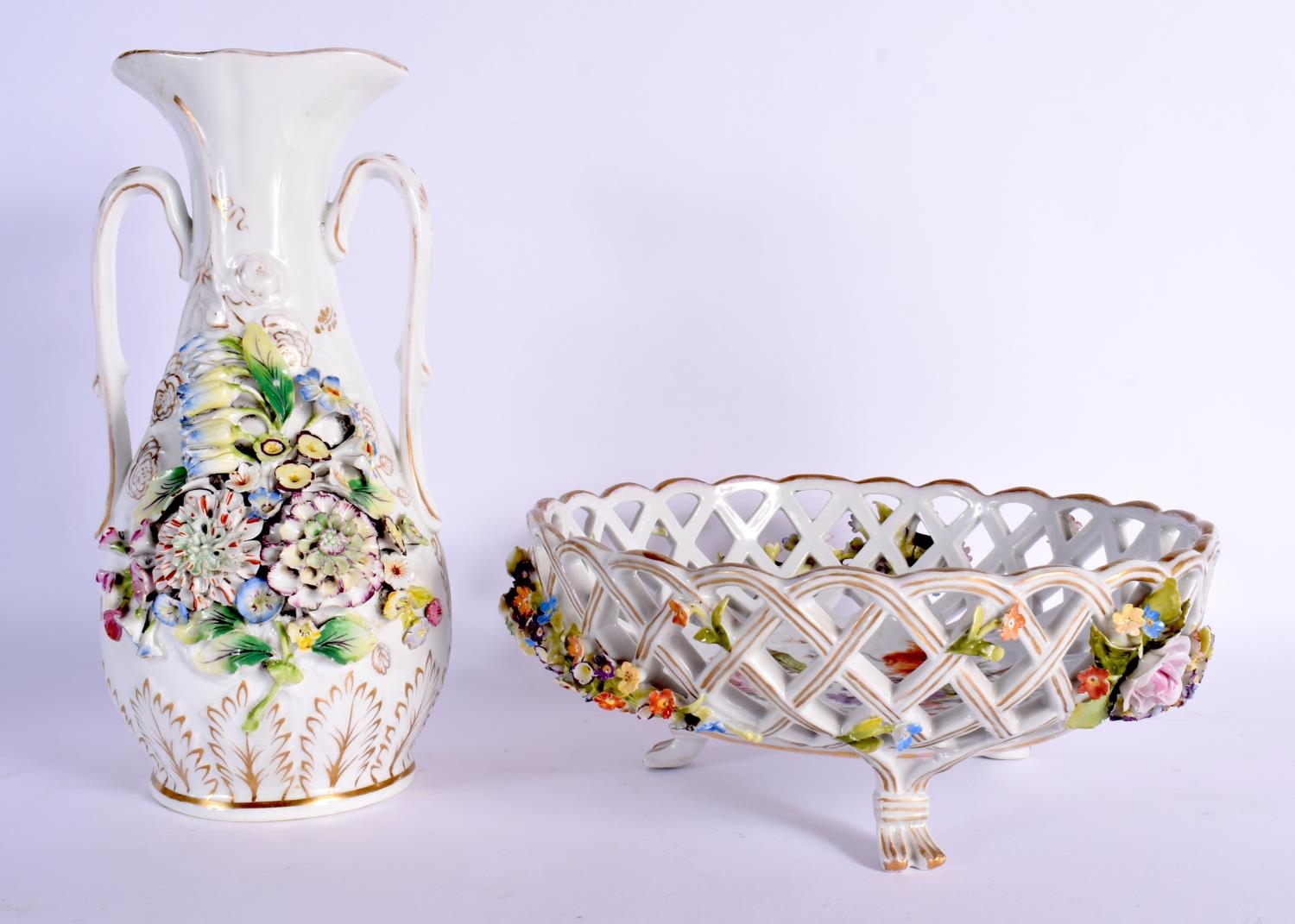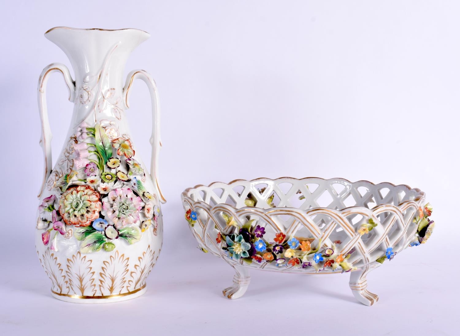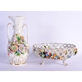A CONTINENTAL RETICULATED PORCELAIN BASKET together with a twin handled encrusted porcelain vase. Largest 26 cm high. (2)
