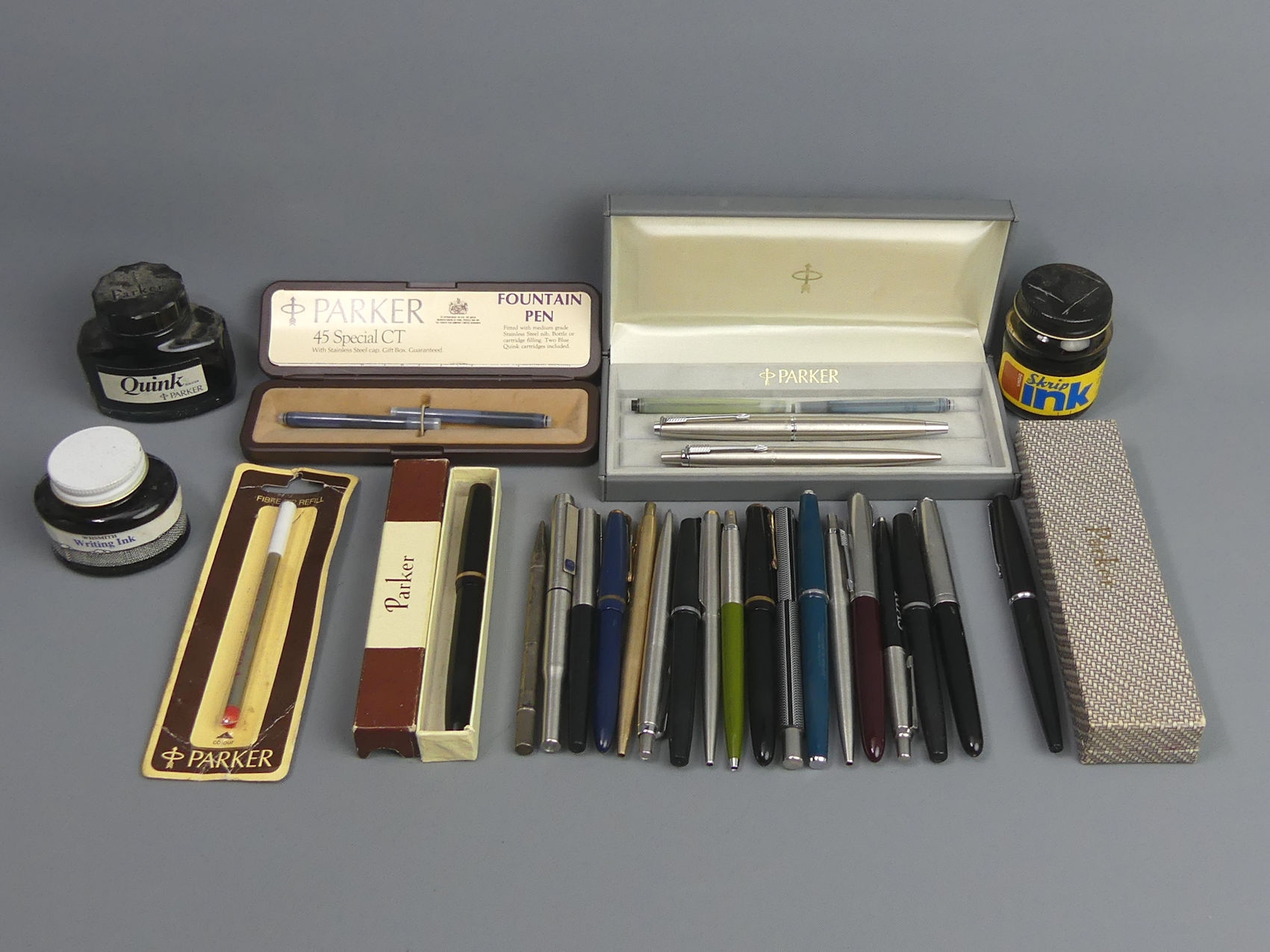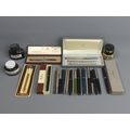 Various vintage pens and ink pots, including a maroon Parker 51. UK Postage £15.