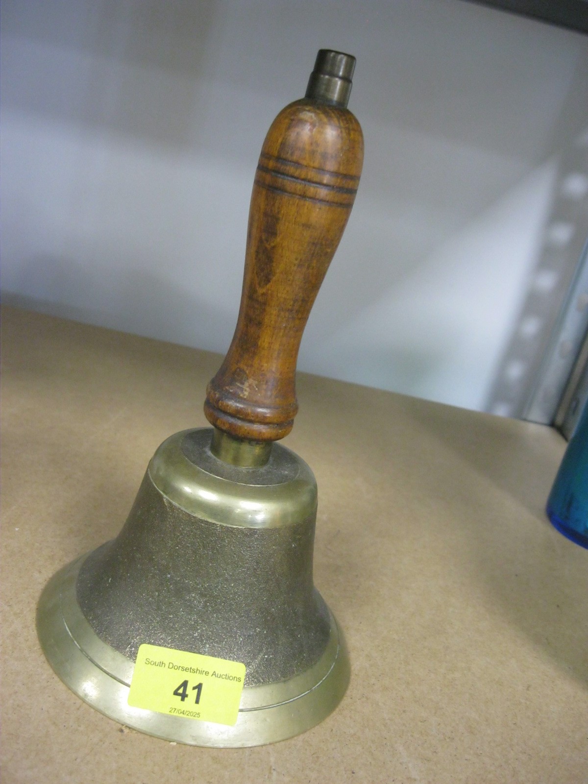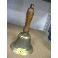 Brass school type Bell with wooden handle approx 8 inches tall.