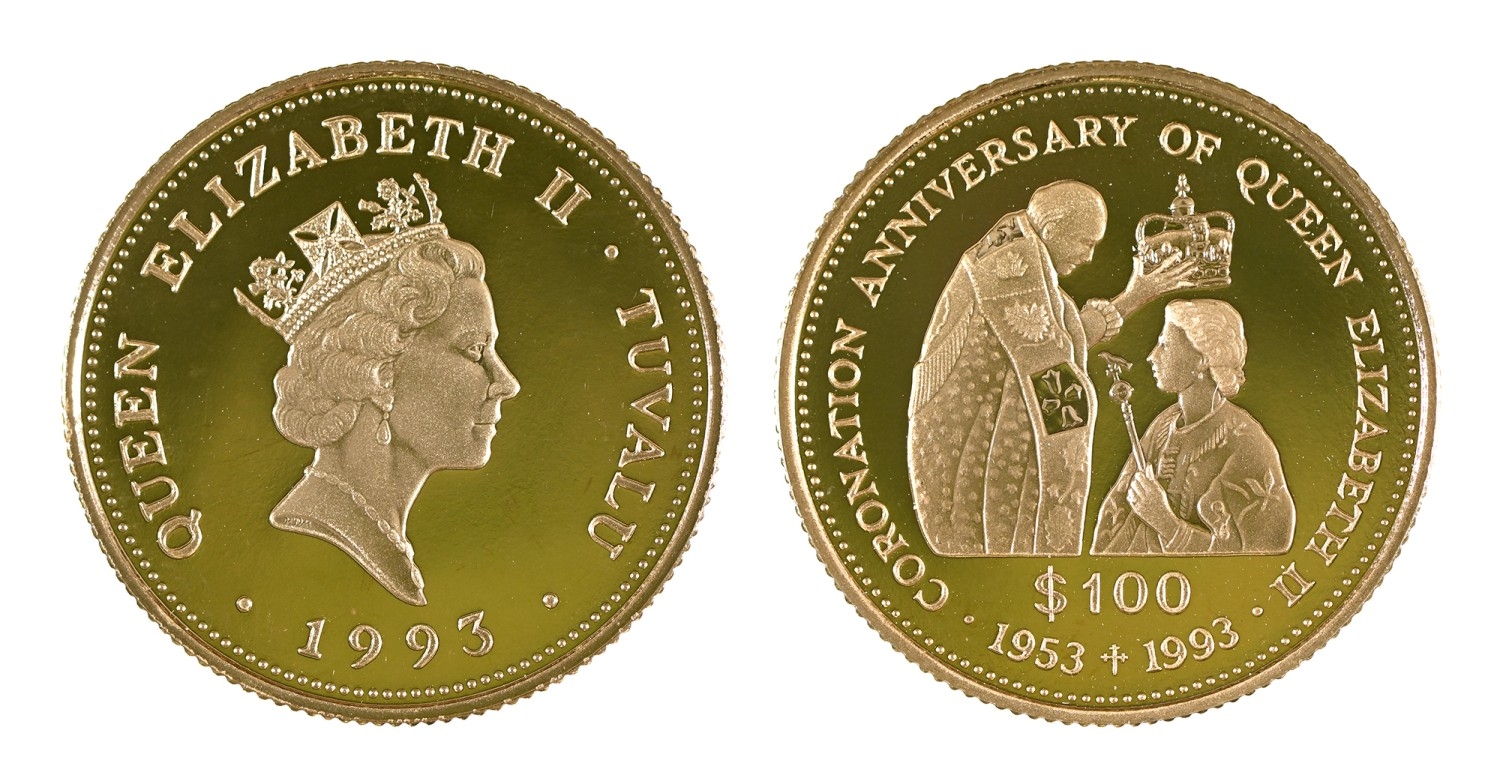 Gold coin. Tuvalu commemorative One Hundred Dollars 1993, 0.583, 7.8g