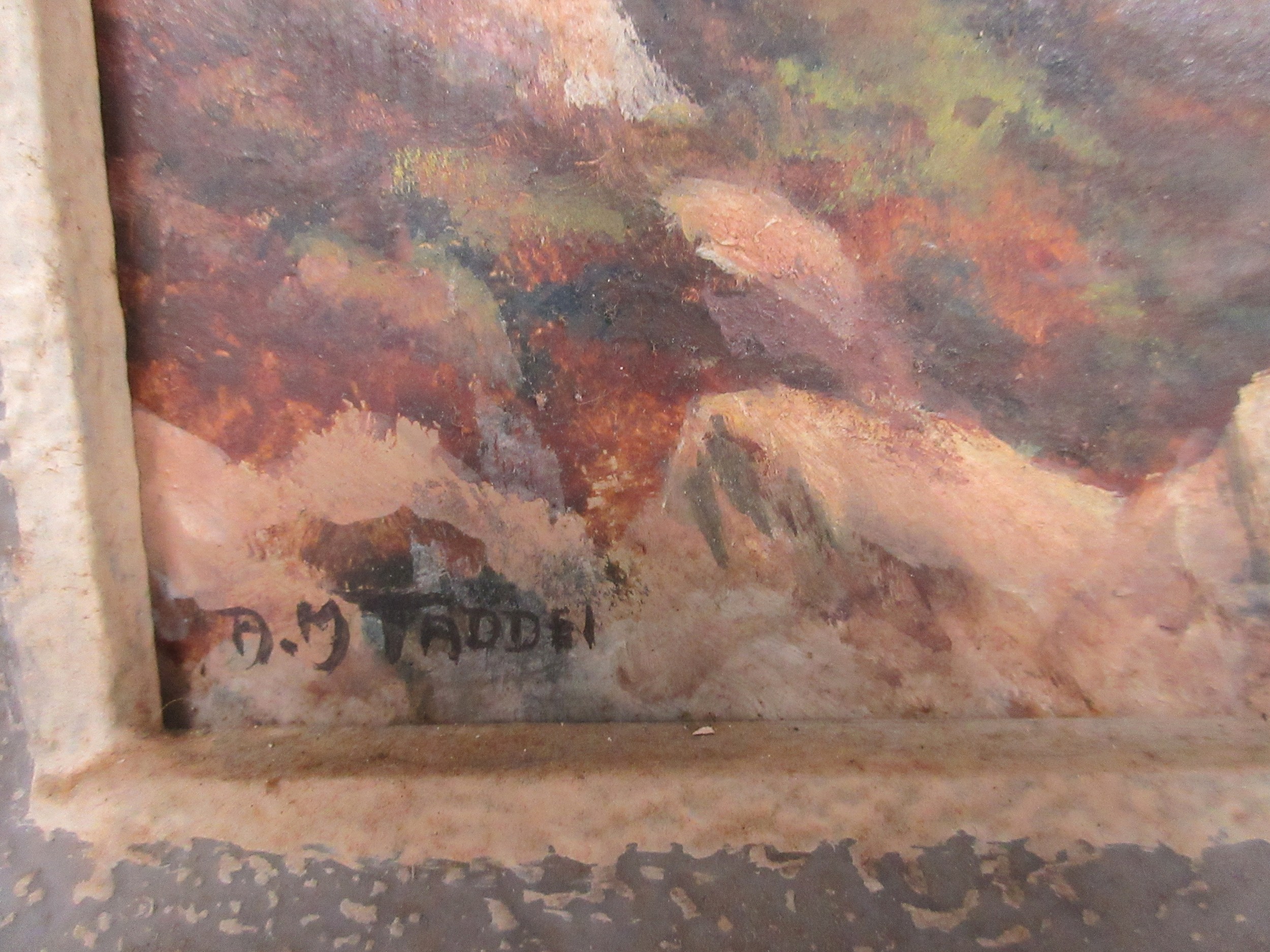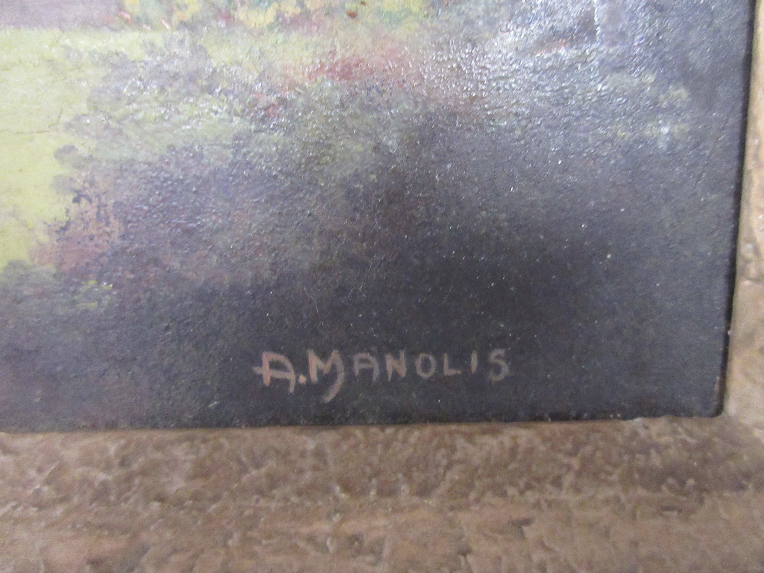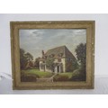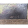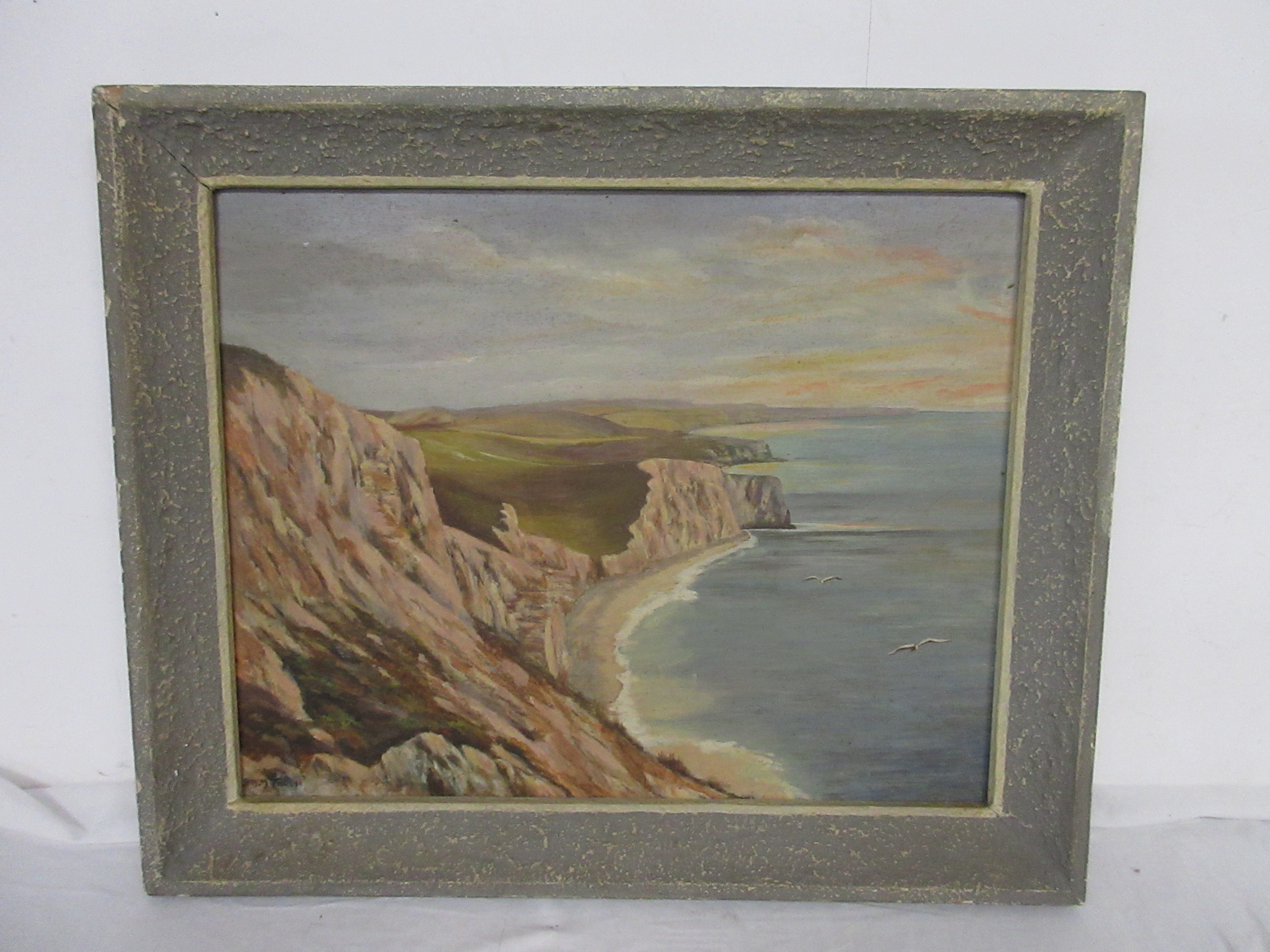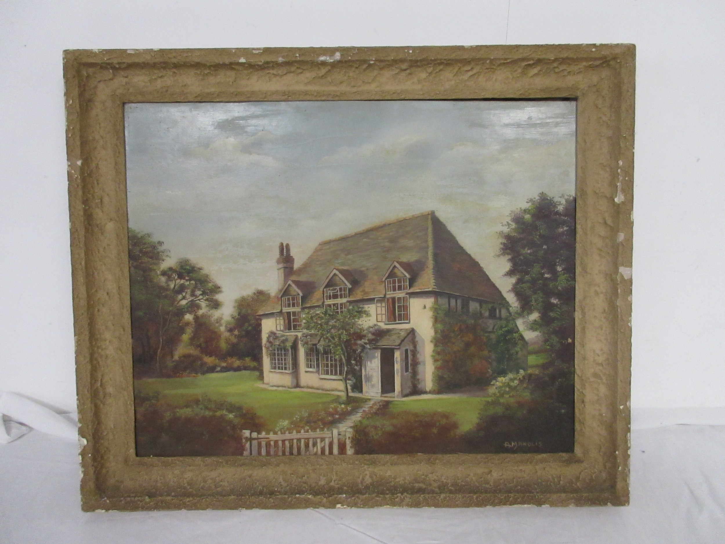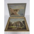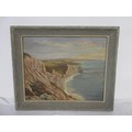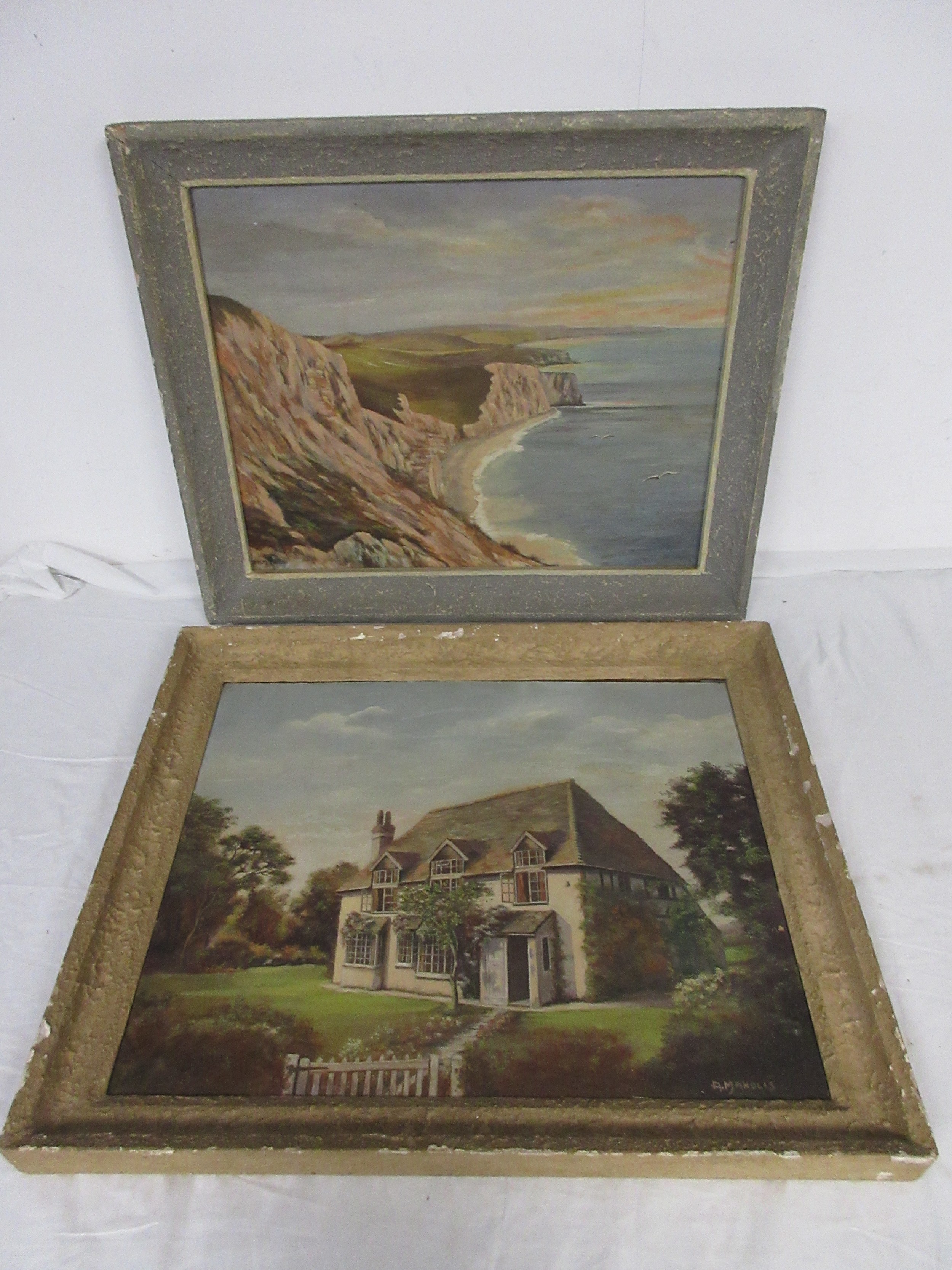 A pair of artworks, one featuring a local coastal scene looking towards St Aldhelm's Head, the other of a house, signed respectively A M Tadden and A Manolis, both oil on board, framed