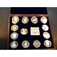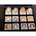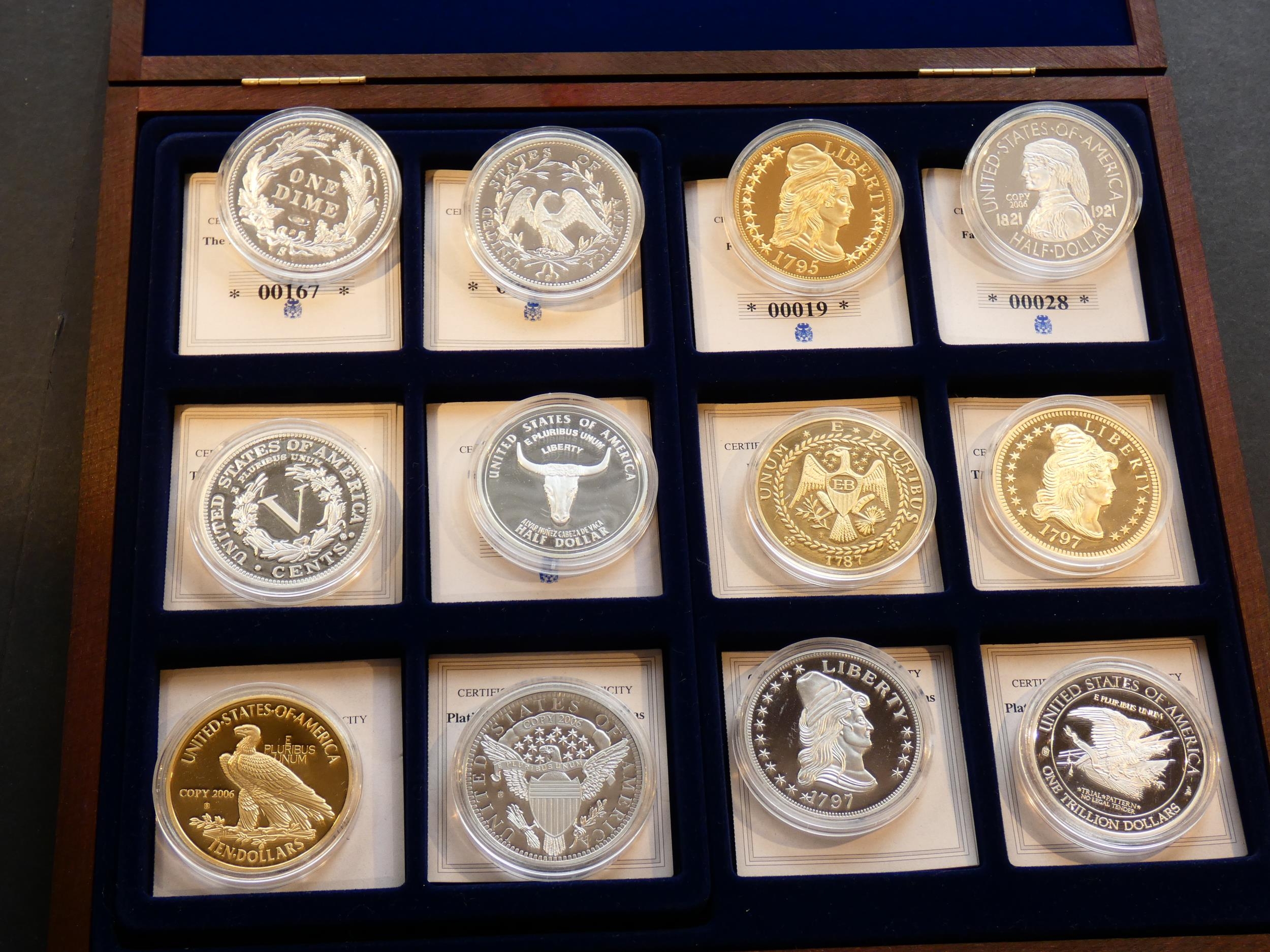 REPLICAS. "Famous US Coin Replicas", collection of twelve silver-plated, gilt, or platinum-plated replicas of iconic US coins, including Barber Dime 1894S, "Flowing hair" Dollar 1794, 1795 ½-Eagle, 1921 Missouri Centennial 50 Cents, 1913 "Liberty" Nickel, 1935 Old Spanish Trail (Texas Centennial)( 50 Cents, 1787 Brasher Doubloon, 1797 $5 ½-Eagle, 1907 Eagle $10, 1796 ¼-Eagle, 1797 "turban head" Eagle, and 2013 fantasy "1 Trillion Dollars", each 40mm Proofs,, FDC, stamped COPY, in wooden presentation case, with certificates.