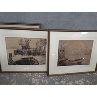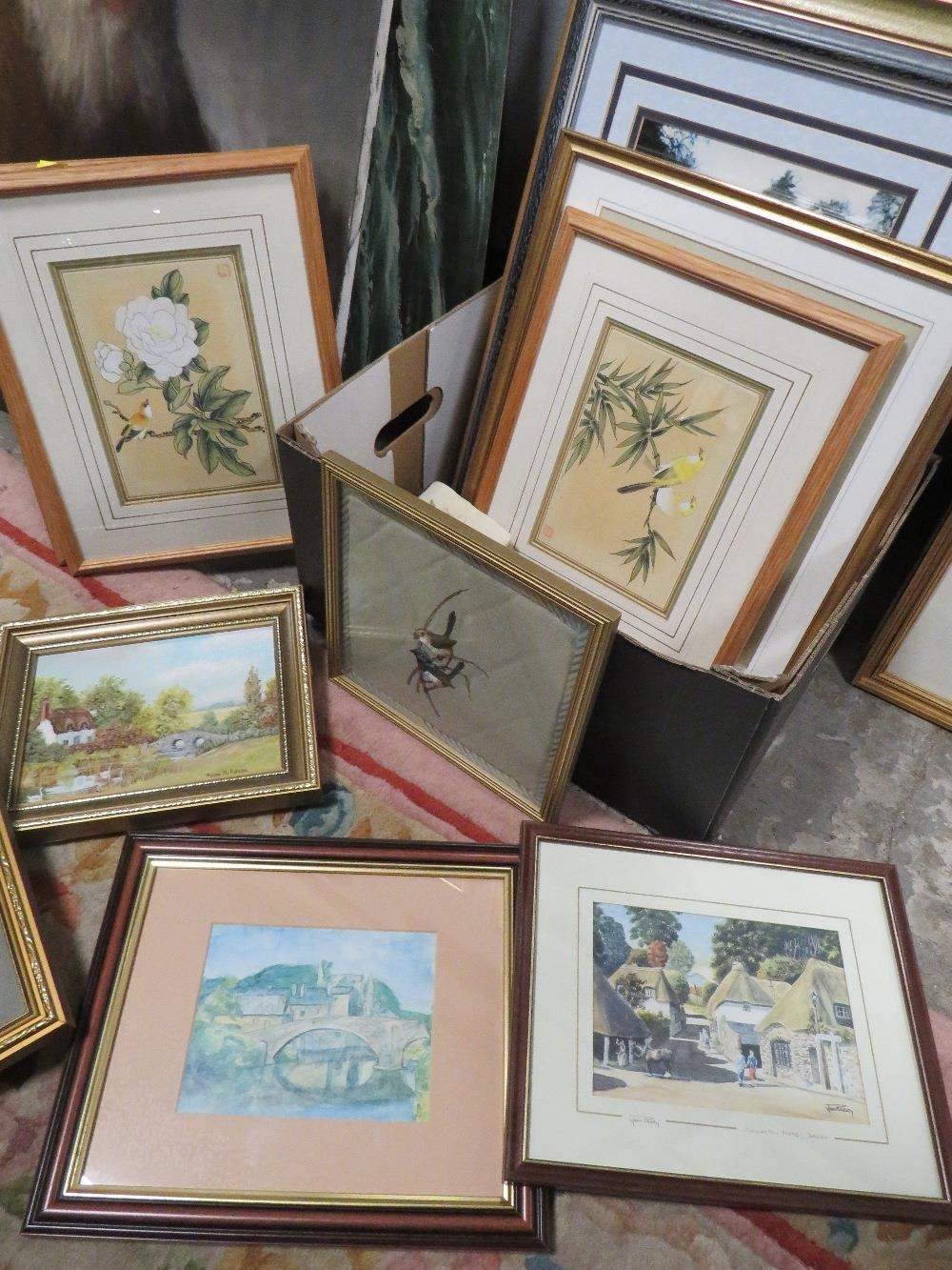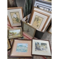 A TRAY OF ASSORTED FRAMED PICTURES AND PRINTS ETC