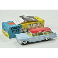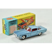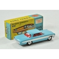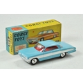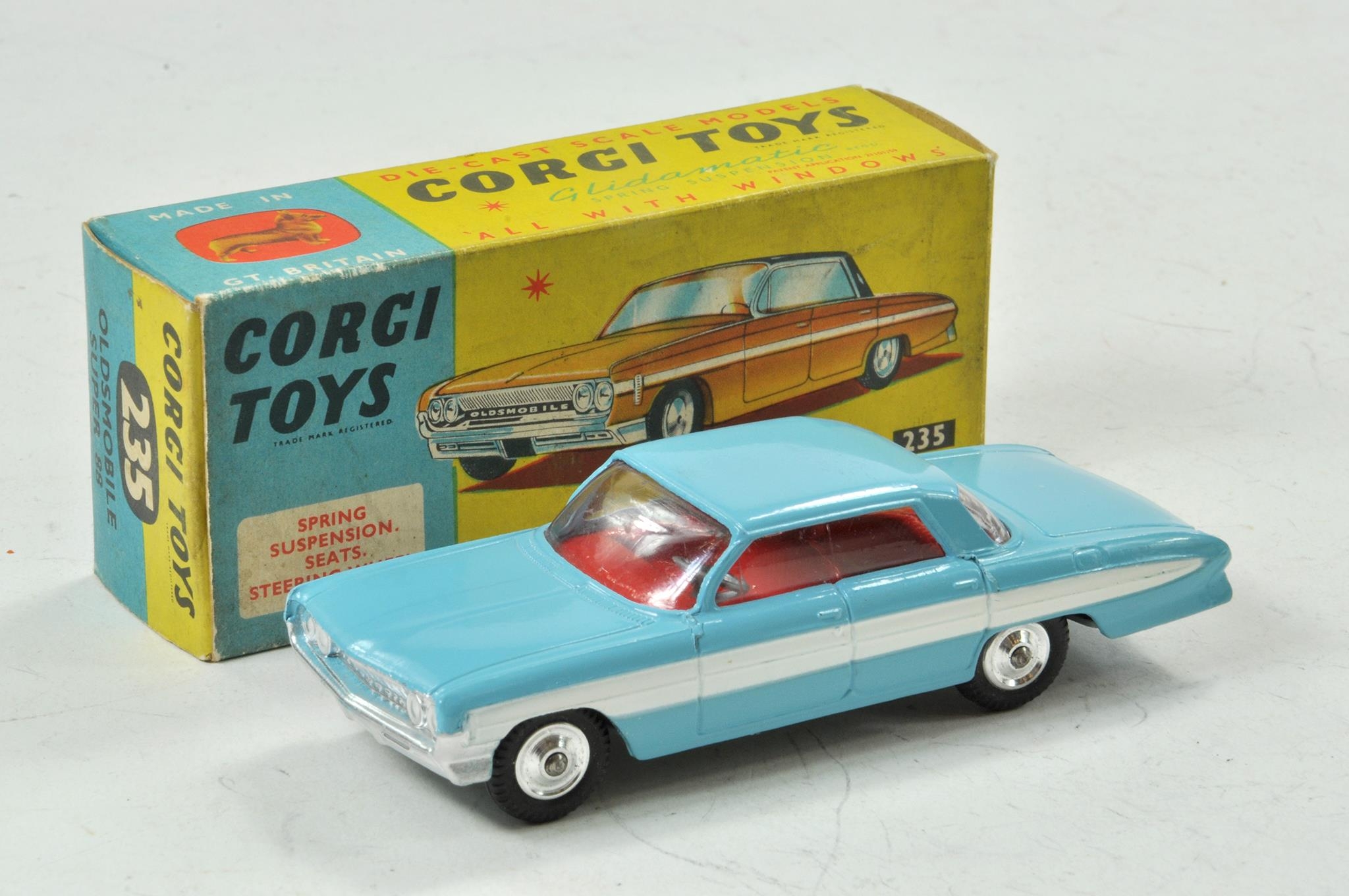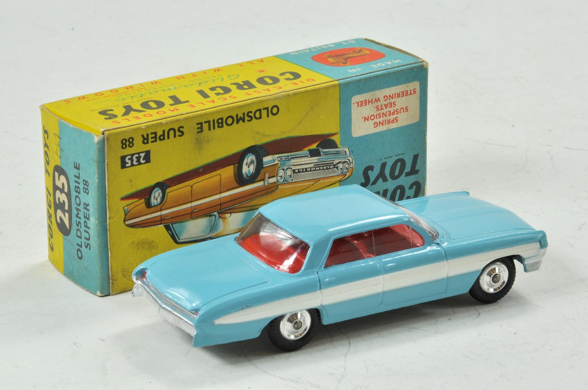 Corgi No. 235 Oldsmobile Super 88. Light blue body with red interior. White side stripe flash. Spun hubs. Appears excellent with little if any notable marks present contained in good to very good (slight grubby) original box.