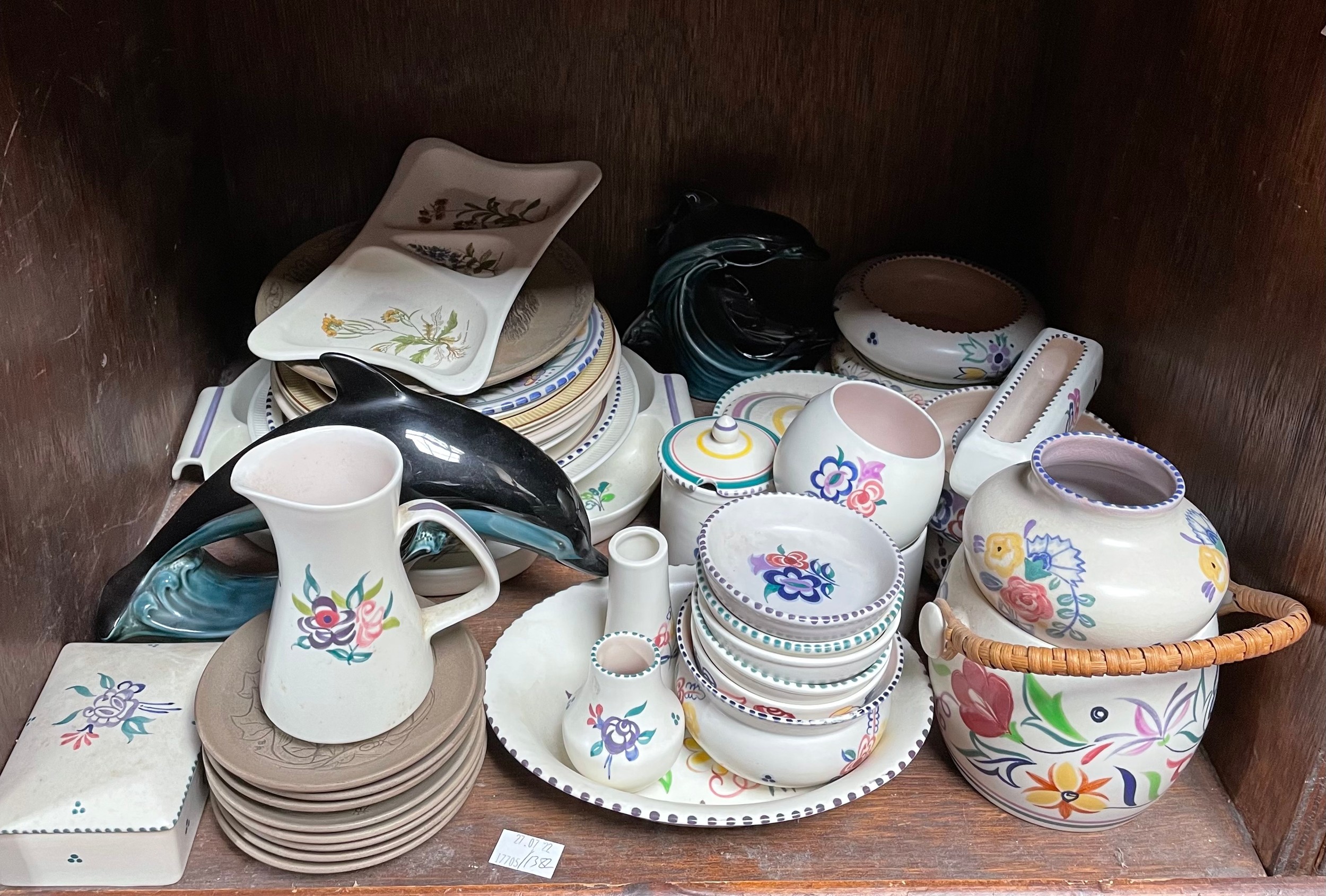 A collection of approximately 45 pieces of assorted Poole Pottery items, including plates, dolphin figures, vases, pot and covers and jugs etc. various marks and monograms to bases (SECTION 44)