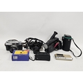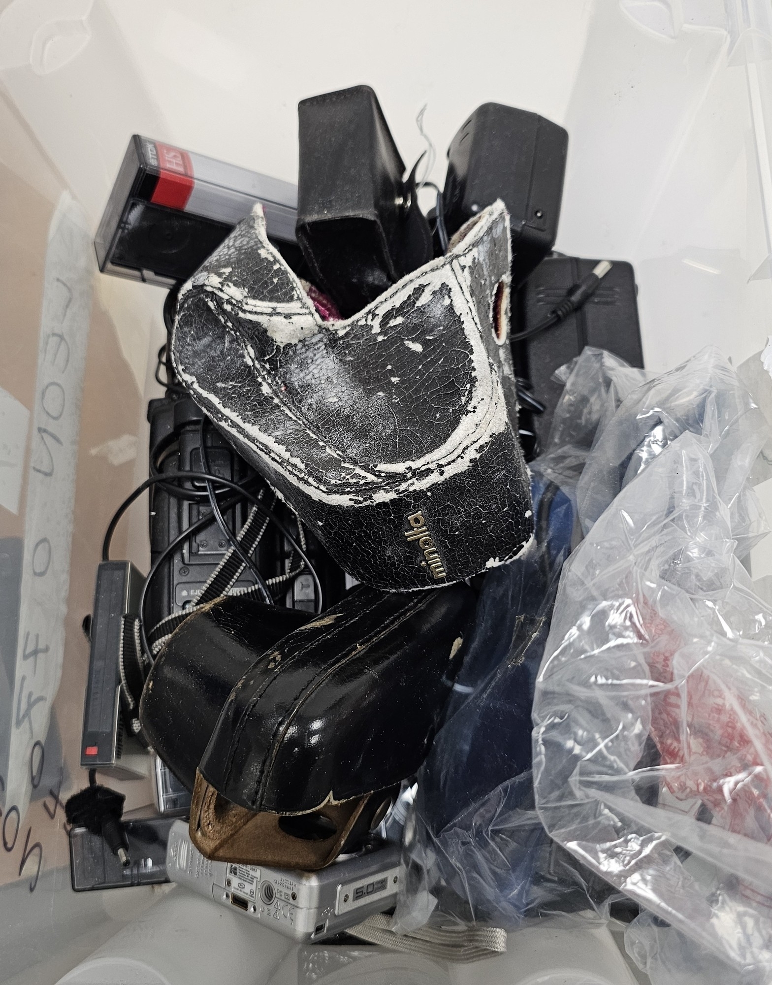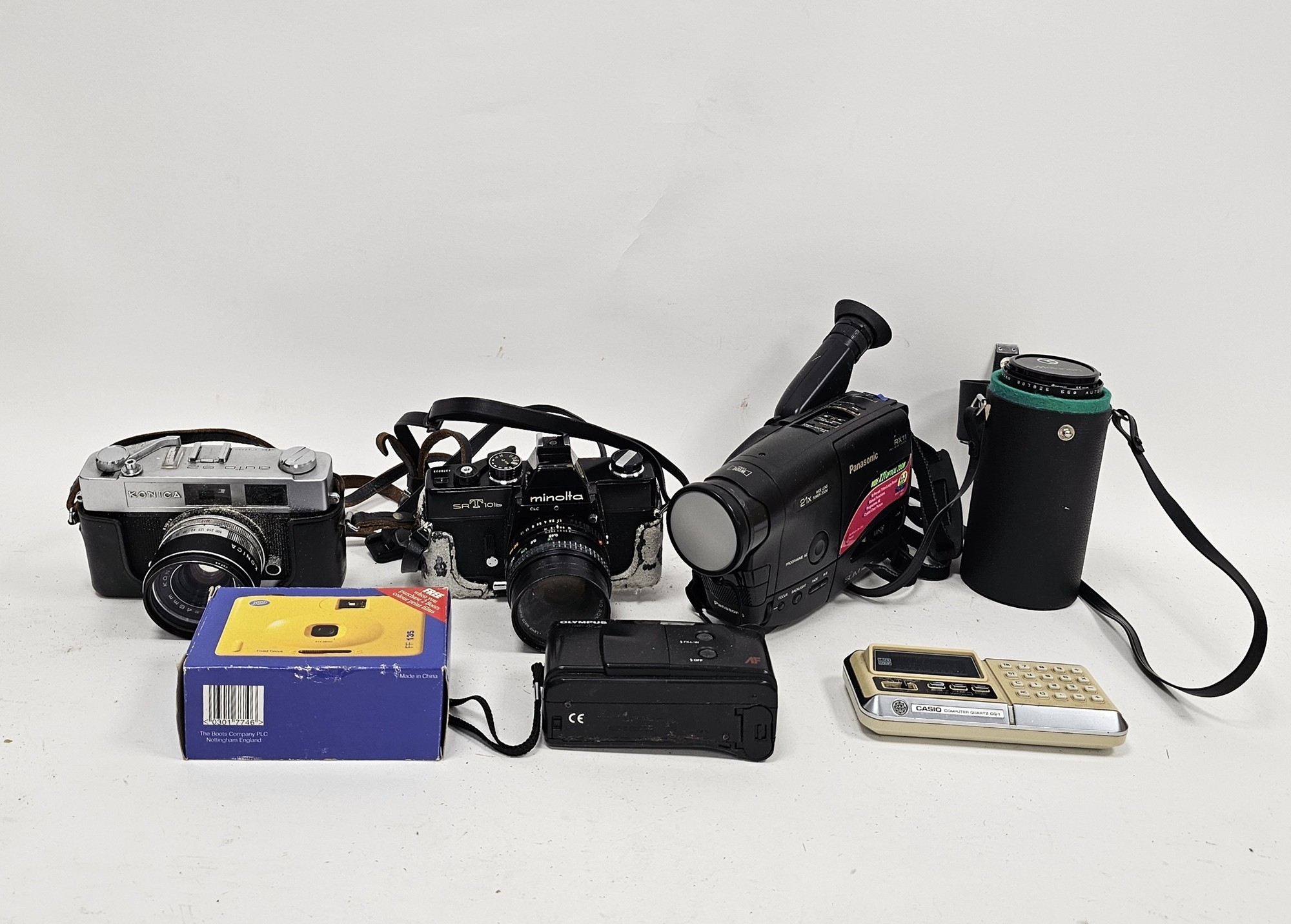 Collection of camera and equipment including Konica Auto S2 camera, Minolta SRT101b camera, cased Makinon Aroma 55mm lens, Canonvision E60 camcorder, Panasonic RX11 camcorder, Olympus Trip AF20,