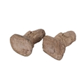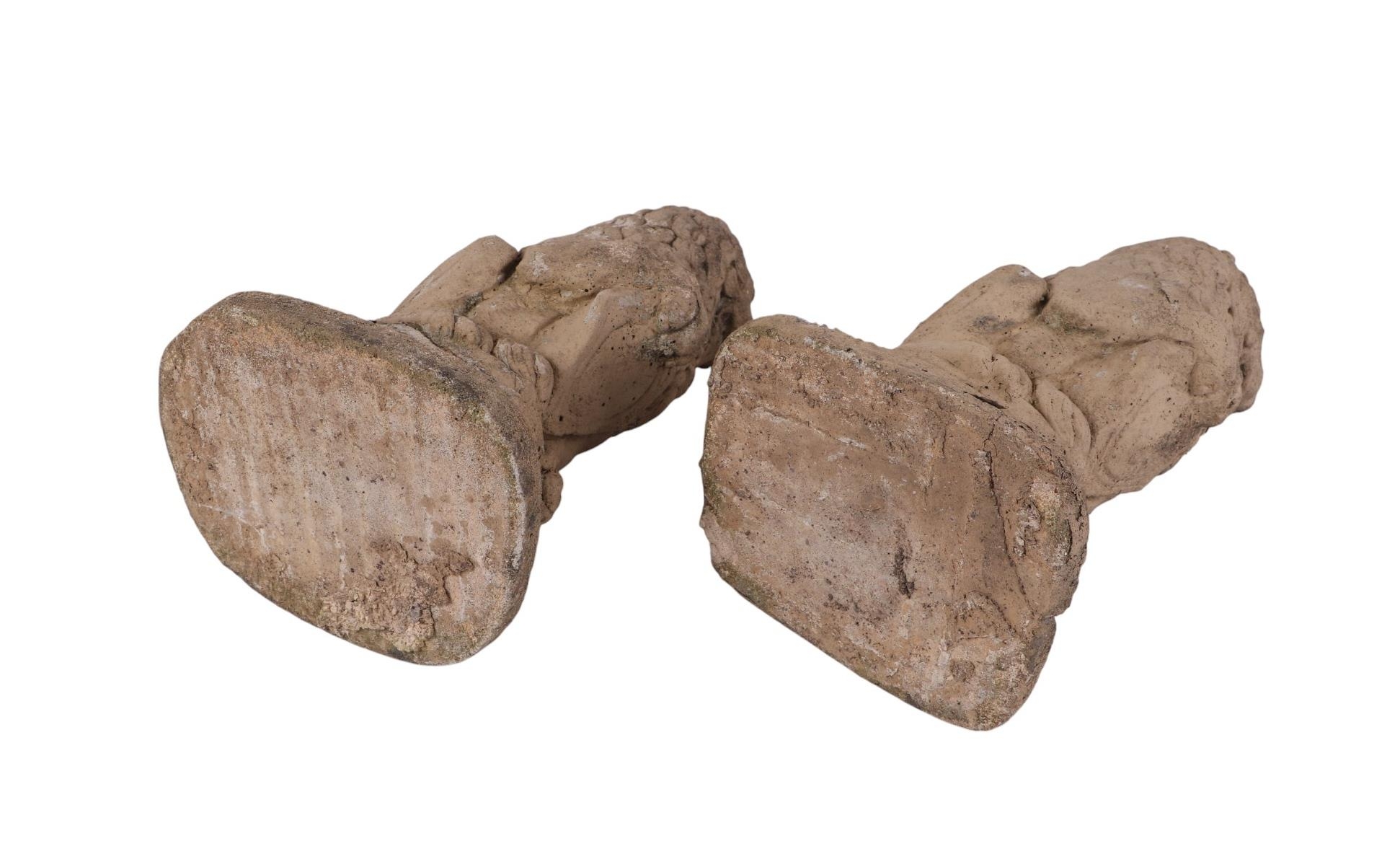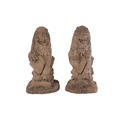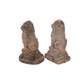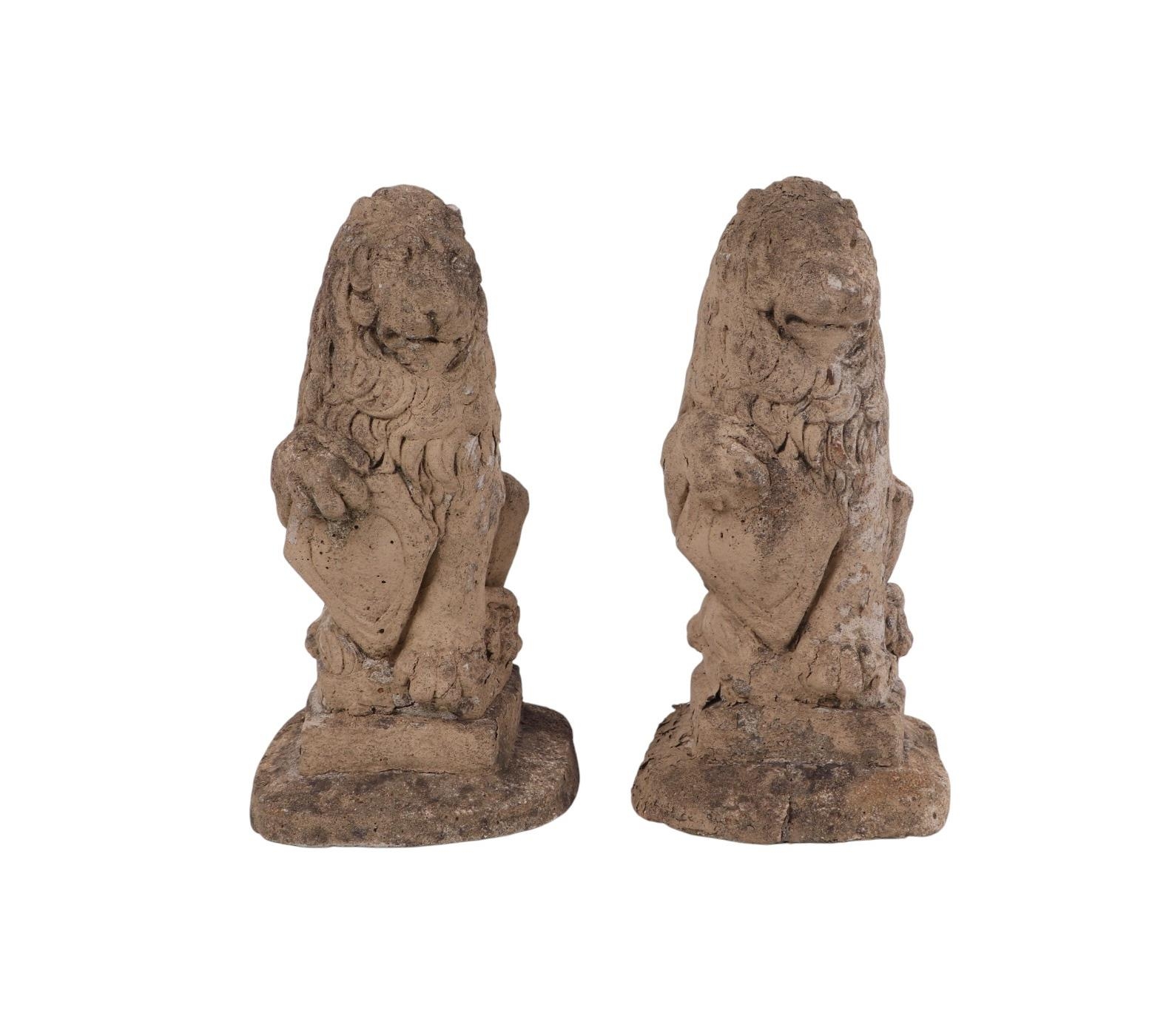 A pair of small stoneware garden heraldic lions, 21cms high.