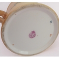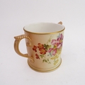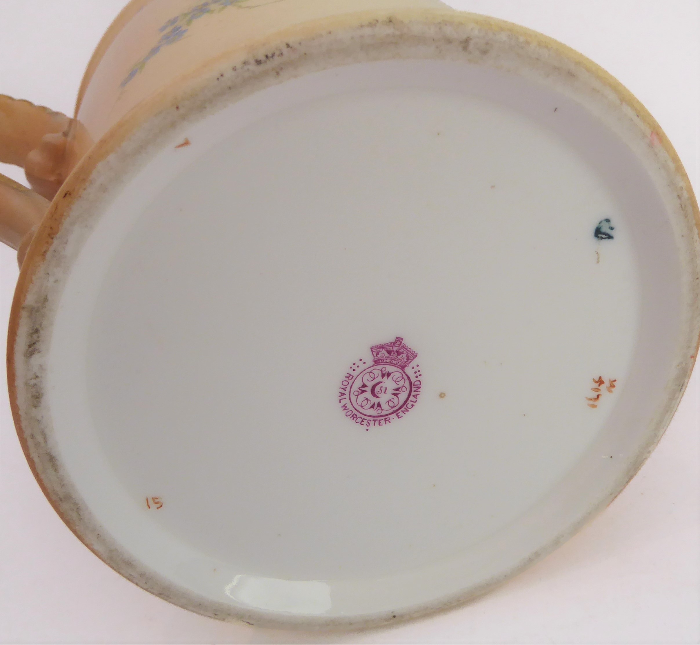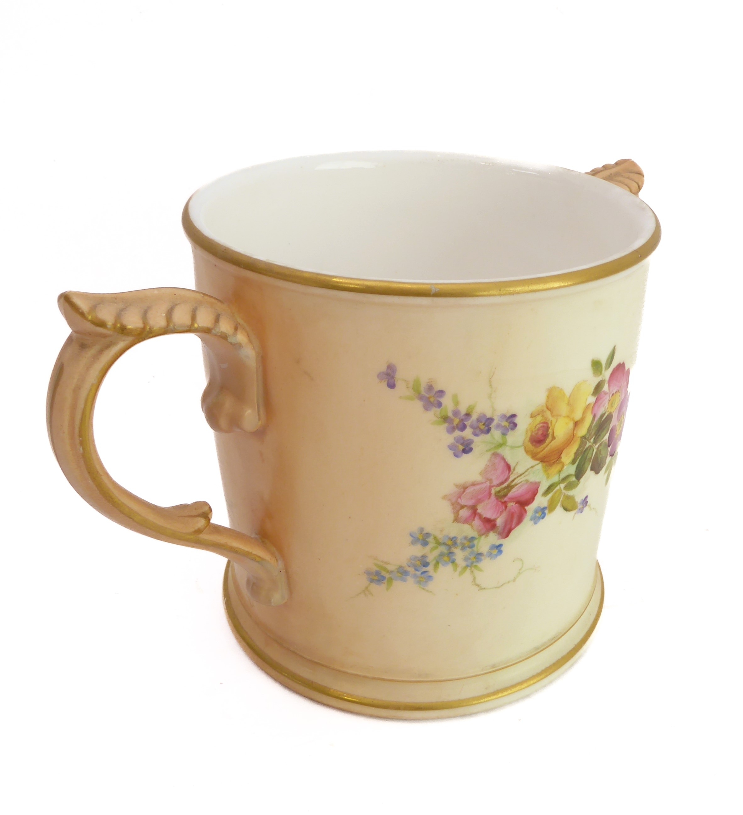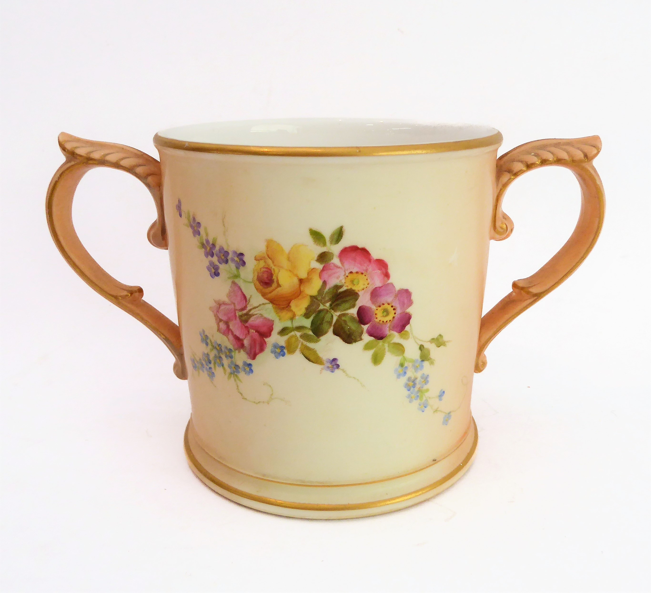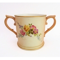 An early 20th century Royal Worcester blush porcelain loving cup: two-handled and hand-decorated in enamels with floral sprays; printed and painted marks to underside. (Approx. 11 cm in diameter excluding handles.)