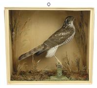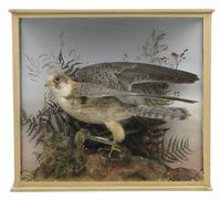 ***Withdrawn from sale***Pair of Edwardian stuffed taxidermy kestrels housed amongst natural foliage in a glazed case, originally displayed in the Ash Public House, Ashburnham, East Sussex, recased after damage during a World War II V1 rocket explosion