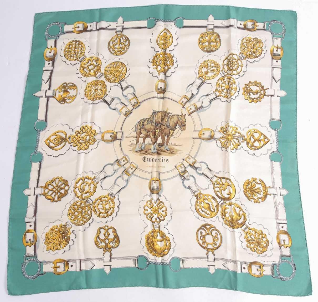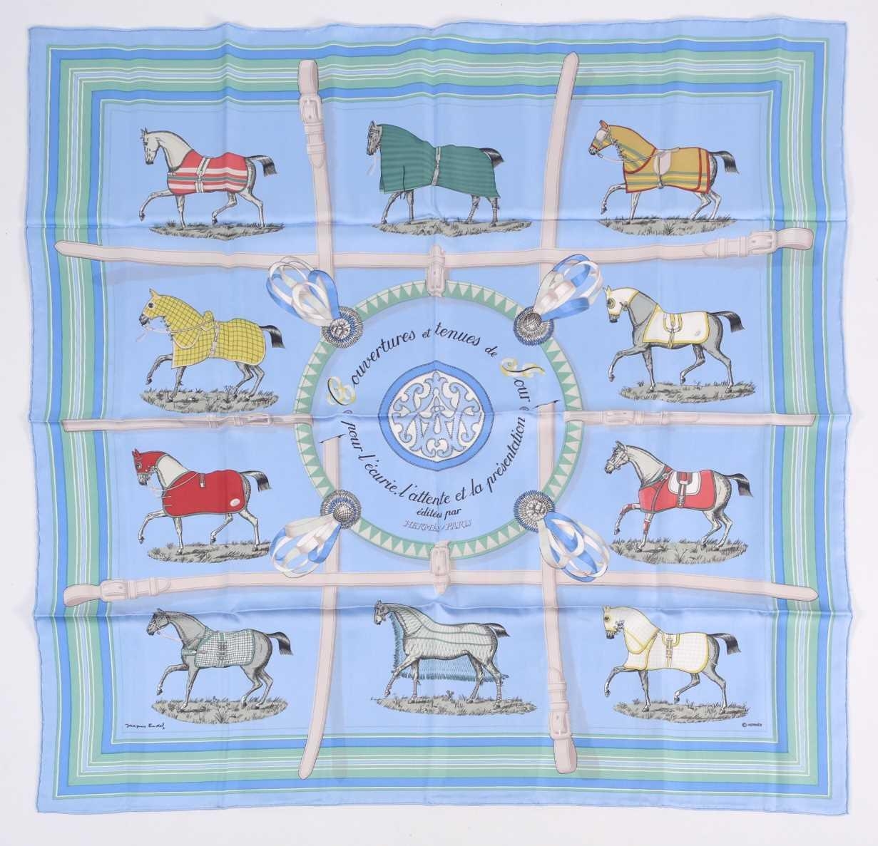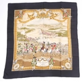 A Hermes silk square scarf printed with the "Guivreries" pattern, together with two other Hermes scarves in the "Les Armees En Campagne" designed by Juan Dolivar and "Couvertures et tenues Jour" (3)