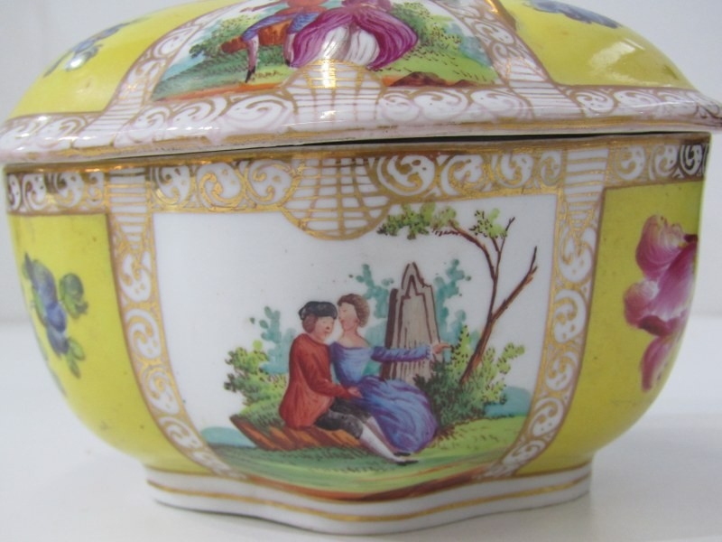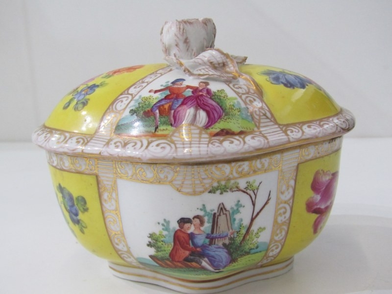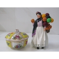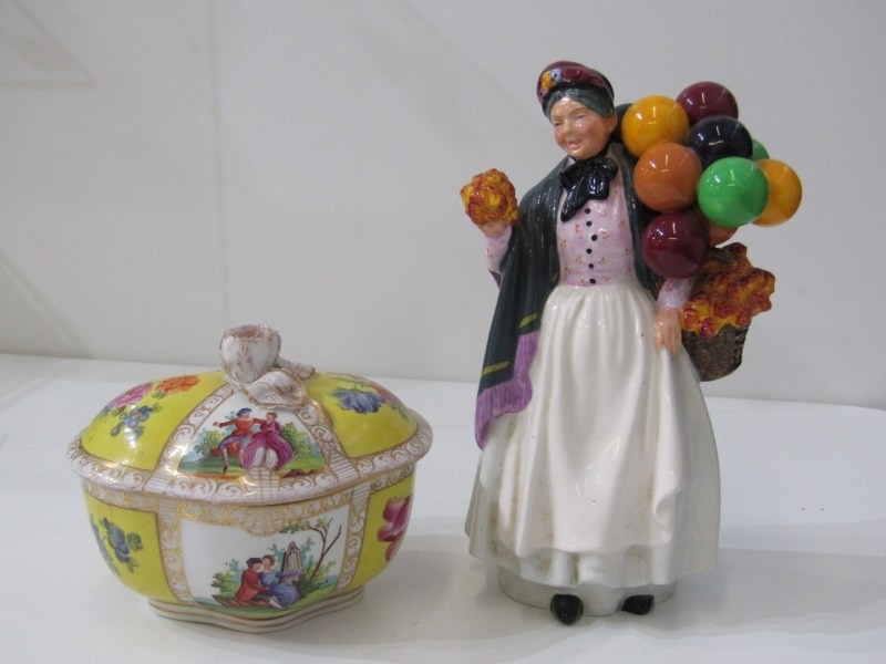 ROYAL DOULTON FIGURE, "Biddy Penny Farthing", HN1843, together with a Continental lidded conserve, decorated cartouches of figures and flowers