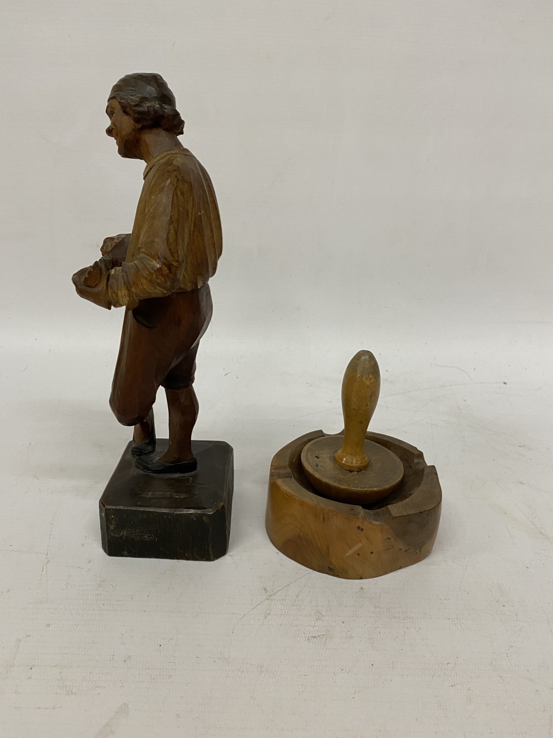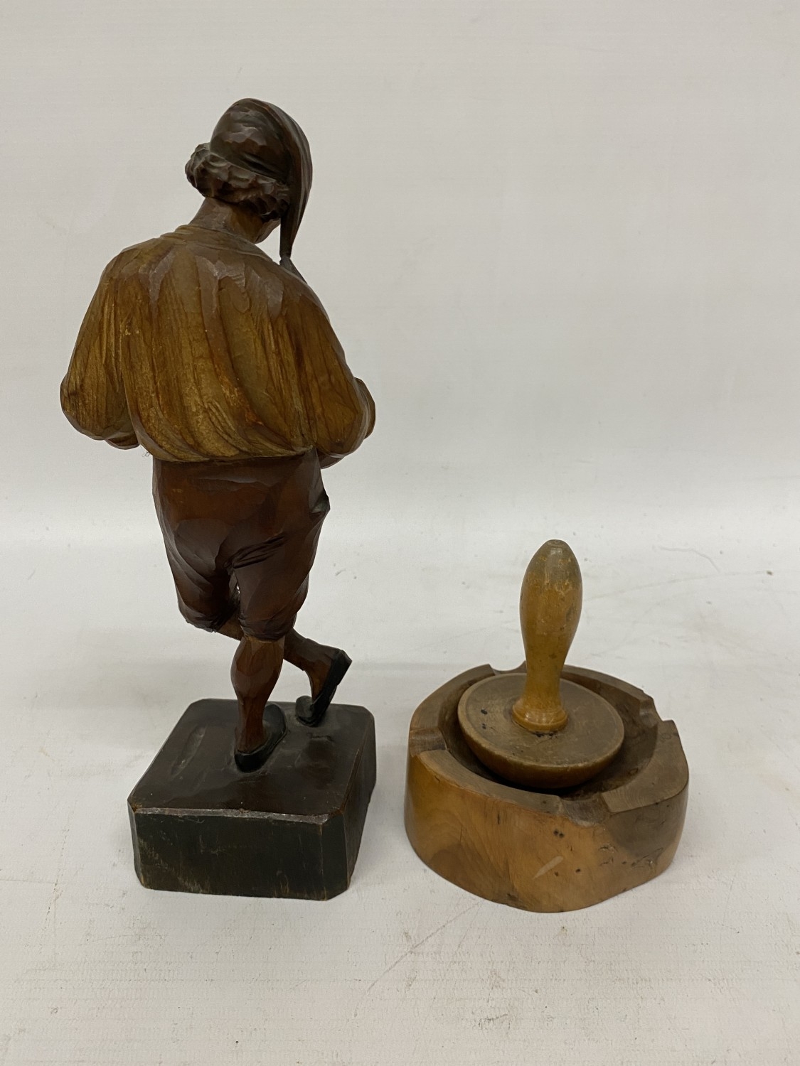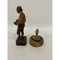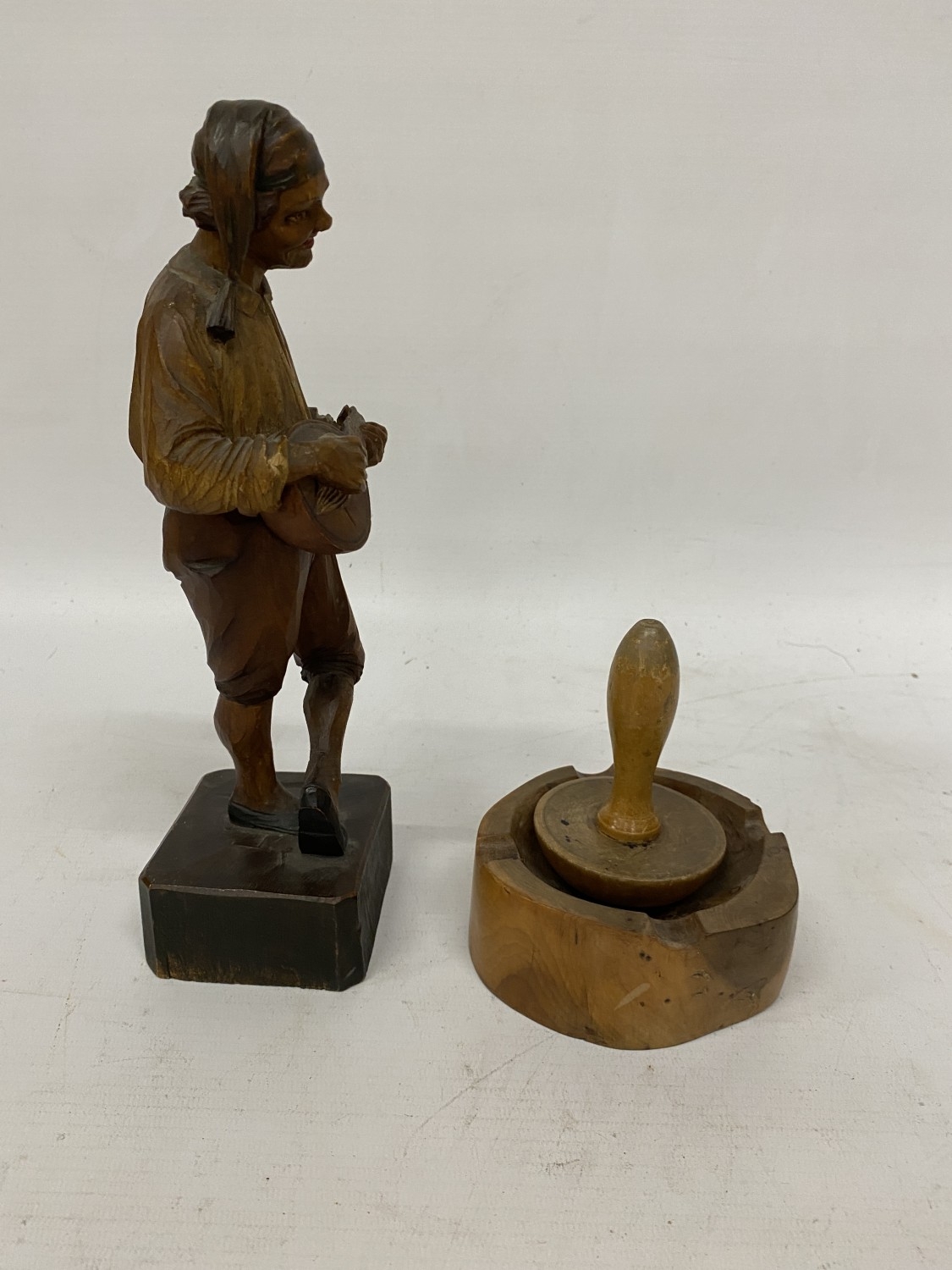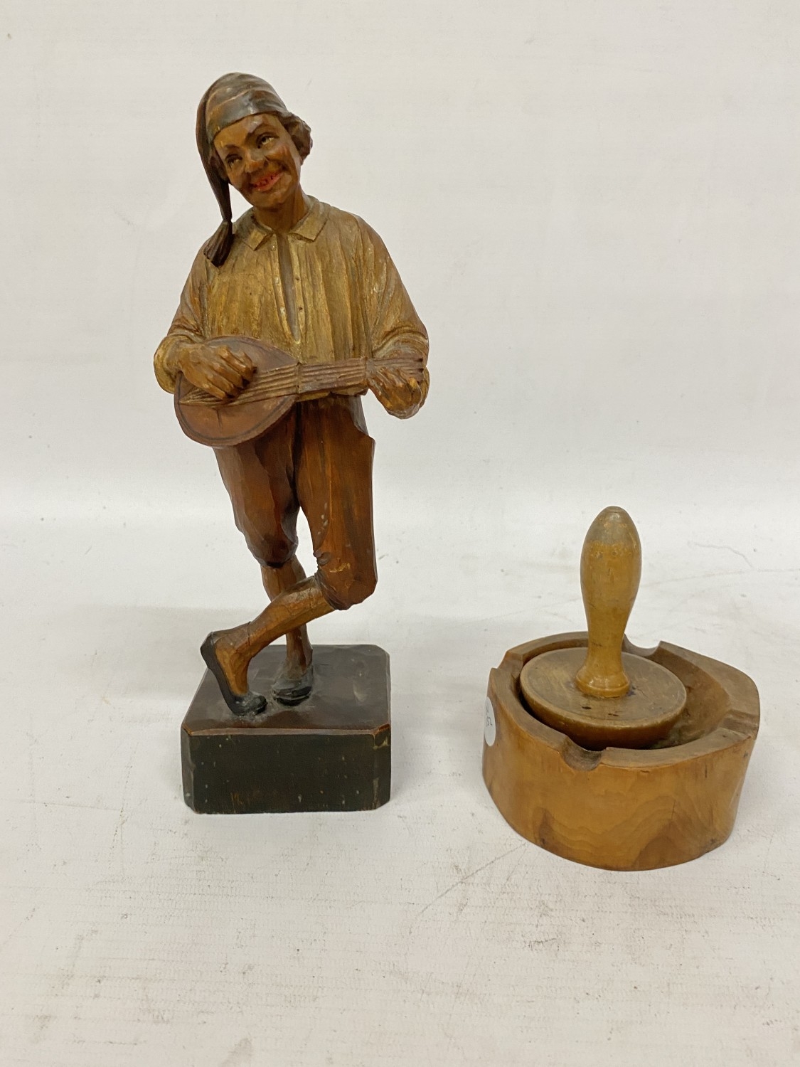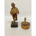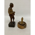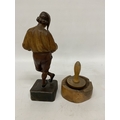 A VINTAGE HAND CARVED AND PAINTED FIGURE OF AN ITALIAN MUSICIAN, HEIGHT 26CM, PLUS A WOODEN BOBBIN AND BOWL