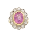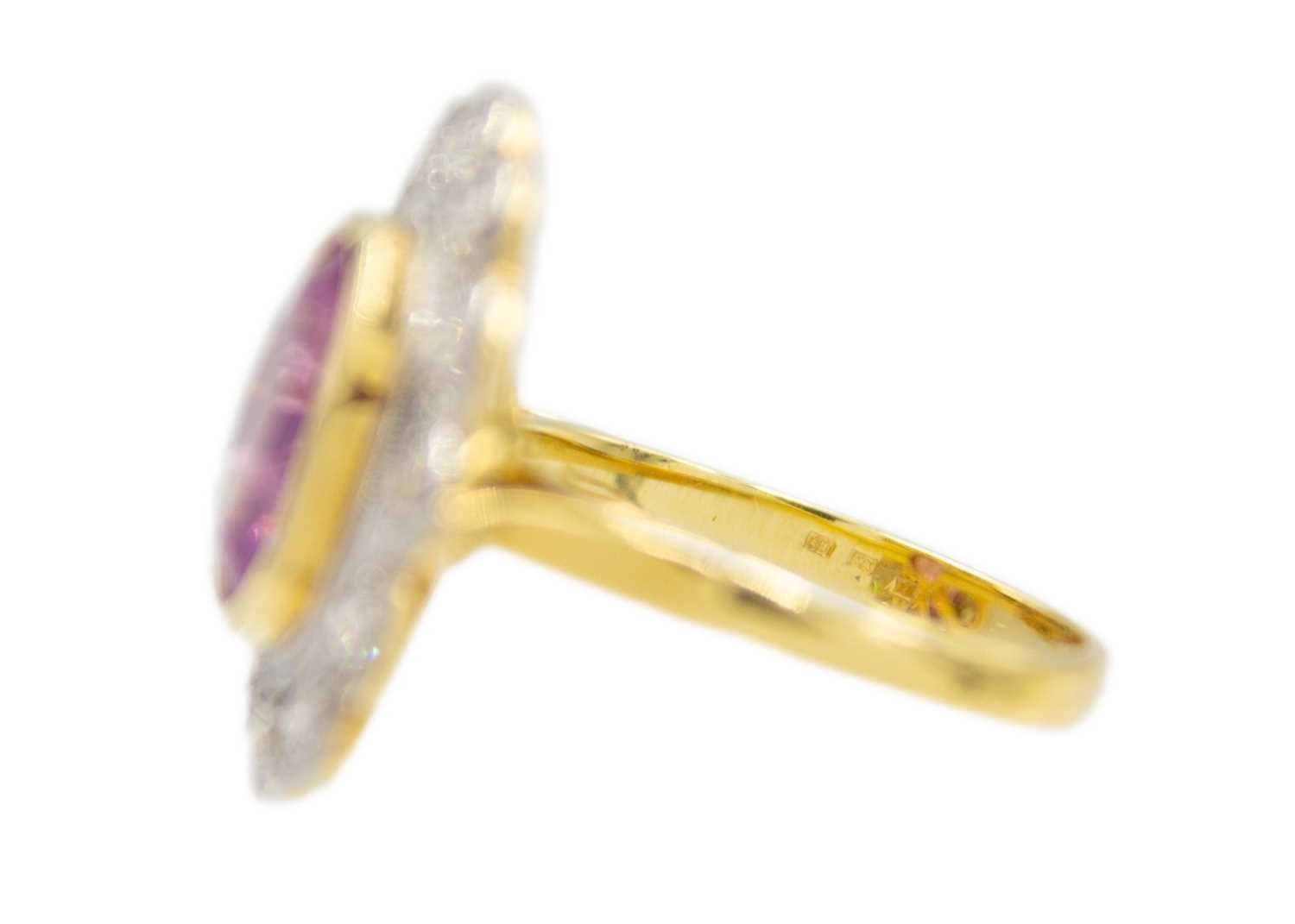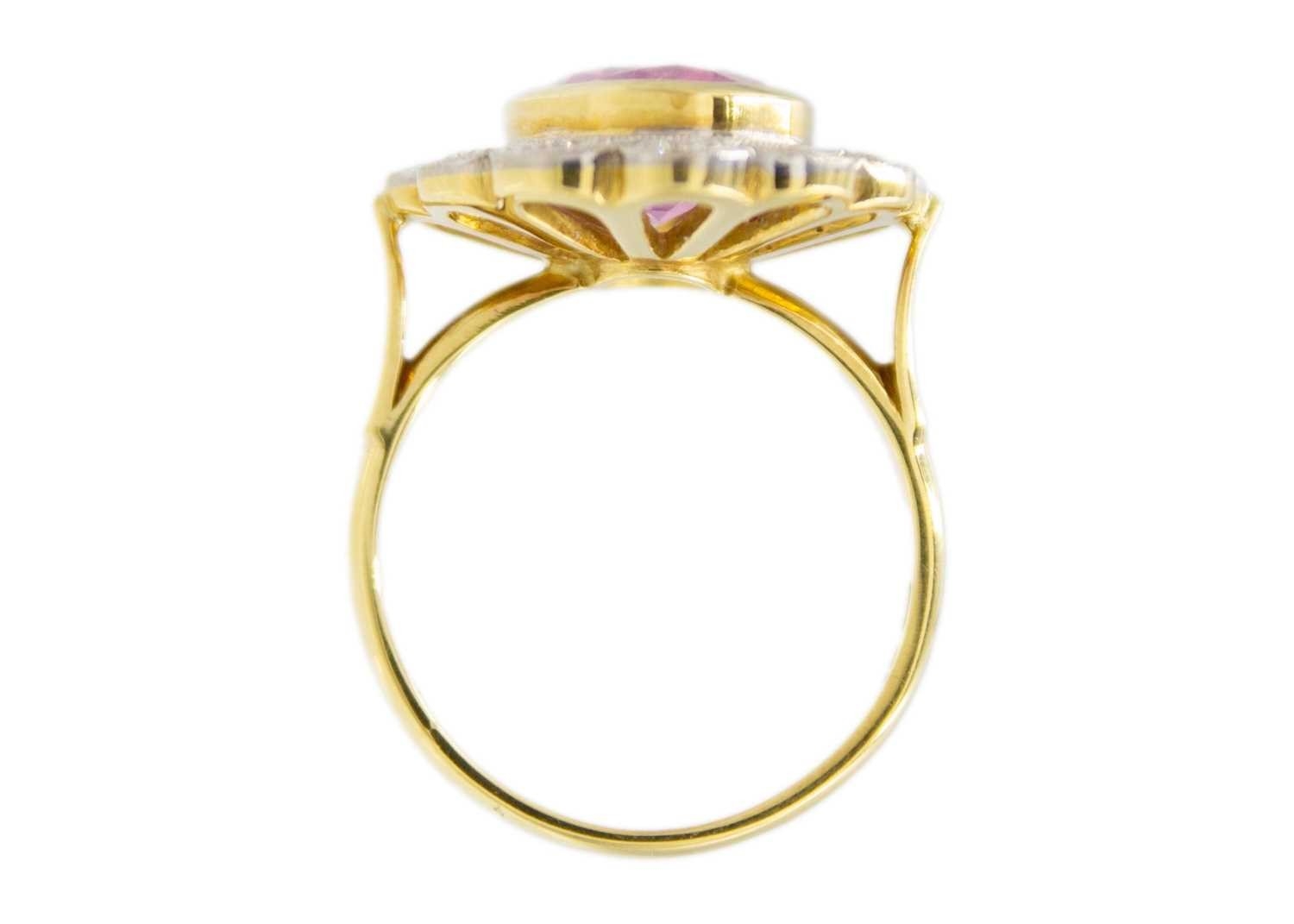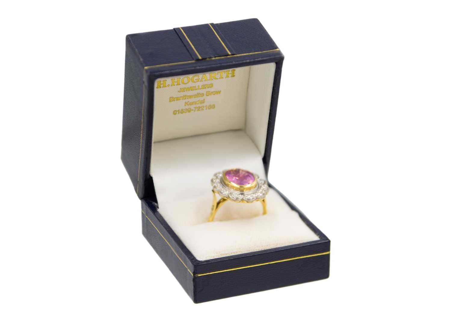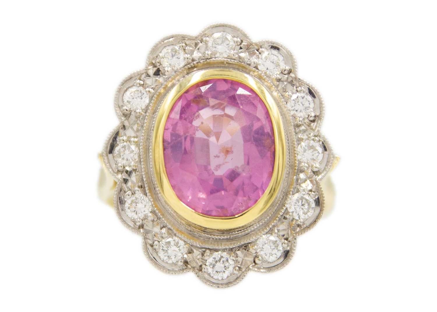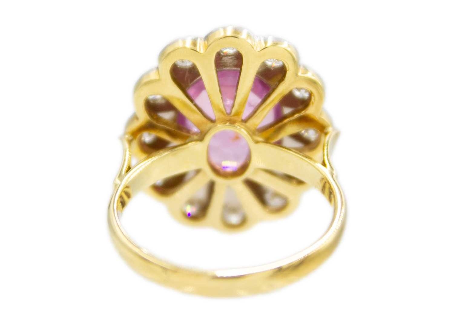 A fine pink spinel and diamond ring. The spinel is 4.5ct approx., surrounded by twelve round brilliant-cut white diamonds, diameter 2.2mm approx. each, the head size 2.2cm x 1.9cm, ring size P1/2, Birmingham hallmark, total weight 8.54g. With AnchorCert group SafeGuard valuation for insurance, dated 25/01/2018.