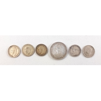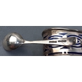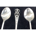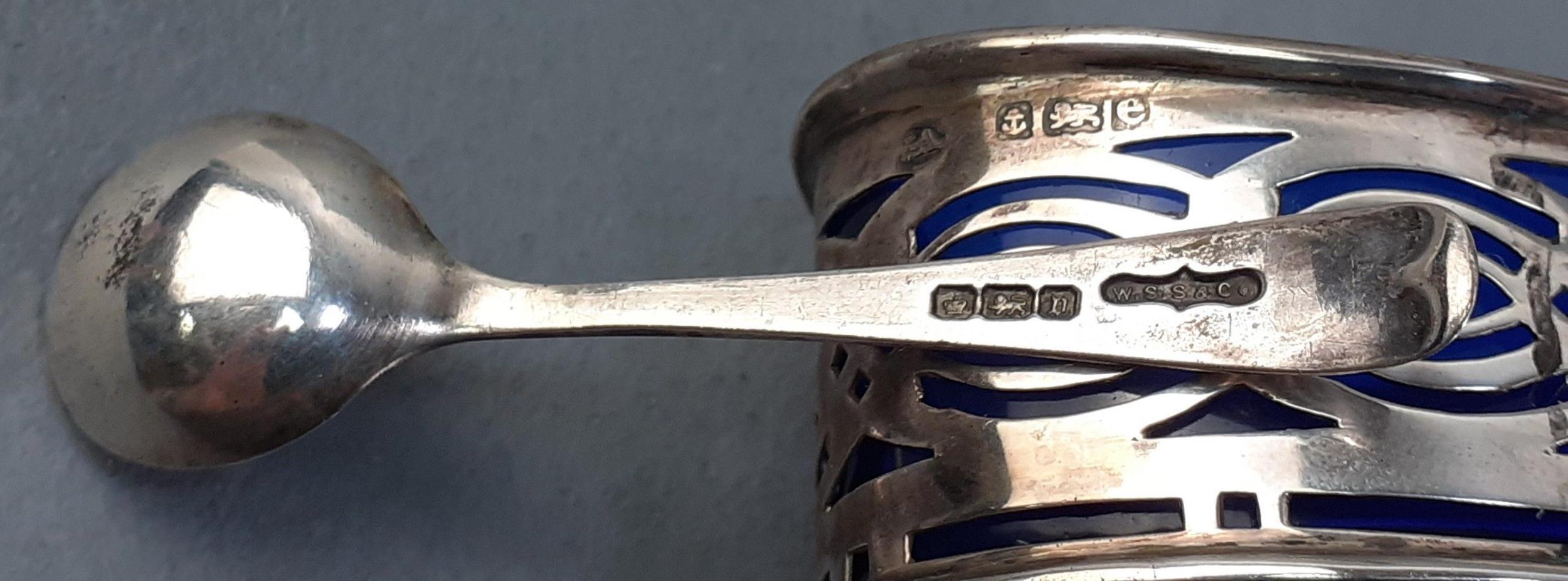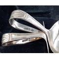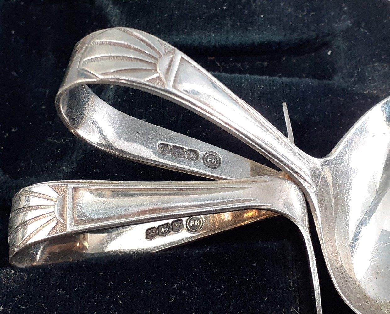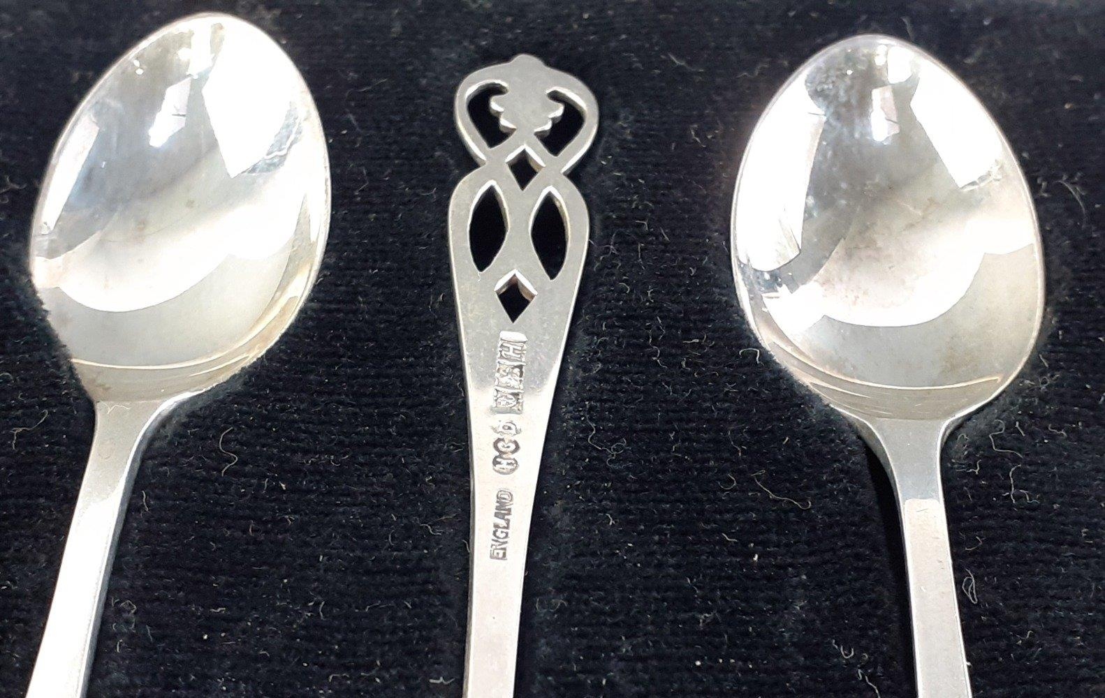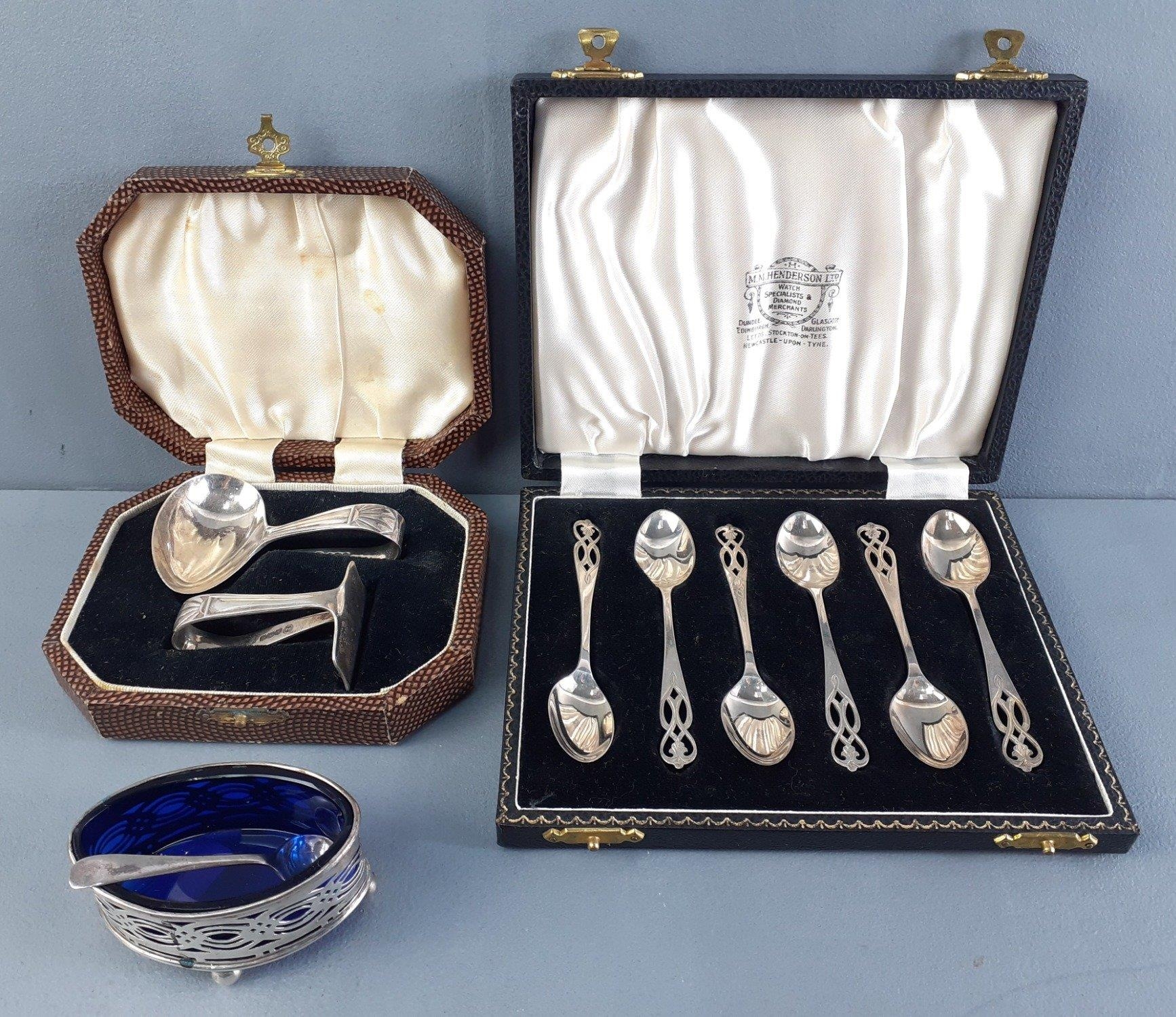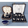 A hallmarked silver collection to include a boxed child's spoon and pusher (Sheffield 1963), a boxed set of 6 spoons (Birmingham 1957) and a small salt dish with spoon and Bristol liner (Birmingham 1904). Combined weight 94g approx.