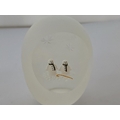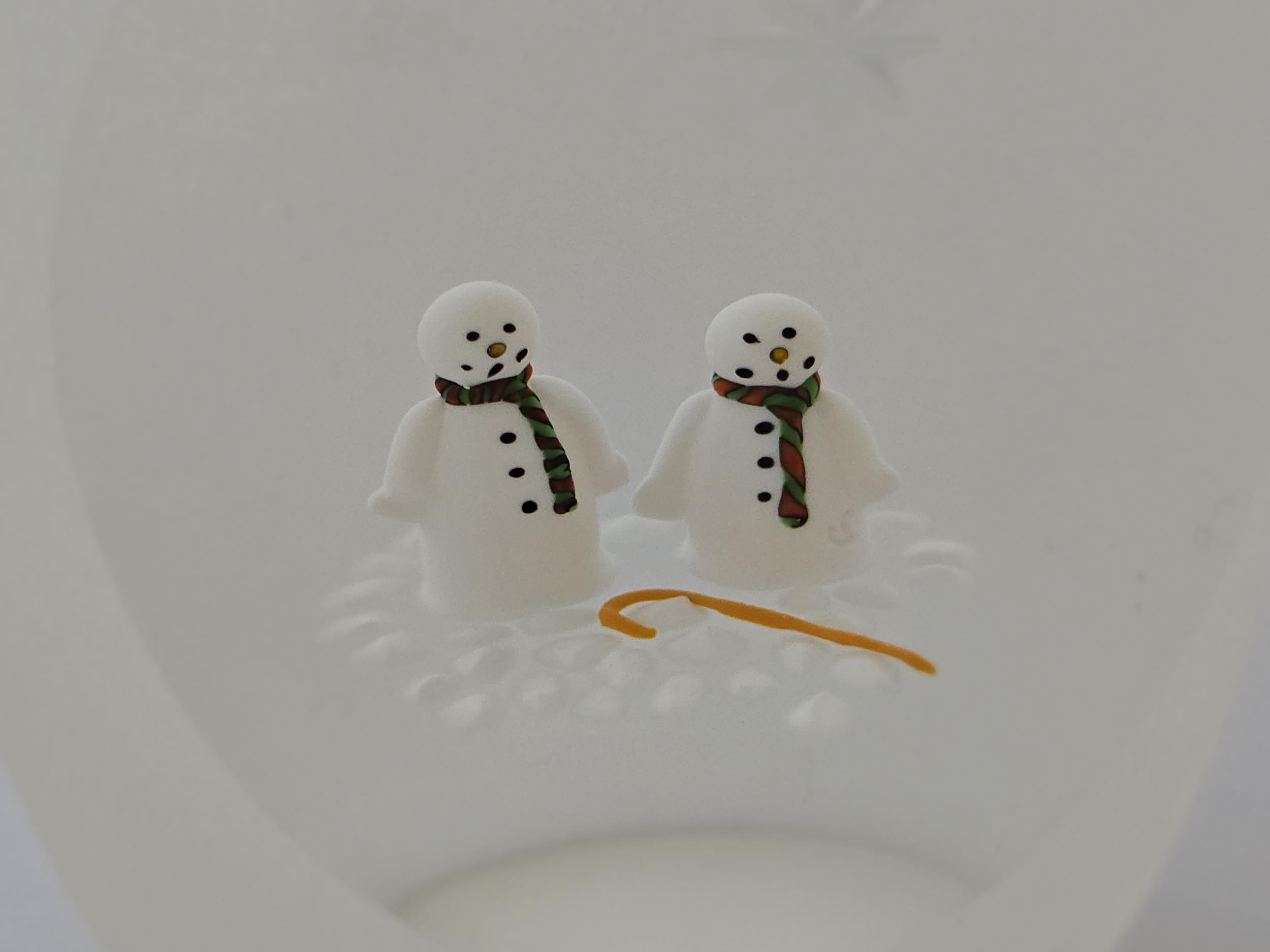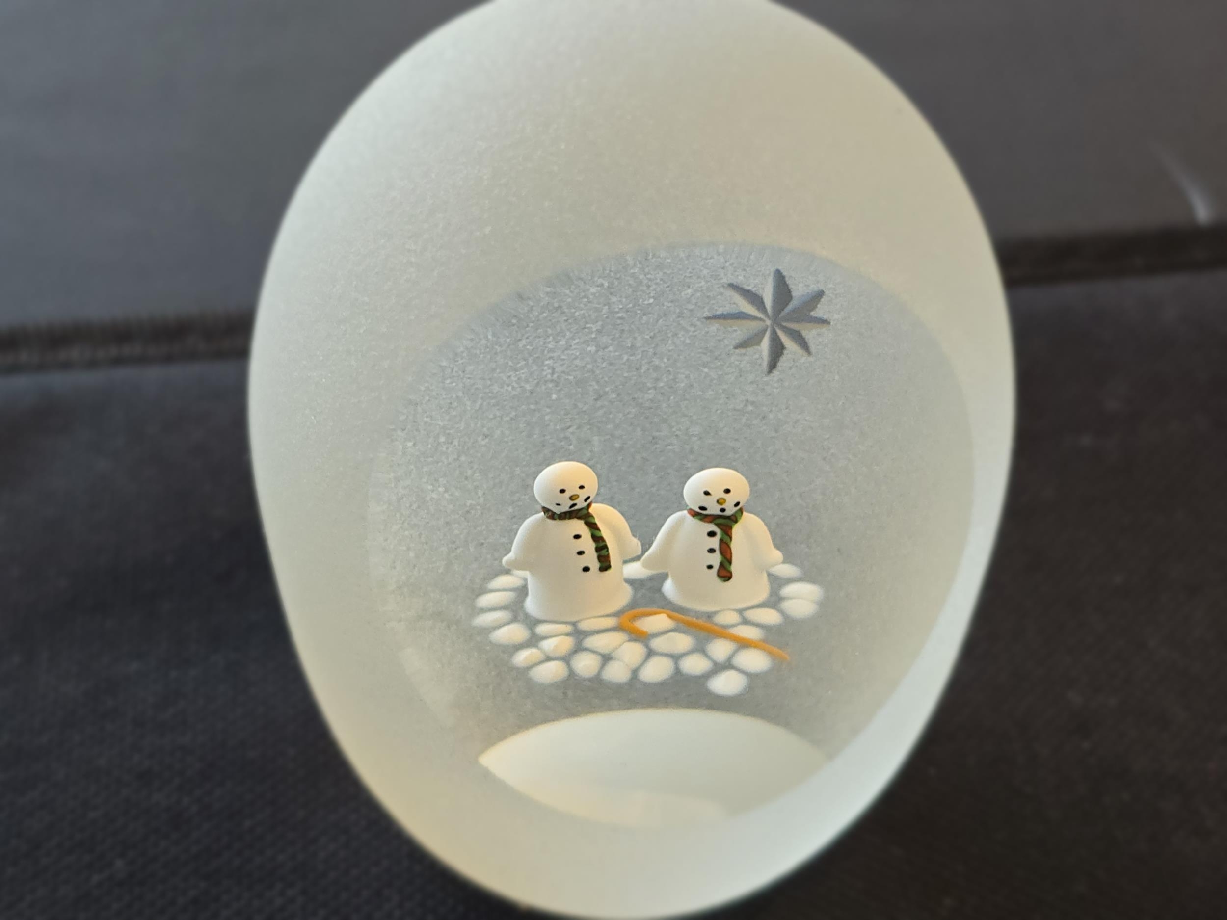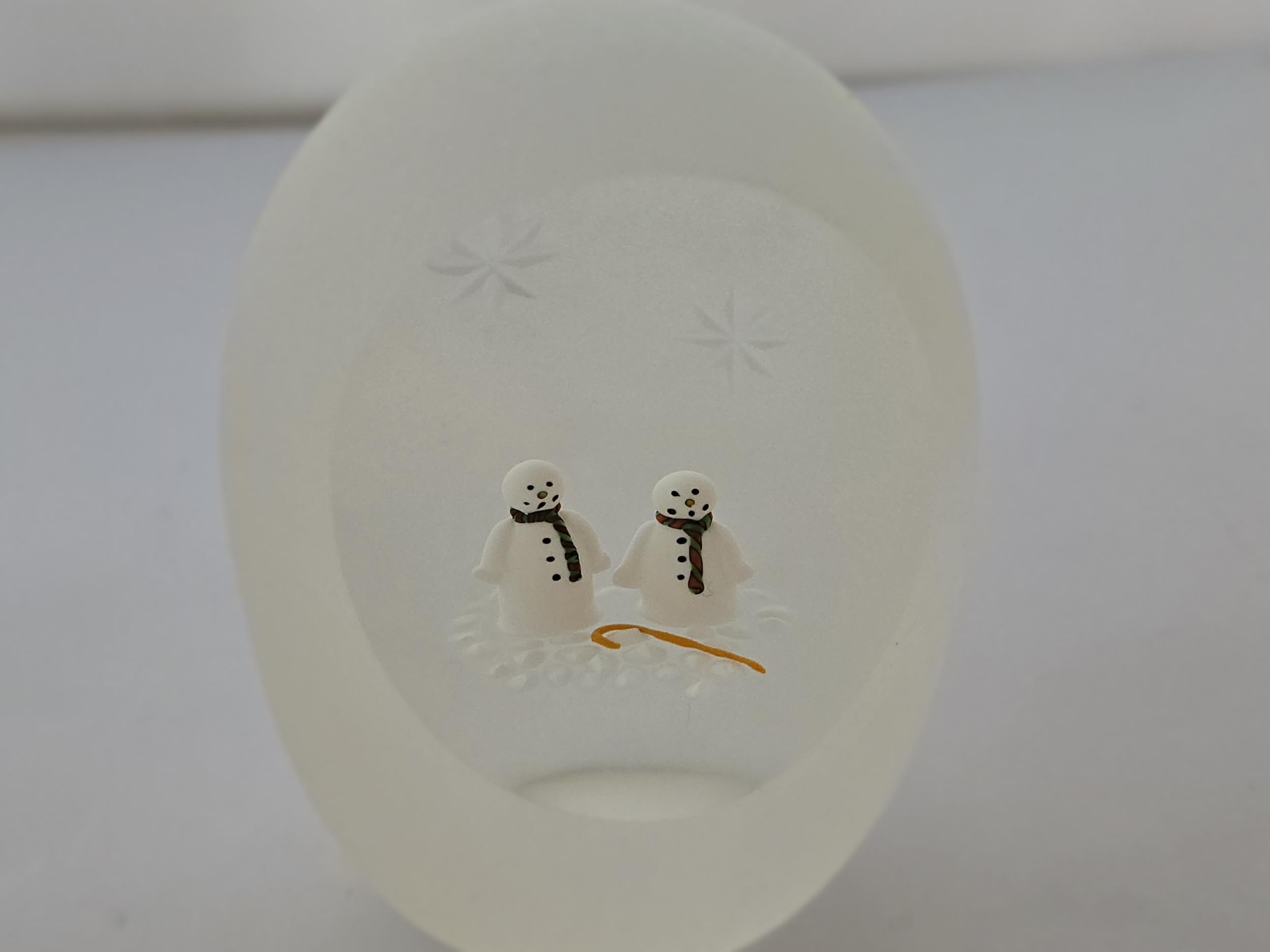 Perthshire Paperweight Xmas 1997 Xmas - a unique design with 2 snowmen wearing scarves on a clear ground. The outside of the wweight is frosted, but with 2 stars cut, and the large front facet is concave. Diam : 57mm or 2 1/4 ins, and height is 80mm or 2 1/8th inches