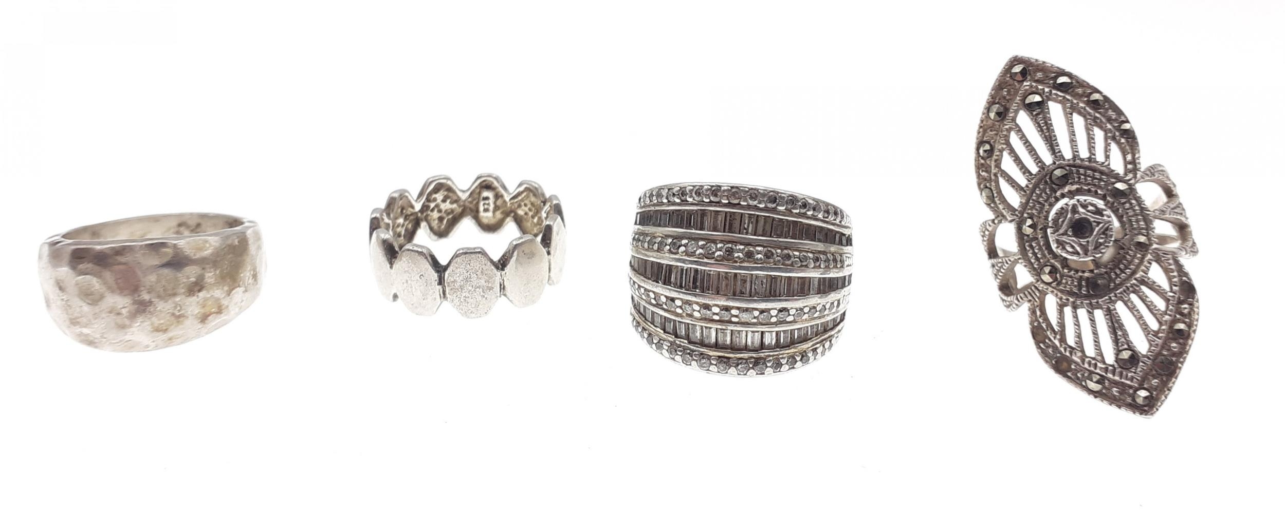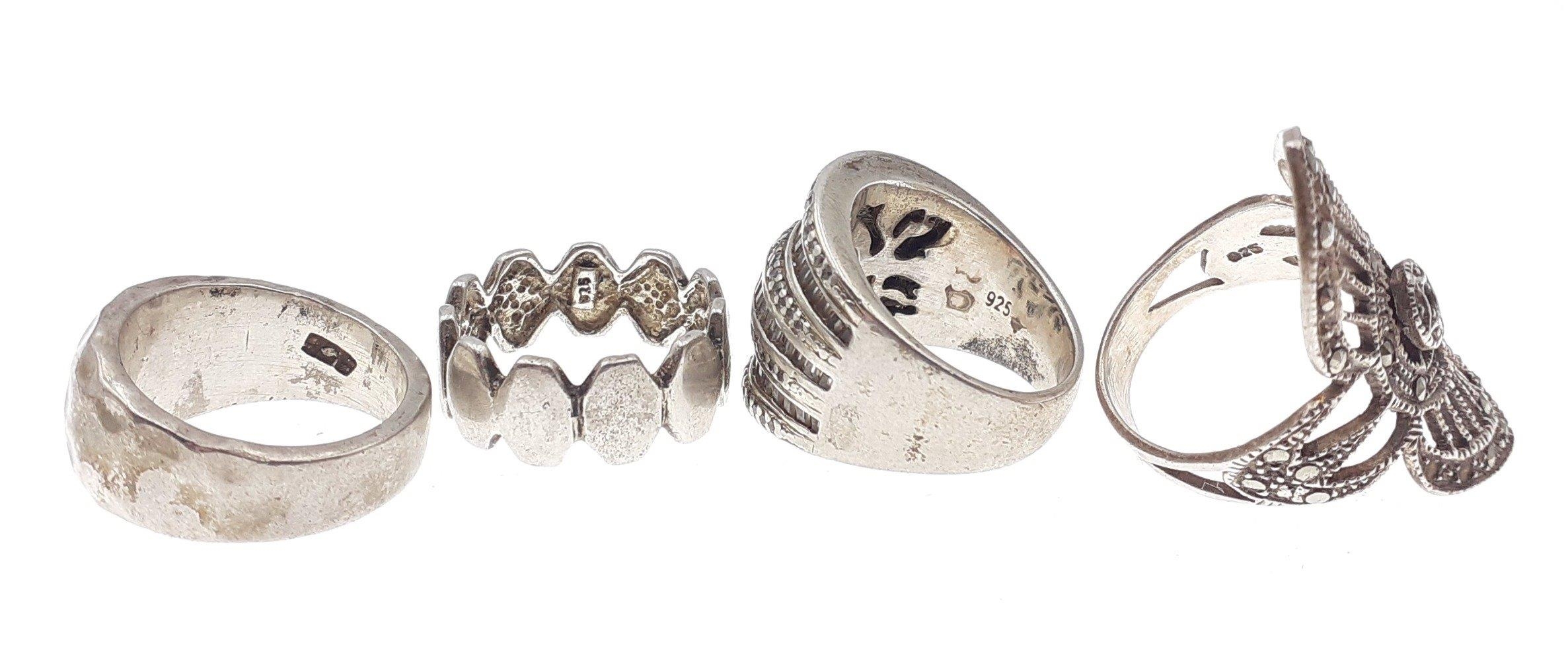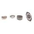 Four nice quality interesting silver rings. Gross weight 30g approx.