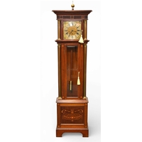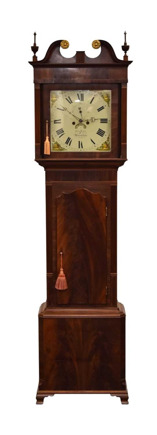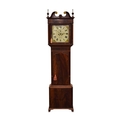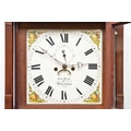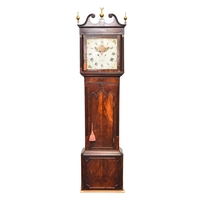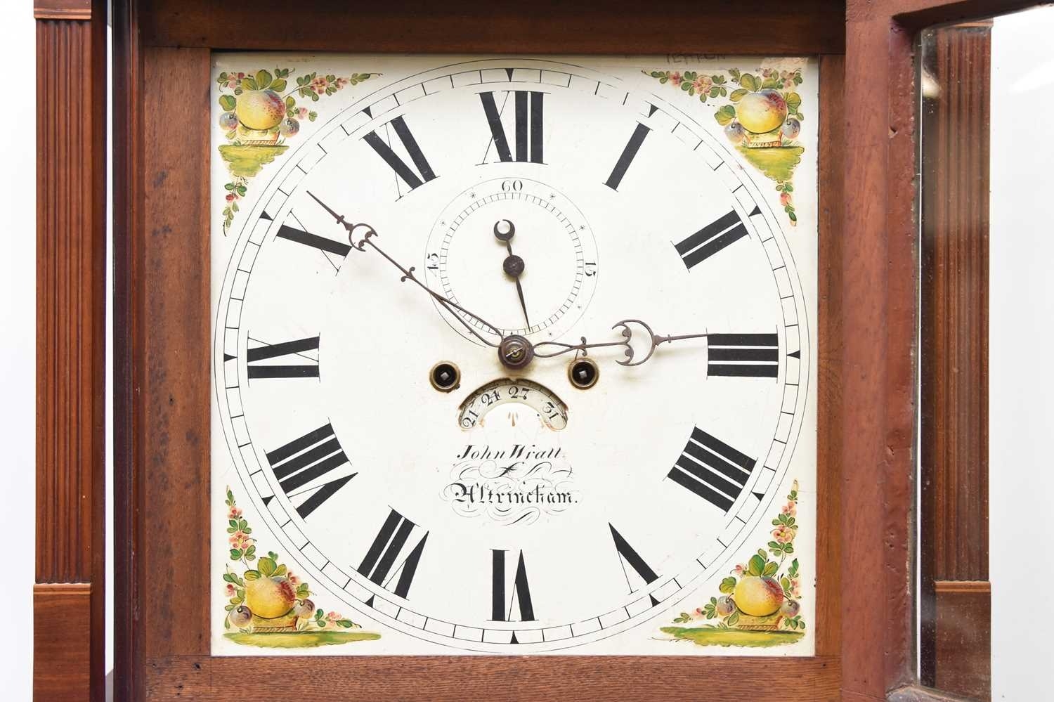A George III mahogany painted dial longcase clock The dial signed John Wyatt, Altrincham The hood with swan-neck pediment, brass finials and reeded columns, the trunk with arched door above a plain base box raised on bracket feet. The 14 inch painted dial with Roman chapter, subsidiary seconds dial and calendar aperture, the spandrels painted with fruits and flowers. The polished brass four-pillar eight-day movement striking on a bell. With two weights, pendulum and door key. 58cm wide x 27cm deep x 217cm high Footnote:John Wyatt is recorded as a journeyman to Sam Collier of Eccles, Lancashire, and then working in Altrincham, Cheshire, circa 1799-1828.