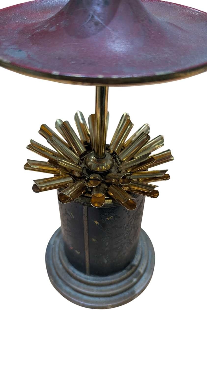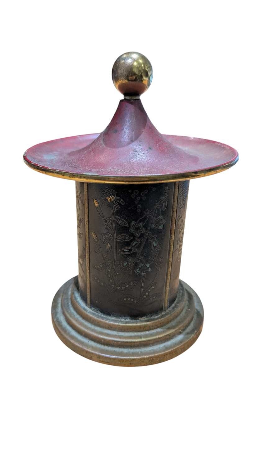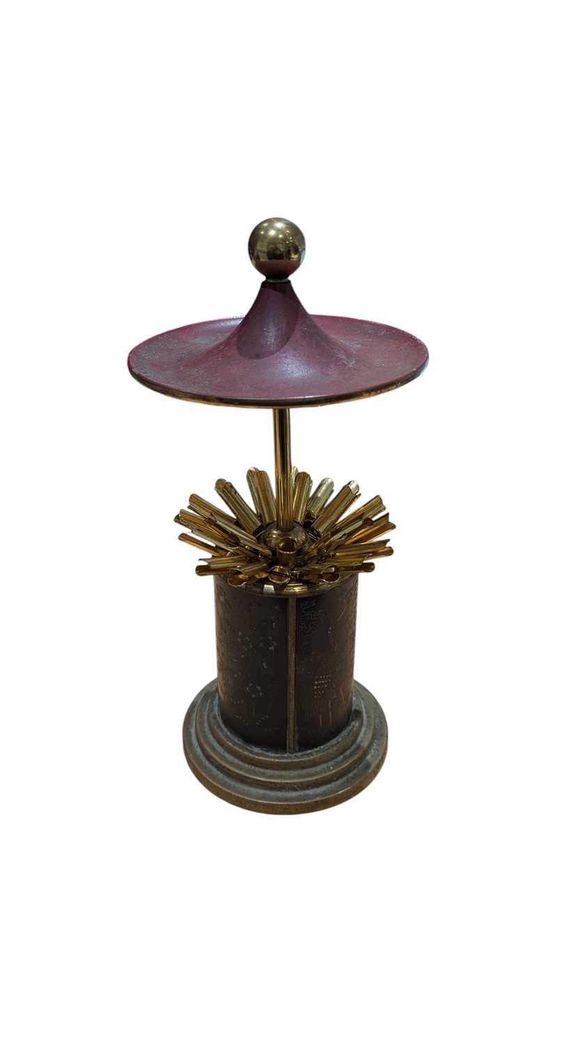 An early 20th century Japanese cigarette holder / dispenser. Having brass rounded stepped base, with floral and crane decoration to sides. Top lifts to reveal cigarette holders to interior.