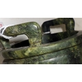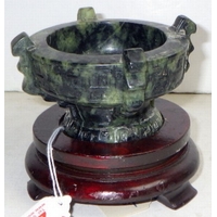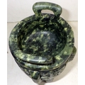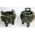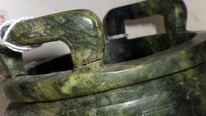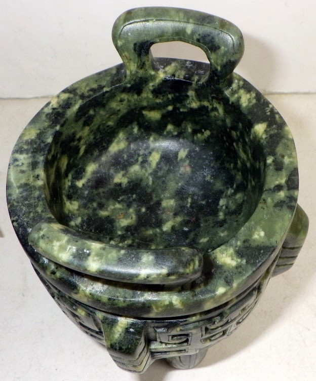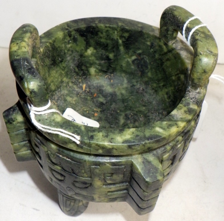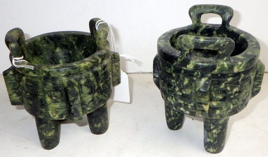 Two Oriental carved and polished stone bowls with handles, one with handle repaired (2)