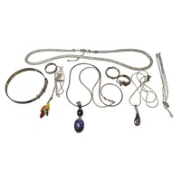 the pendant piece set with twelve approx. 0.10ct round brilliant cut medium blue sapphires, total carat weight approx. 1.20ct and four melee round brilliant cut cubic zirconias, stamped on the back of the pendant piece "925", the chain stamped "925", measuring approx. 50cm's long, approx. 10g gross, boxed