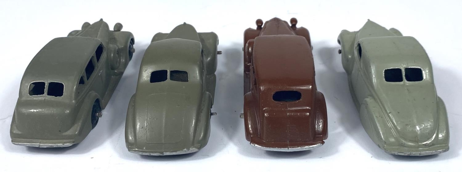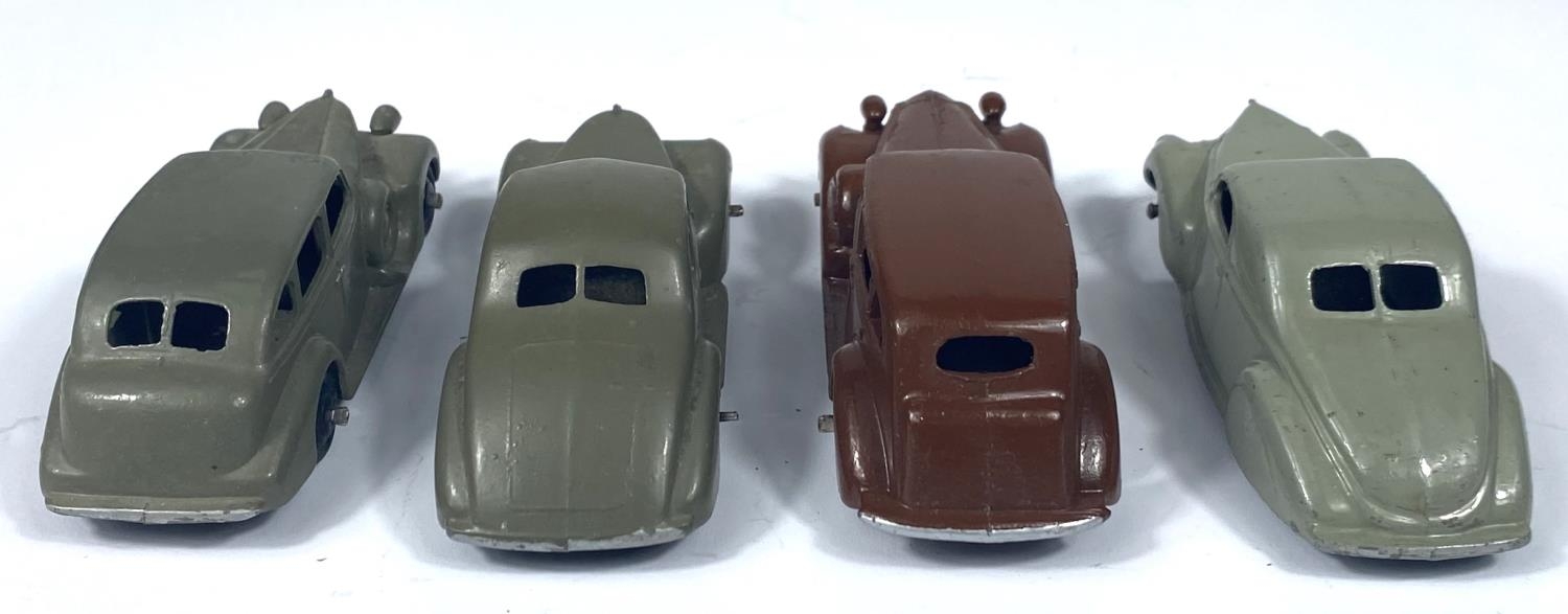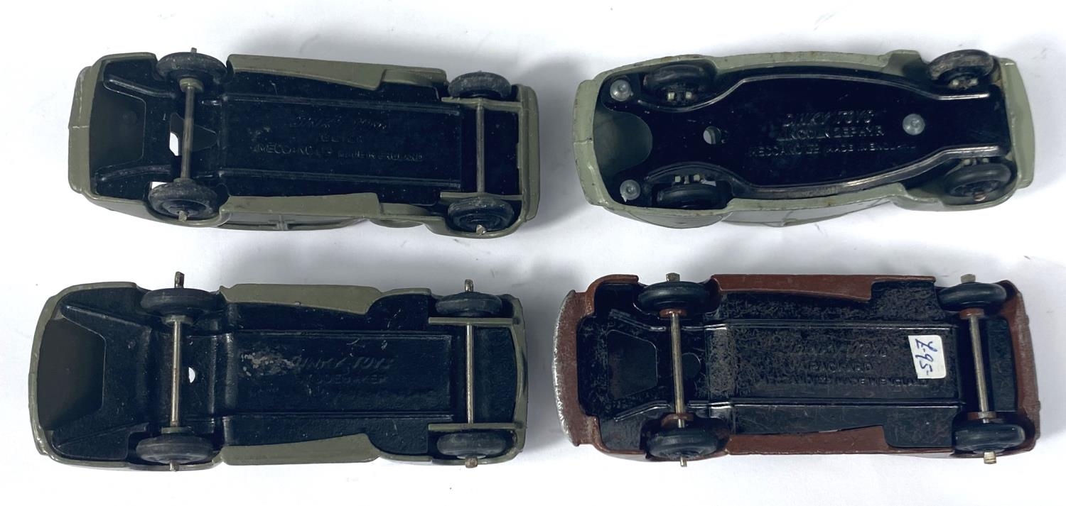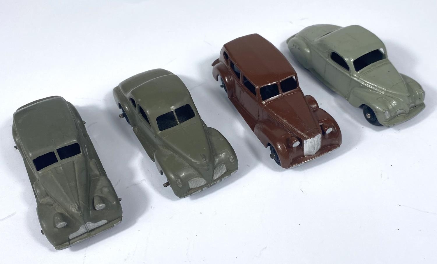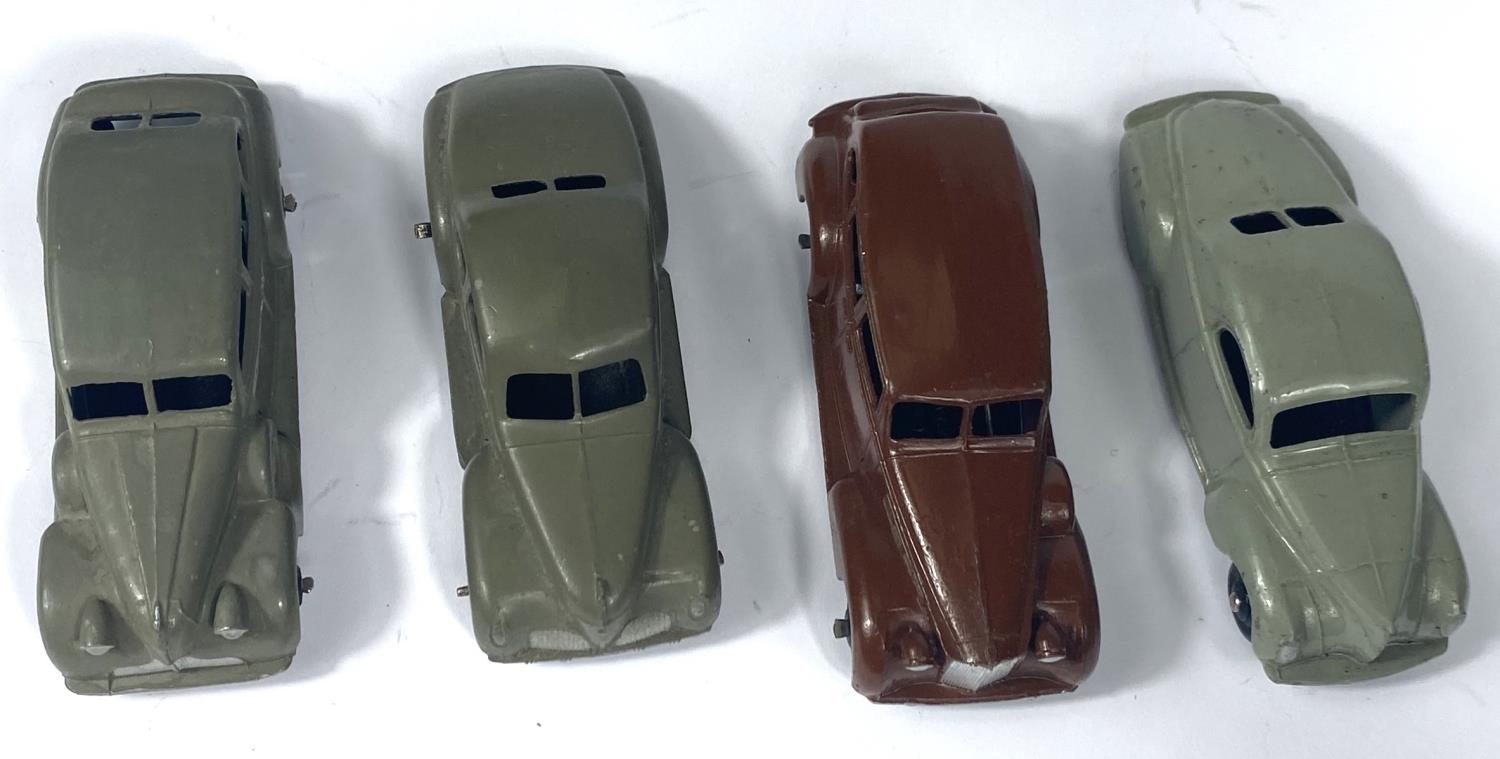 DINKY TOYS: 39C Lincoln Zephyr Coupe in grey; 39F Studebaker in grey; 39A Packard in brown and 39D a Buick in grey