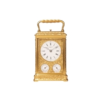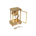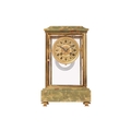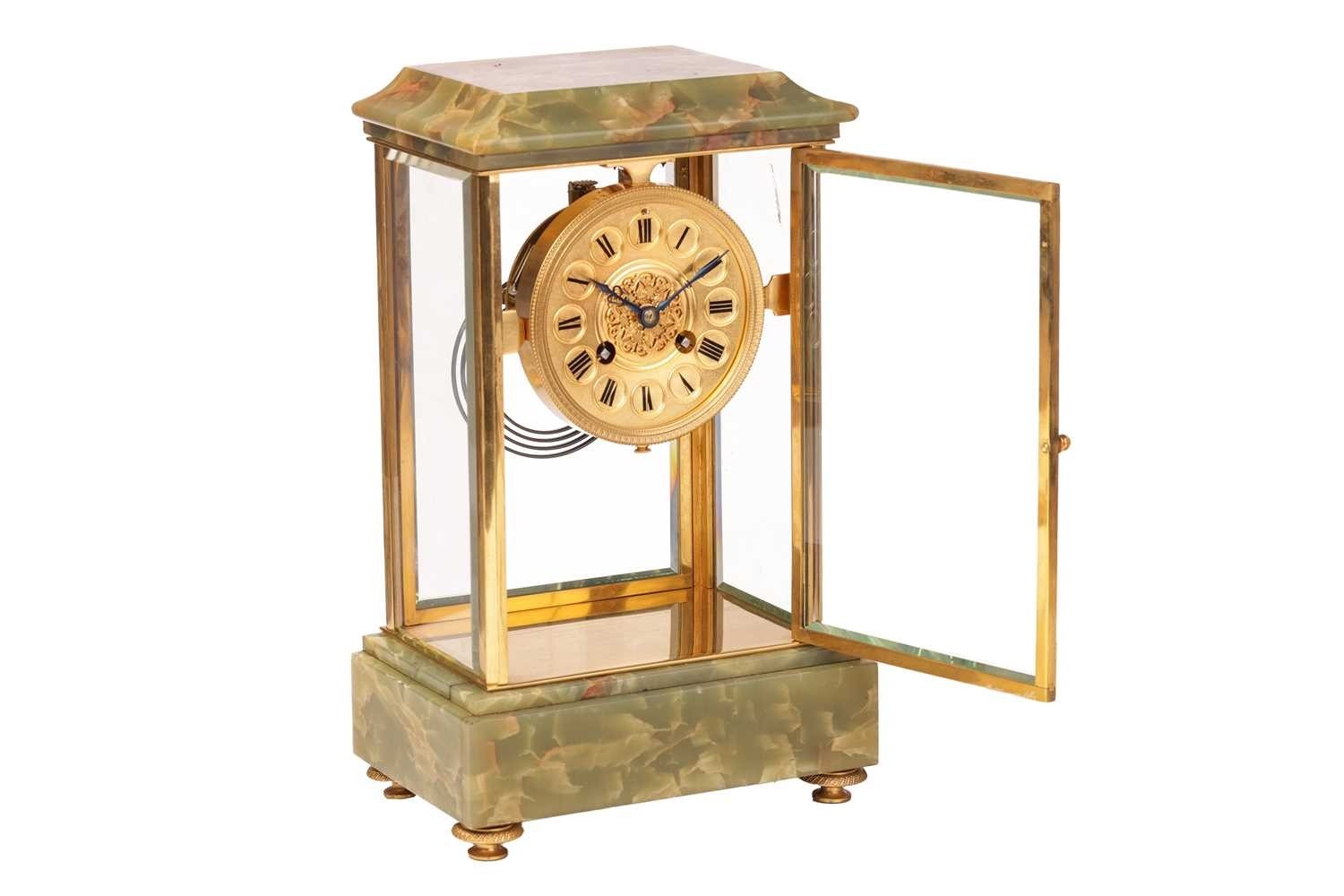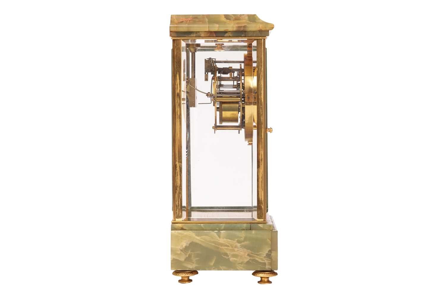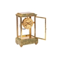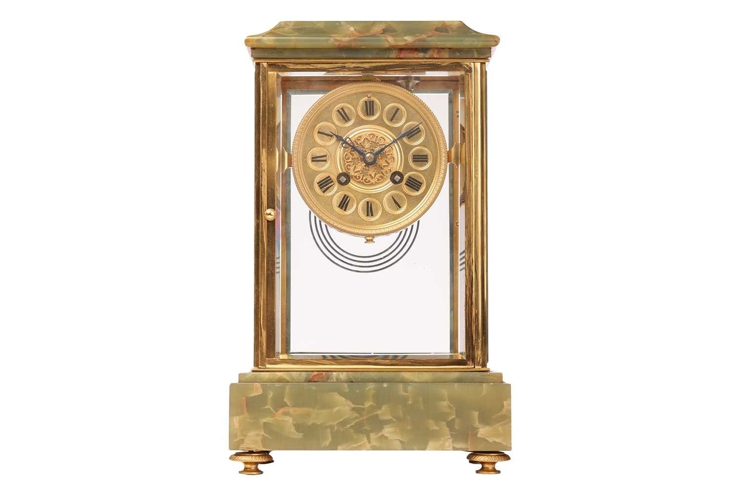 Samuel Marti, an Algerian onyx and gilt brass four glass mantle clock of architectural form with brass "Roman" dial with fretted "Arabesque" centre, the movement chiming the hours and half as a passing strike on a coil gong,32 cm overall height. Chiming as expected No pendulum Lenses ok The case a little loose at the joints, needs tightening up.