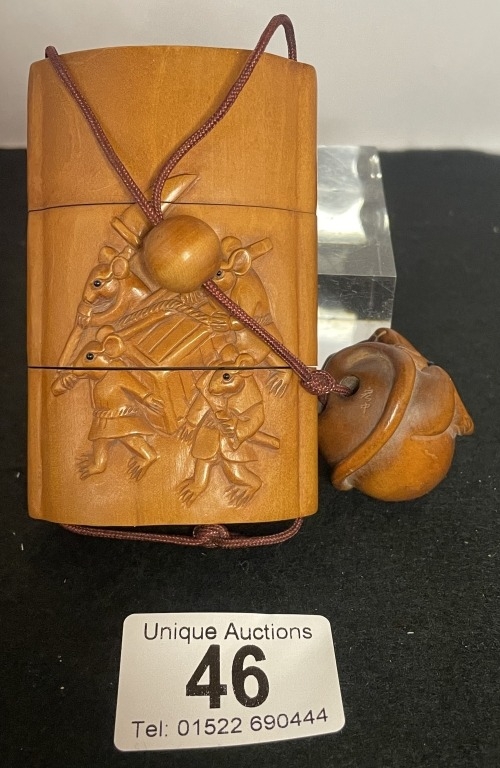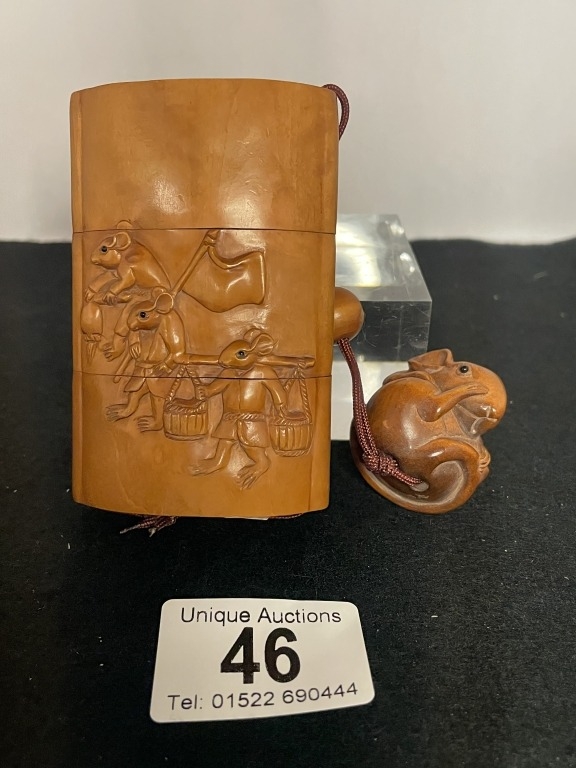 A Japanese carved hardwood inro featuring mice with mouse ne...