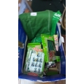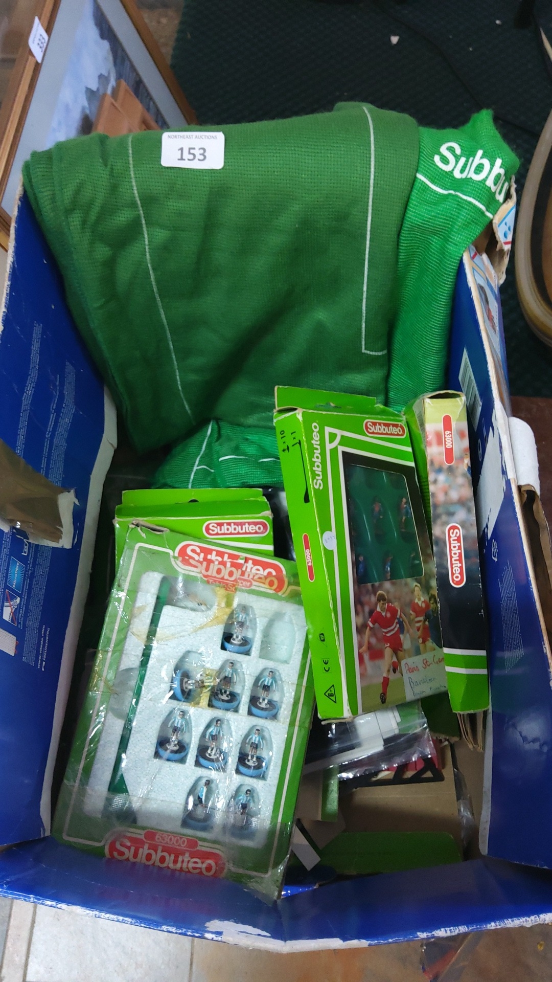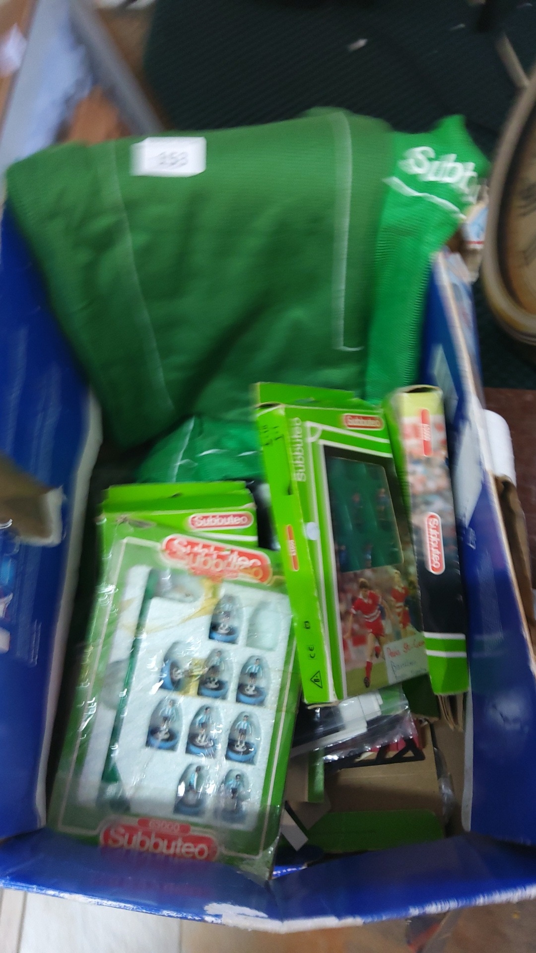Subbuteo table football group including a green cloth playing pitch and various boxed accessories, among them team sets in retail packaging; contained within a blue carton.
